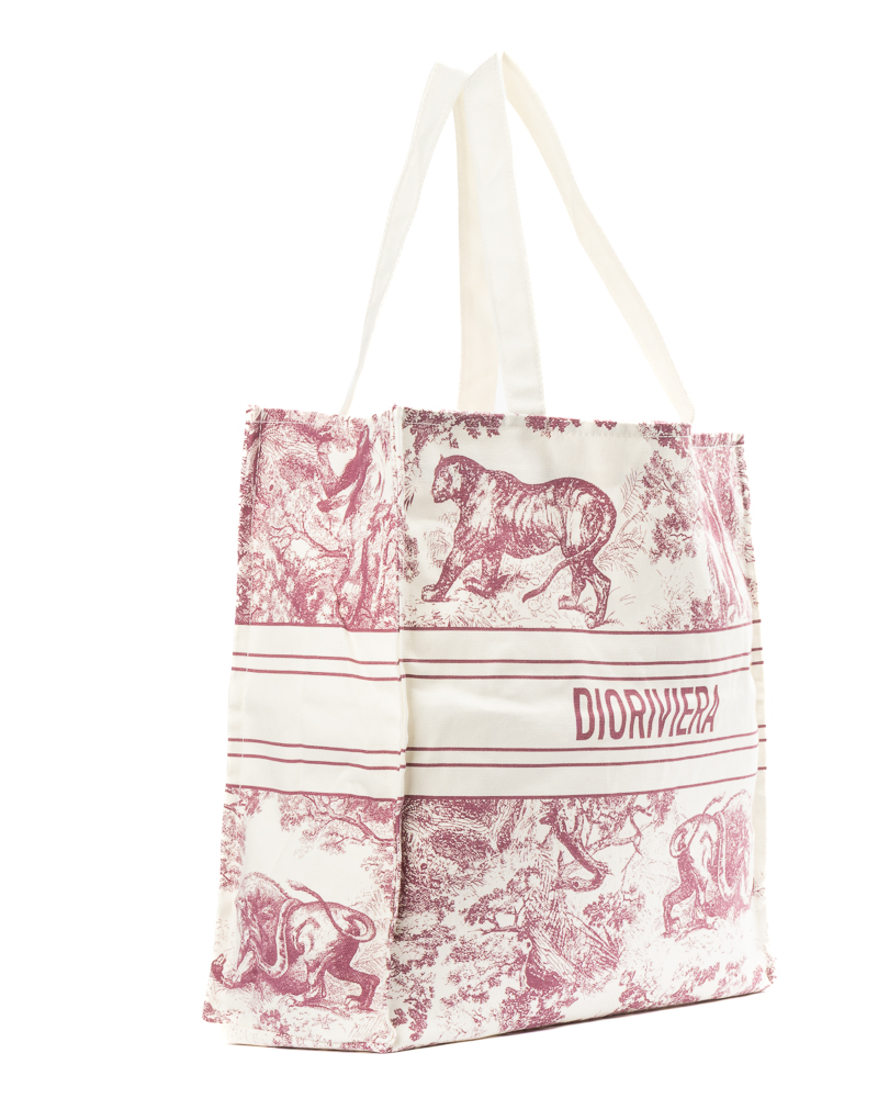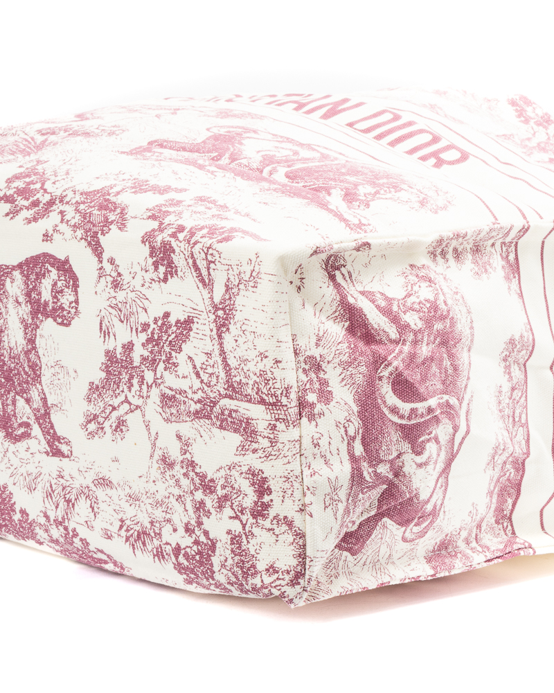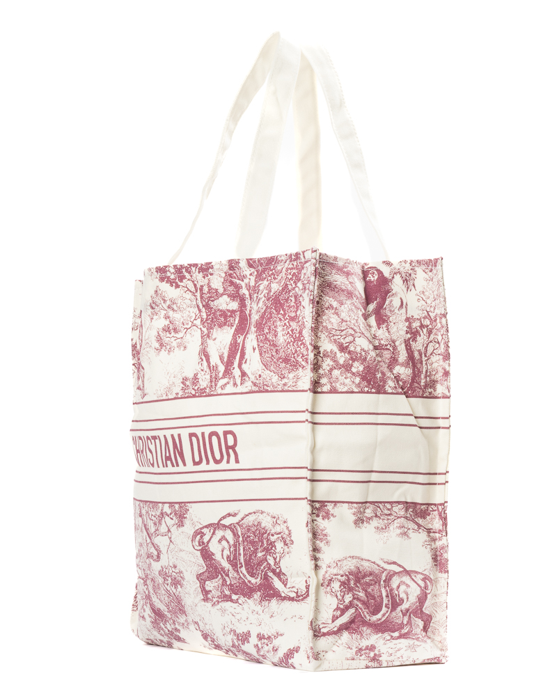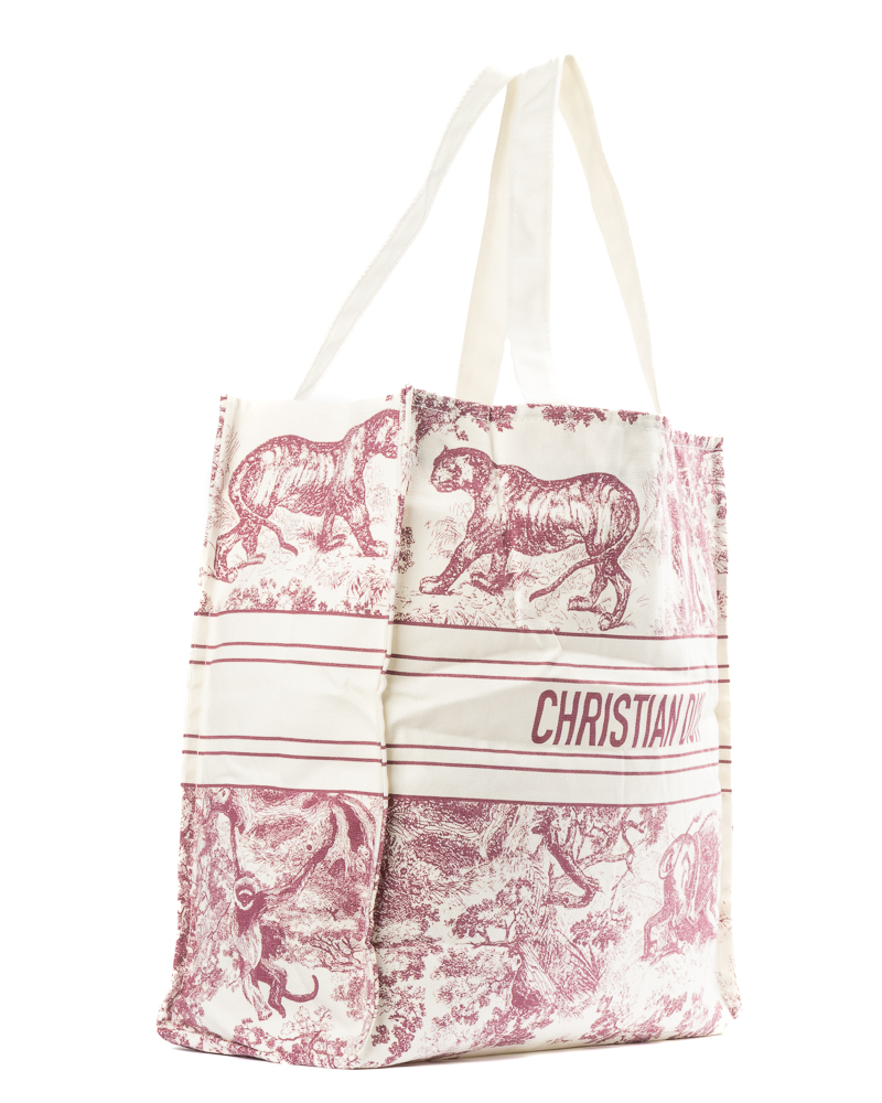 Borsa firmata Dior, modello tote, realizzato in cotone bianco e bordeaux nella fantasia Toile De Jouy nella colorazione bianco e bordeaux. Non è dotato di nessuna chiusura, internamente rivestito in tessuto bianco, la borsa è abbastanza capiente. Munito di doppio manico in cotone bianco, per una comoda portata a mano. L’articolo si presenta in condizioni pari al nuovo.