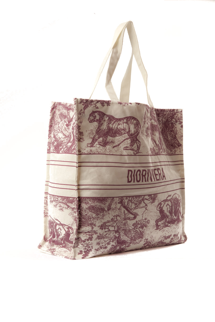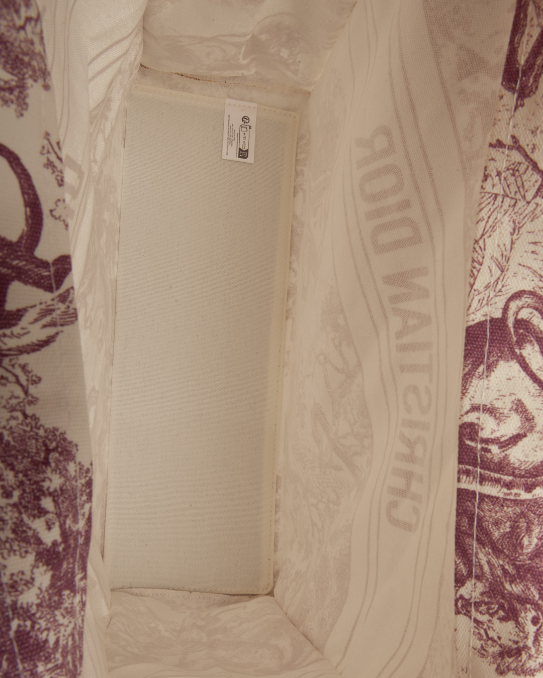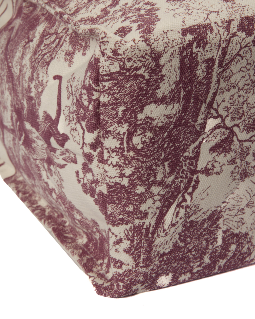 Borsa firmata Dior, modello tote, realizzata in tessuto bianco con la classica fantasia fantasia Jacquard Toile de Jouy bordeuax. Non è dotata di nessuna chiusura, internamente rivestita in tela bianca, la borsa è abbastanza capiente. Munito di doppio manico in tessuto, per una comoda portata a mano o a spalla. L’articolo si presenta in buone condizioni.