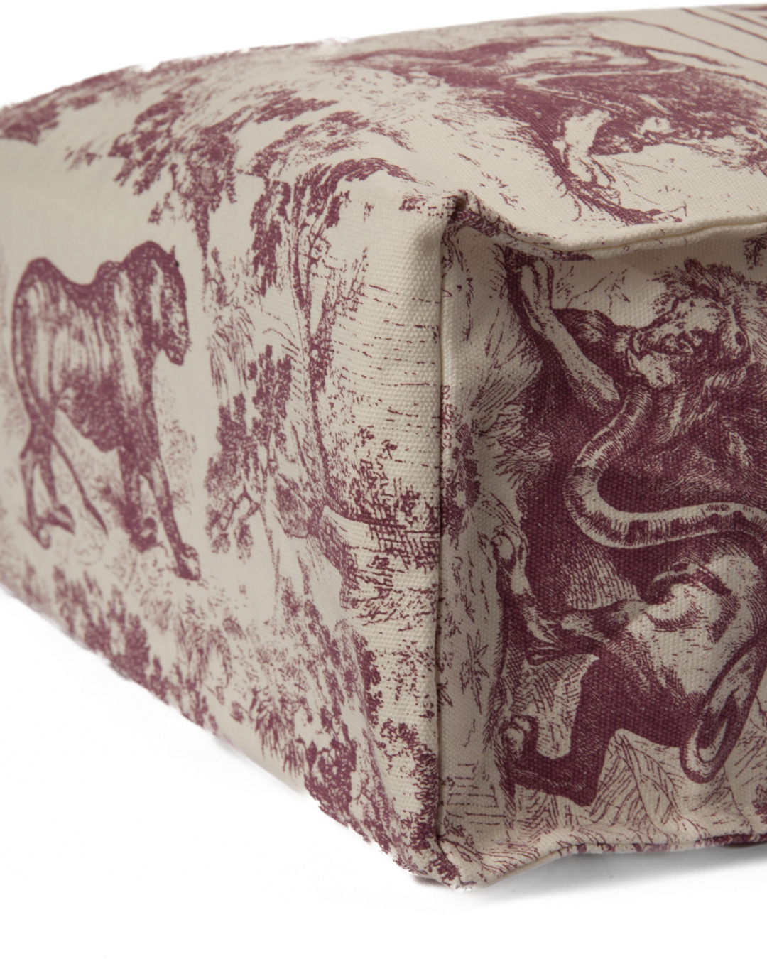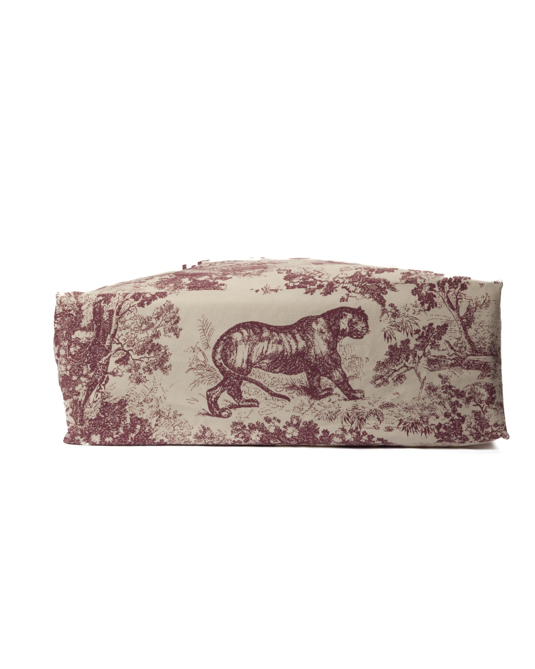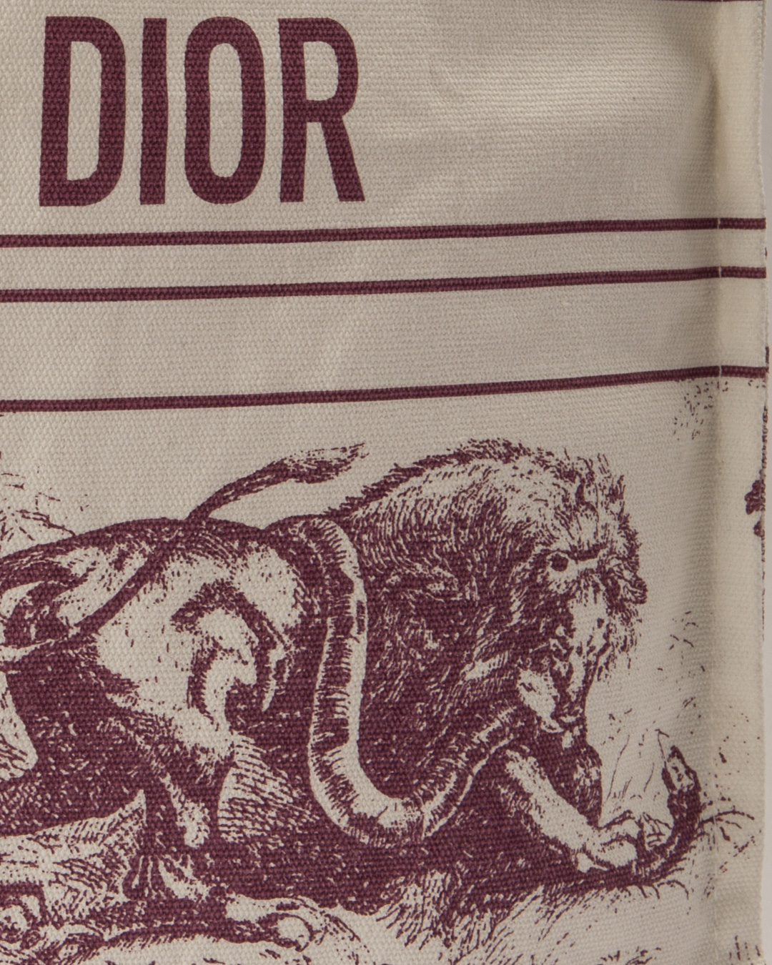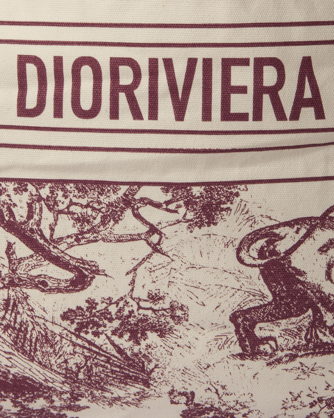 Borsa firmata Dior, modello tote, realizzata in tessuto bianco con la classica fantasia fantasia Jacquard Toile de Jouy bordeuax. Non è dotata di nessuna chiusura, internamente rivestita in tela bianca, la borsa è abbastanza capiente. Munito di doppio manico in tessuto, per una comoda portata a mano o a spalla. L’articolo si presenta in buone condizioni.
