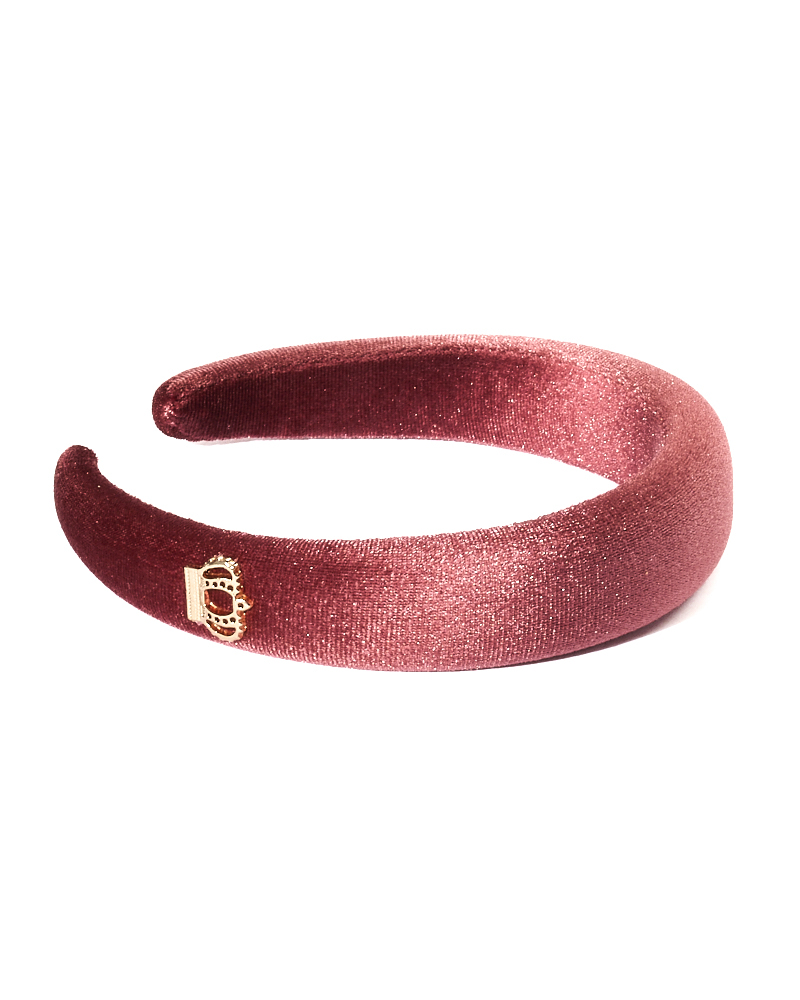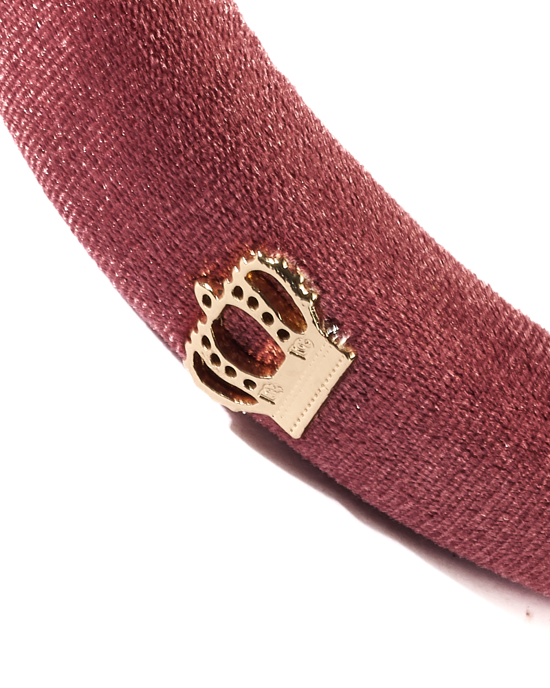 Cerchietto firmato Dolce & Gabbana, modello Gioiello, realizzato in velluto rosa, arricchito dal dettaglio coroncina sul lato. L’articolo si presenta in condizioni pari al nuovo.
