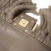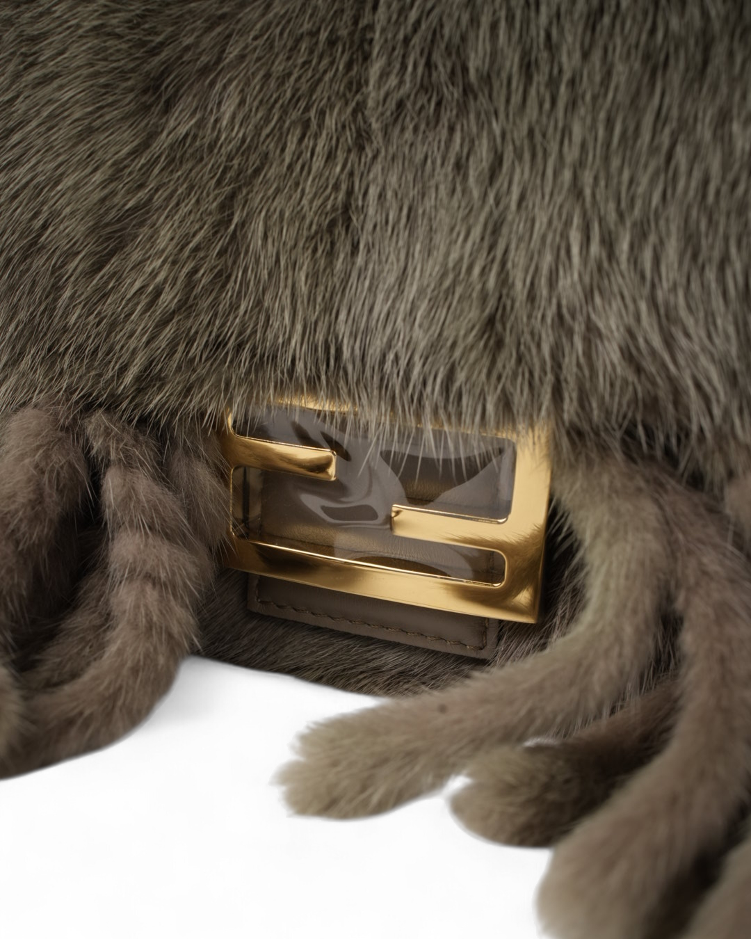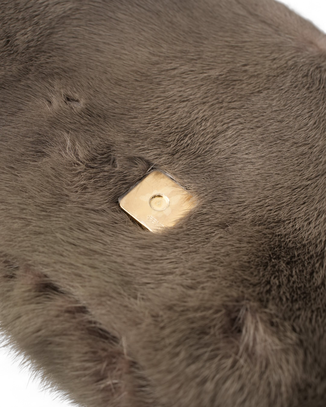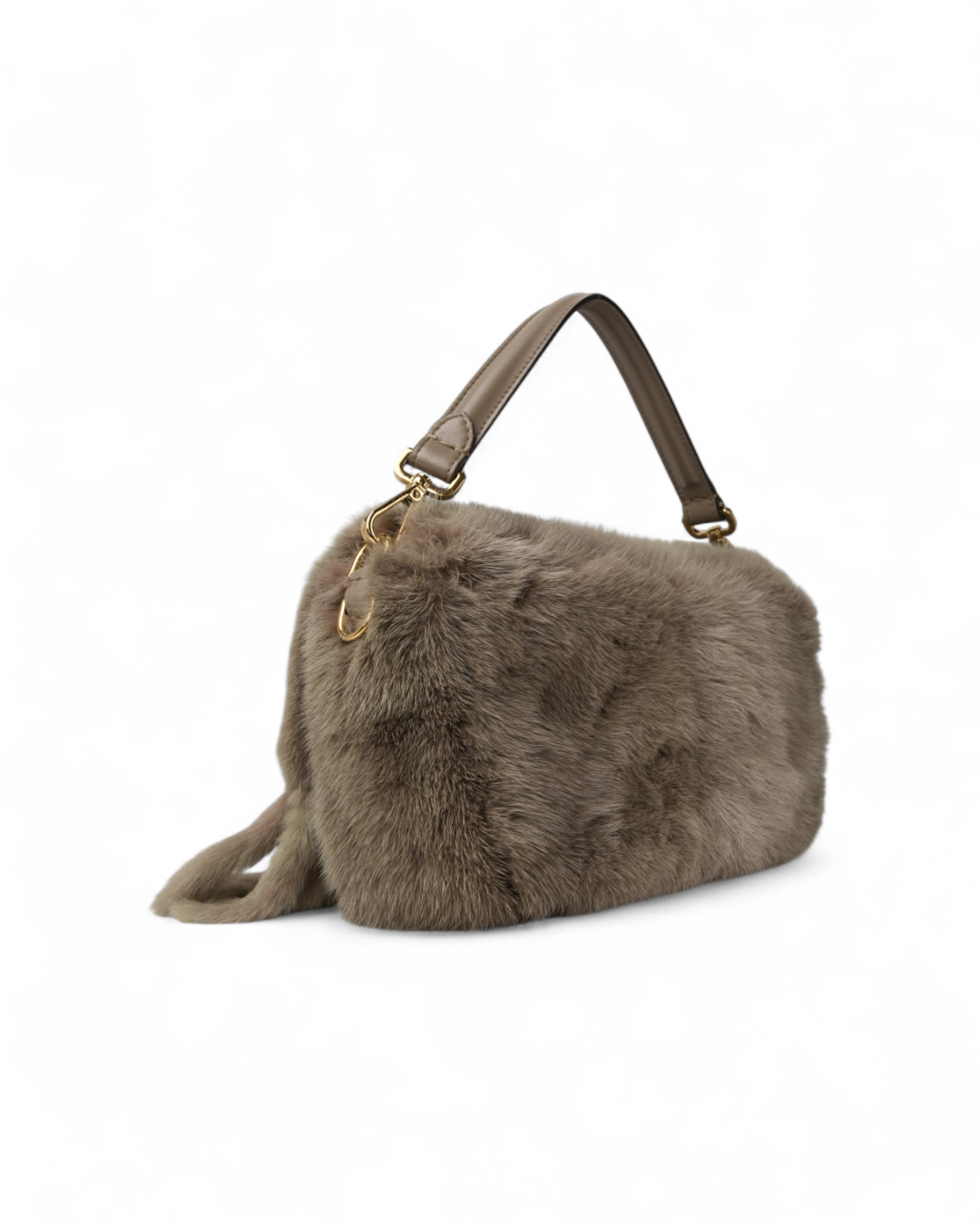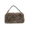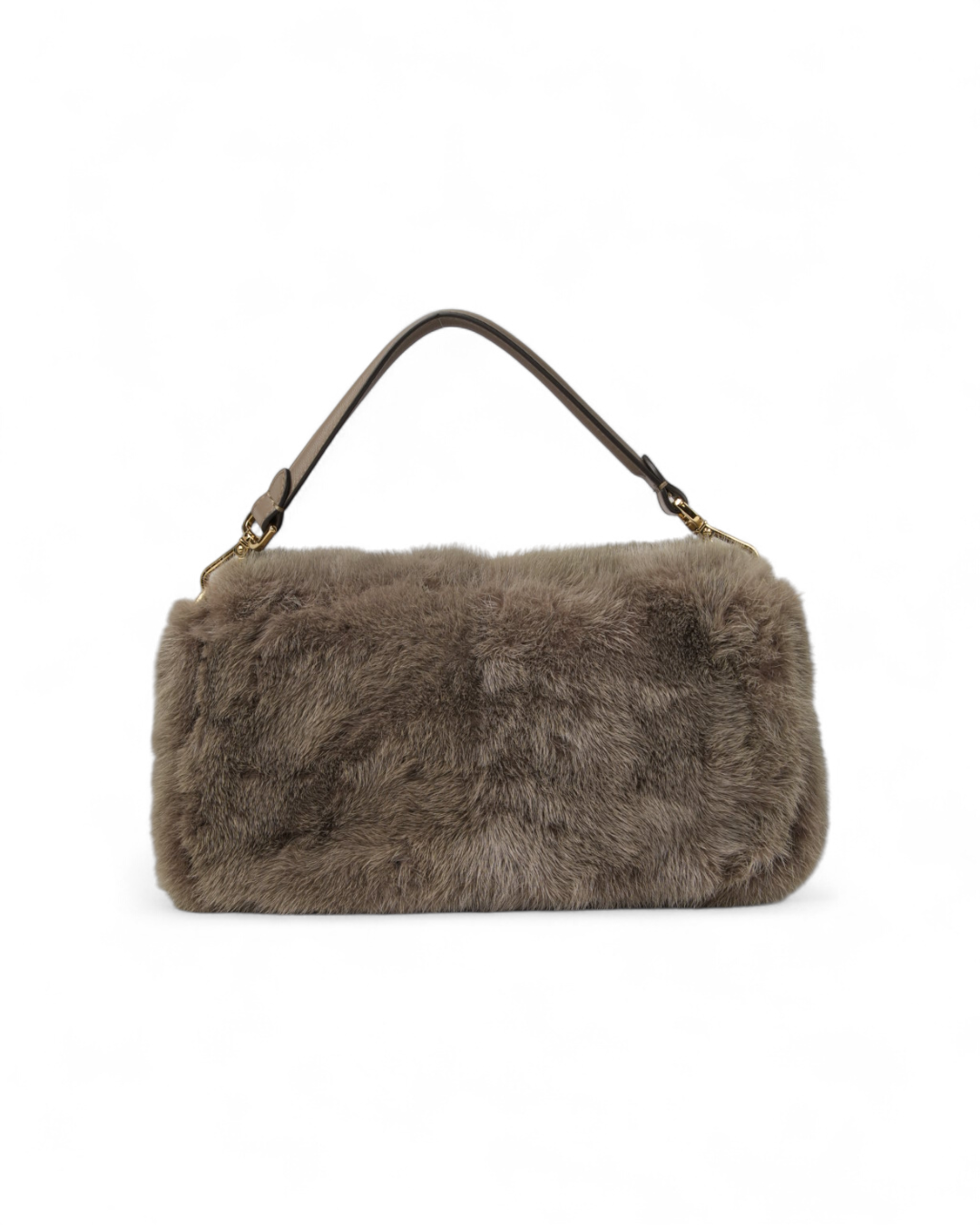 Borsa firmata Fendi, modello Baguette nella misura medium, realizzata in visone tortora con hardware dorato. Dotata di una patta con classico logo del brand “FF” con chiusura calamitata, internamente rivestita in pelle liscia marrone con comoda tasca, la borsa è abbastanza capiente. Munita di una tracolla rimovibile in pelle, per una comoda portata a spalla o a tracolla. L’articolo si presenta in condizioni pari al nuovo.
