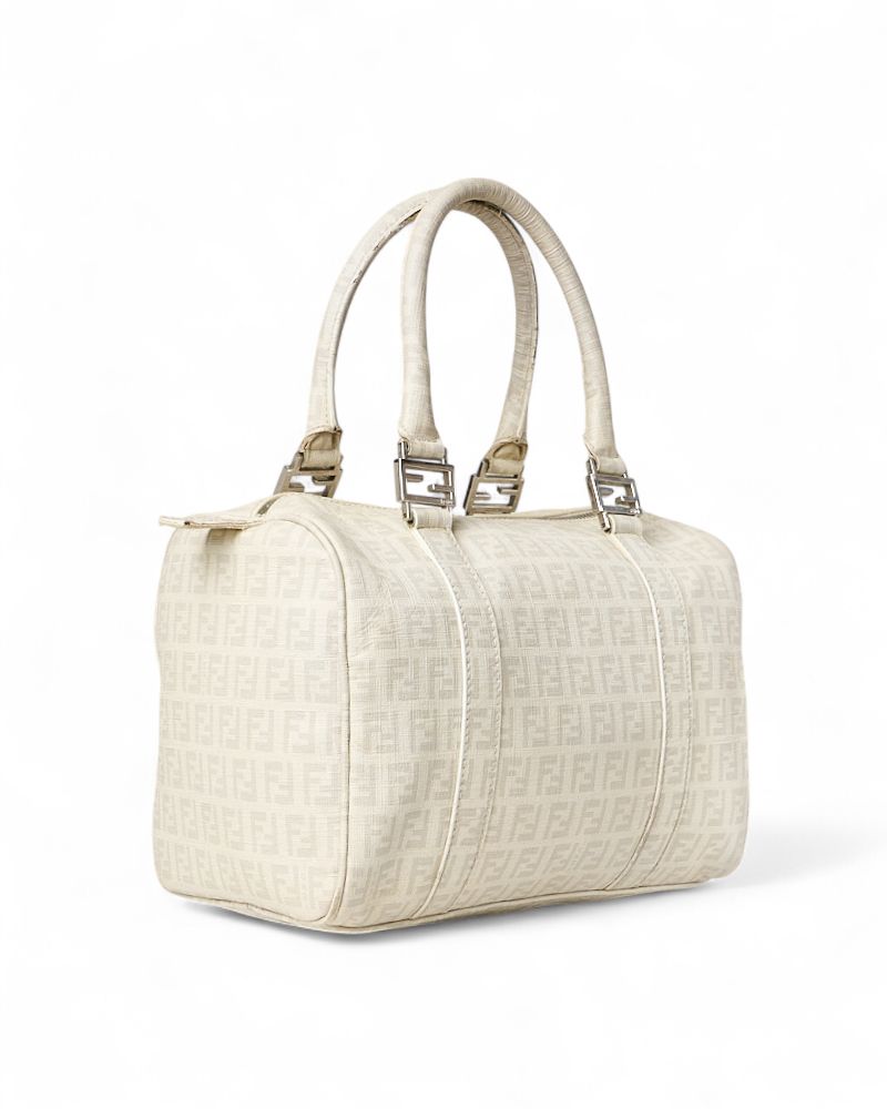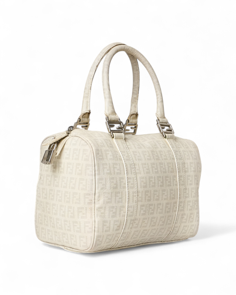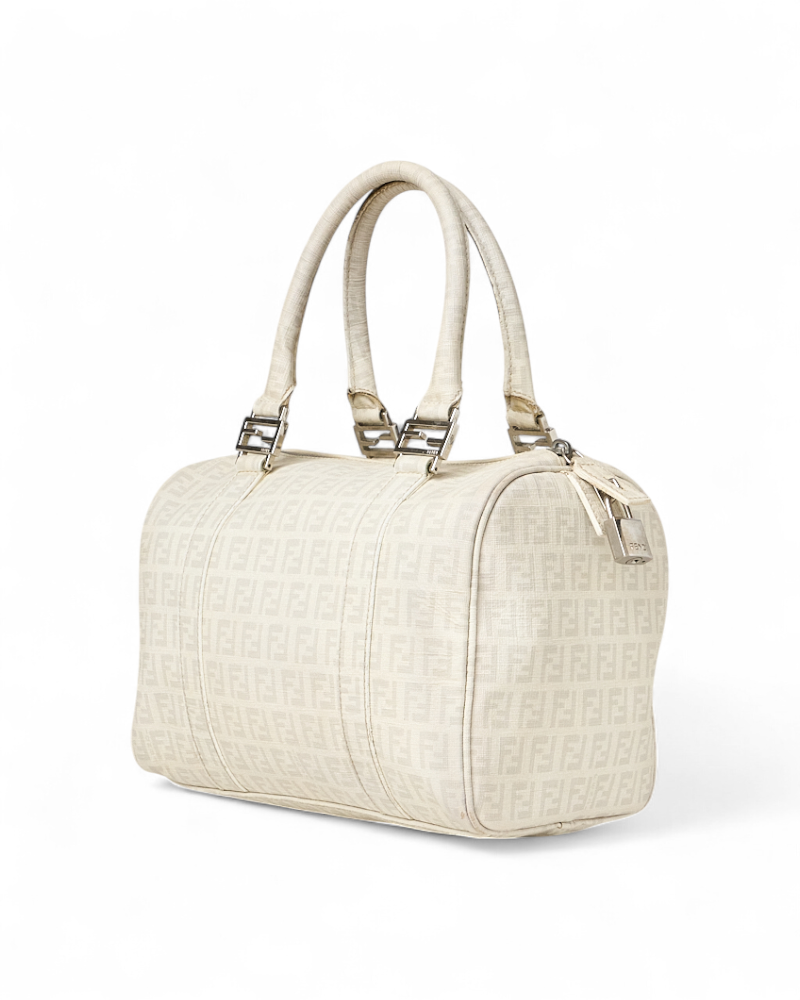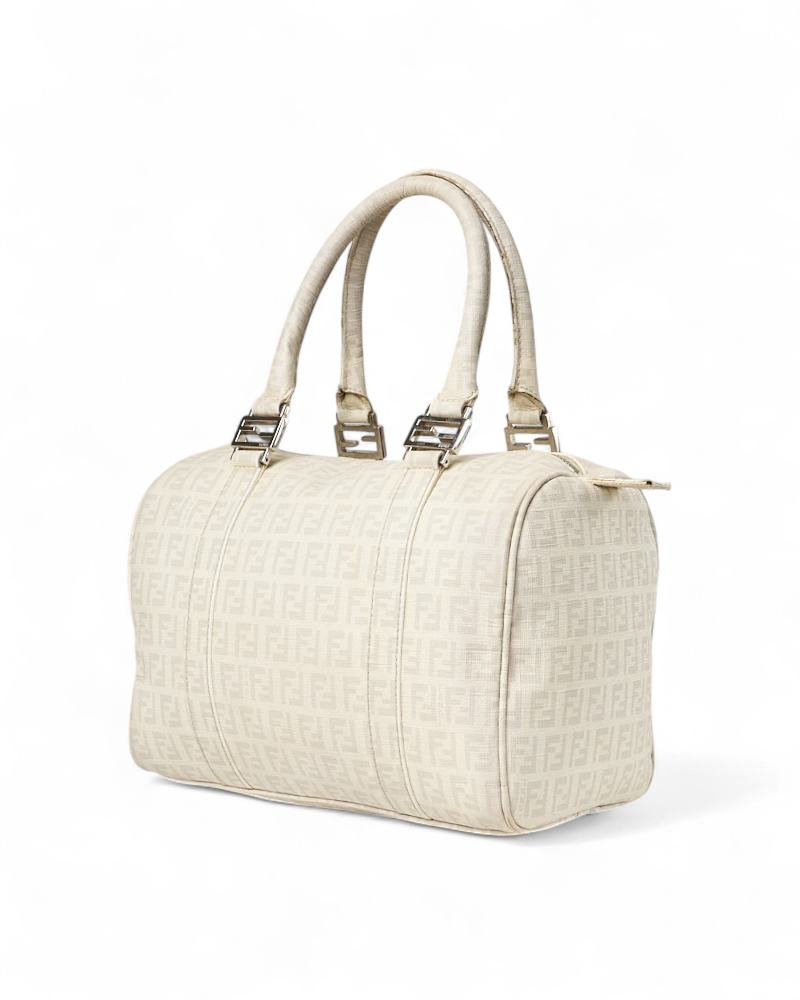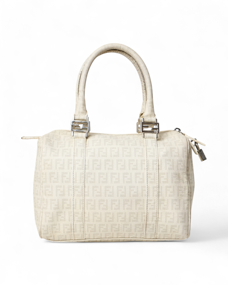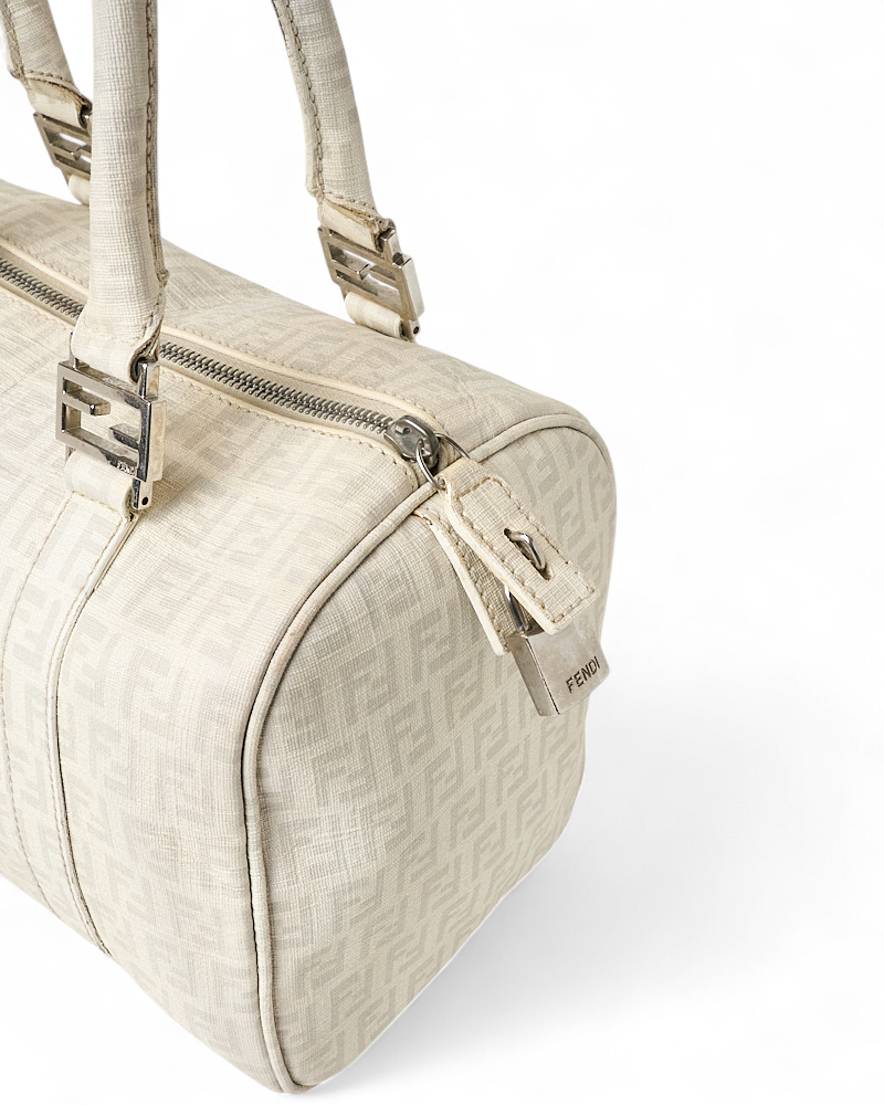 Borsa firmata Fendi, modello boston nella misura small, realizzato in tela nella classica fantasia FF logomania bianco con hardware argento. Dotato di una chiusura superiore a zip, internamente rivestito in tela marrone, la borsa si presenta abbastanza capiente. Munito di doppio manico, per una comoda portata a mano. Completo di lucchetto. L’articolo si presenta in buone condizioni, con segni di usura visibili in foto.