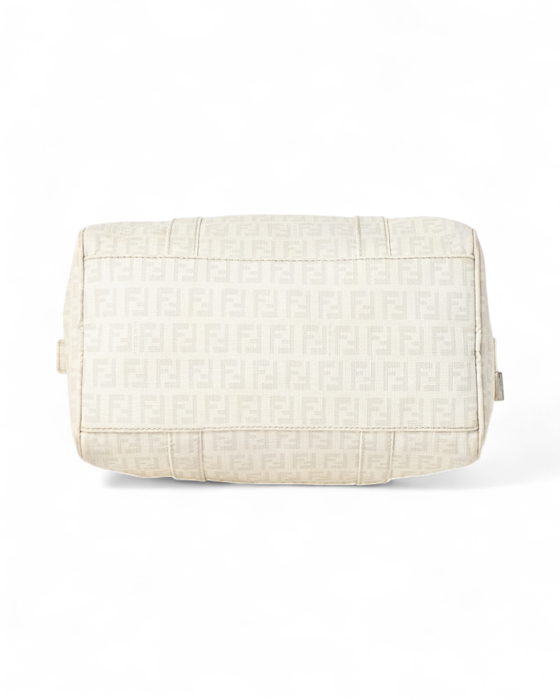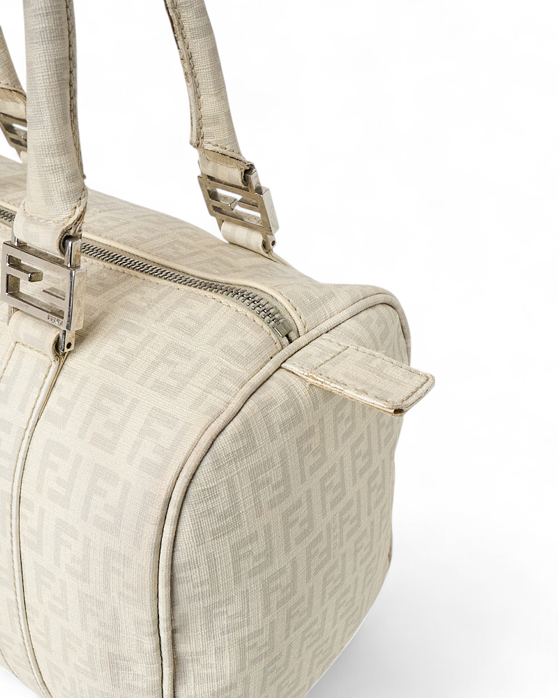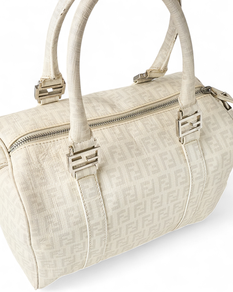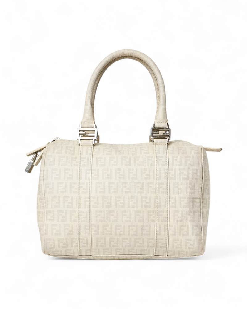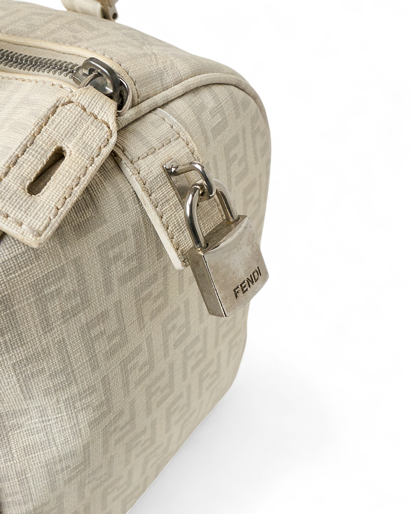Borsa firmata Fendi, modello boston nella misura small, realizzato in tela nella classica fantasia FF logomania bianco con hardware argento. Dotato di una chiusura superiore a zip, internamente rivestito in tela marrone, la borsa si presenta abbastanza capiente. Munito di doppio manico, per una comoda portata a mano. Completo di lucchetto. L’articolo si presenta in buone condizioni, con segni di usura visibili in foto.