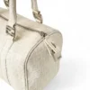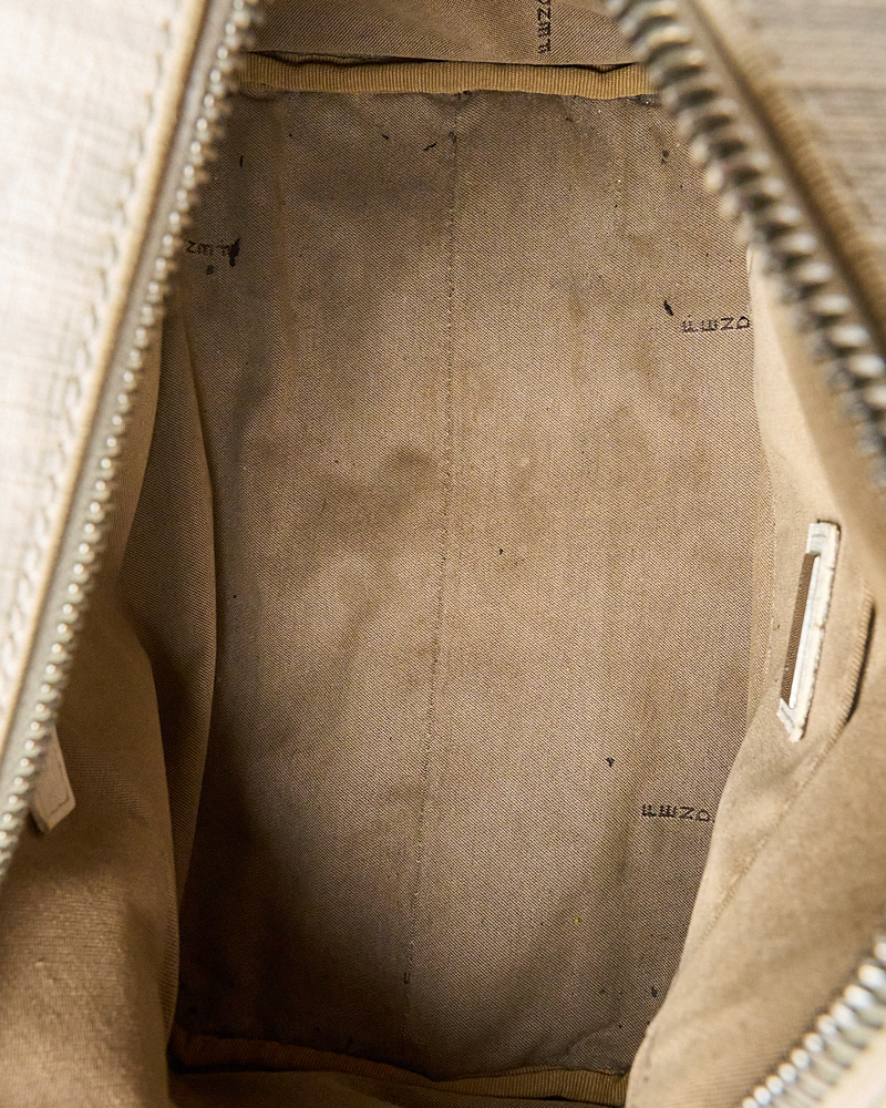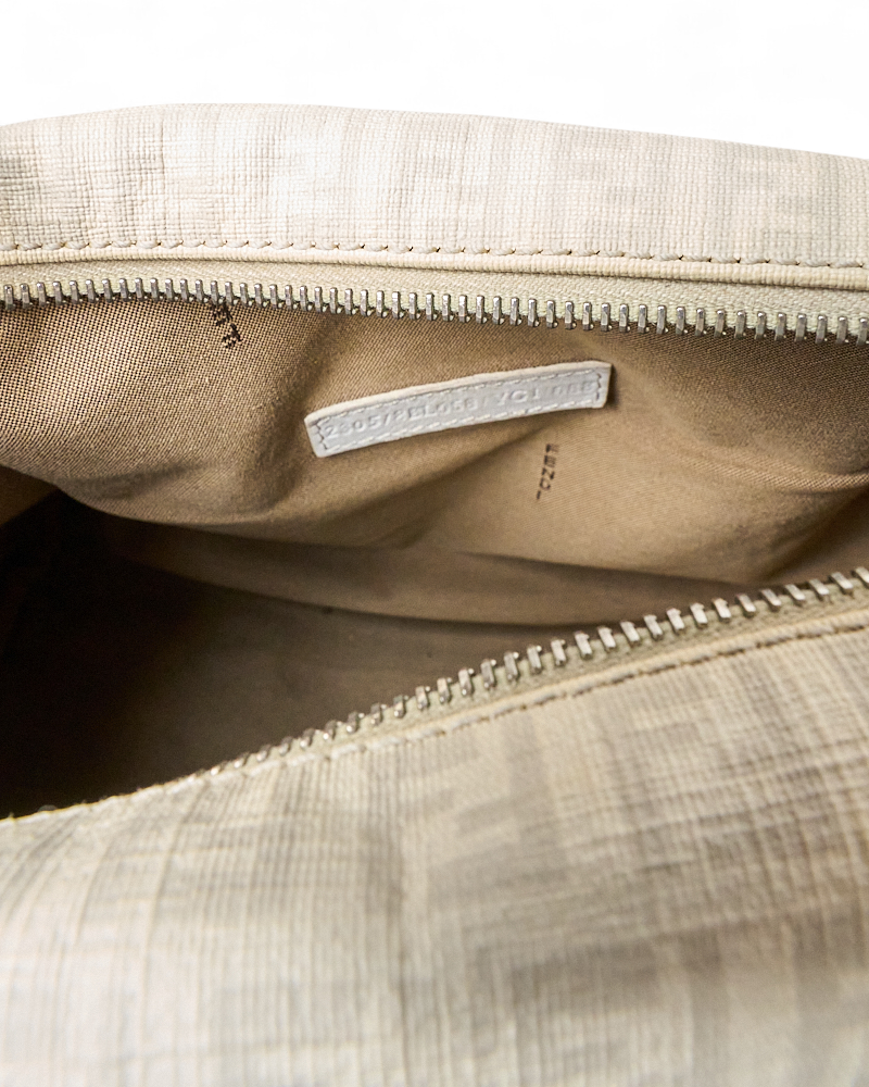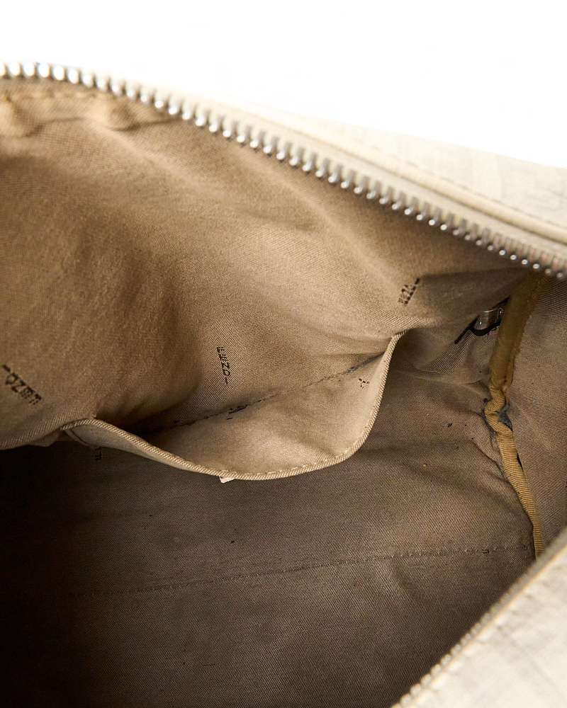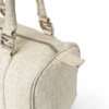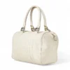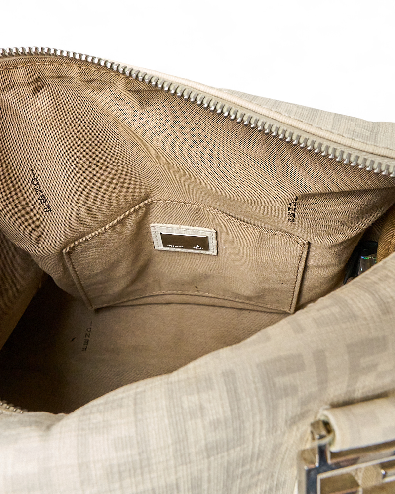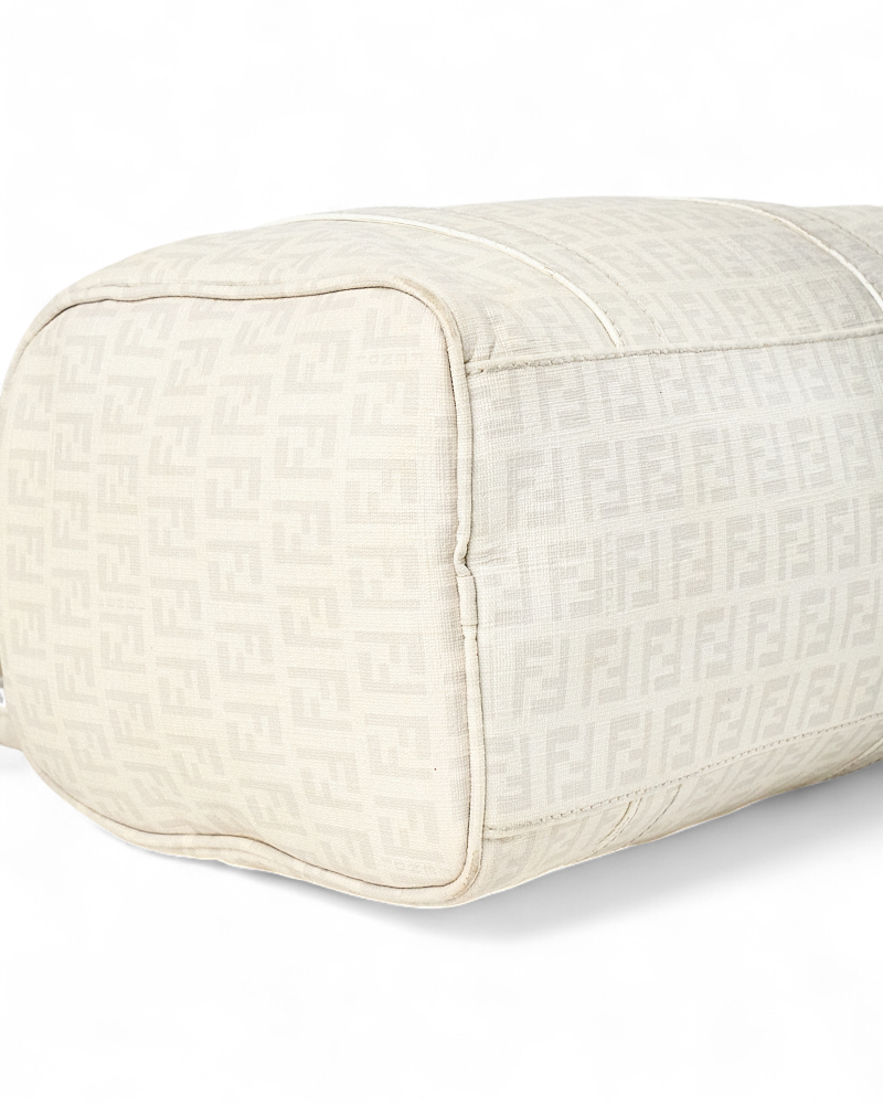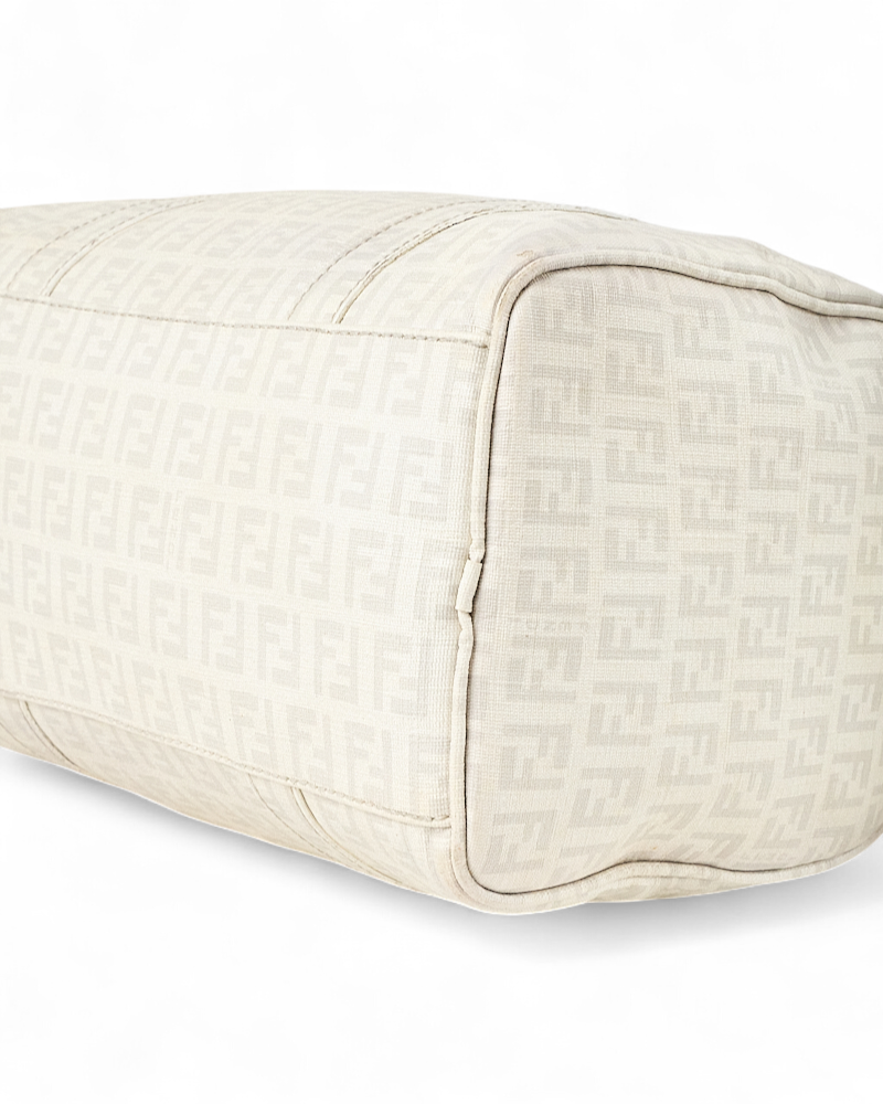 Borsa firmata Fendi, modello boston nella misura small, realizzato in tela nella classica fantasia FF logomania bianco con hardware argento. Dotato di una chiusura superiore a zip, internamente rivestito in tela marrone, la borsa si presenta abbastanza capiente. Munito di doppio manico, per una comoda portata a mano. Completo di lucchetto. L’articolo si presenta in buone condizioni, con segni di usura visibili in foto.