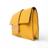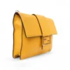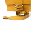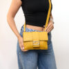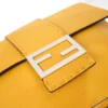 Borsa firmata Fendi, modello Flap Baguette nella misura small, realizzata in pelle gialla con hardware argento. Dotata di una patta con classico logo del brand “FF” in metallo e chiusura calamitata, internamente rivestita in pelle e tela marrone con comoda tasca, la borsa è abbastanza capiente. Munita di una tracolla rimovibile e regolabile, per una comoda portata a spalla o a tracolla. L’articolo si presenta in ottime condizioni.
