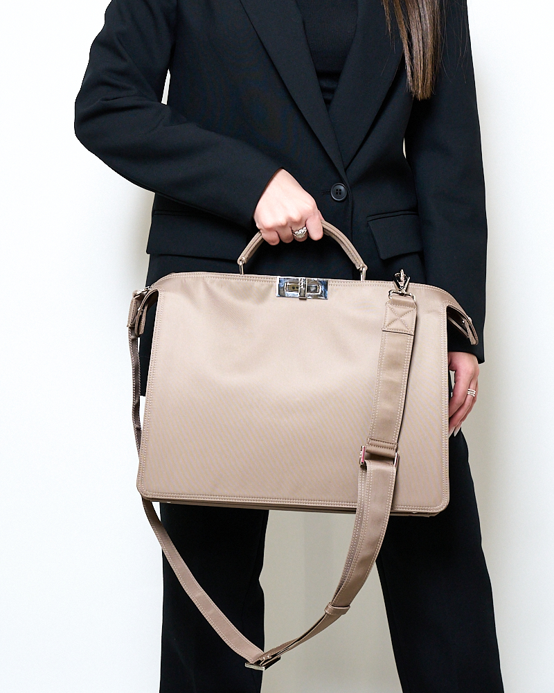 Borsa firmata Fendi, modello Peekaboo ISeeU nella misura medium, realizzata in nylon beige con hardware argento. Dotata di una doppia chiusura superiore a zip e a incastro, internamente rivestita in nylon tono su tono con comode tasche, la borsa è abbastanza capiente. Munita di un manico e di una tracolla rimovibile e regolabile, per una comoda portata a mano o a spalla. L’articolo si presenta in ottime condizioni.
