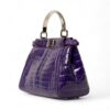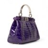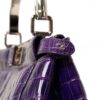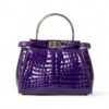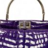 Borsa firmata Fendi, modello Peekaboo, misura mini, reaizzat ain pelle cocco viola con hardware argentati. Dotata di una doppia chiusura a girello fronte retro, internamente rivestita in pelle liscia viola, capiente per l’essenziale. Munita di un manico centrale rigido per portata a mano, e di una tracolla sottile in pelle cocco, rimovibile e regolabile. Caratterizzata da bottoni ad incastro laterali e da piccola tasca interna con chiusura a zip. Si presenta in ottime condizioni.