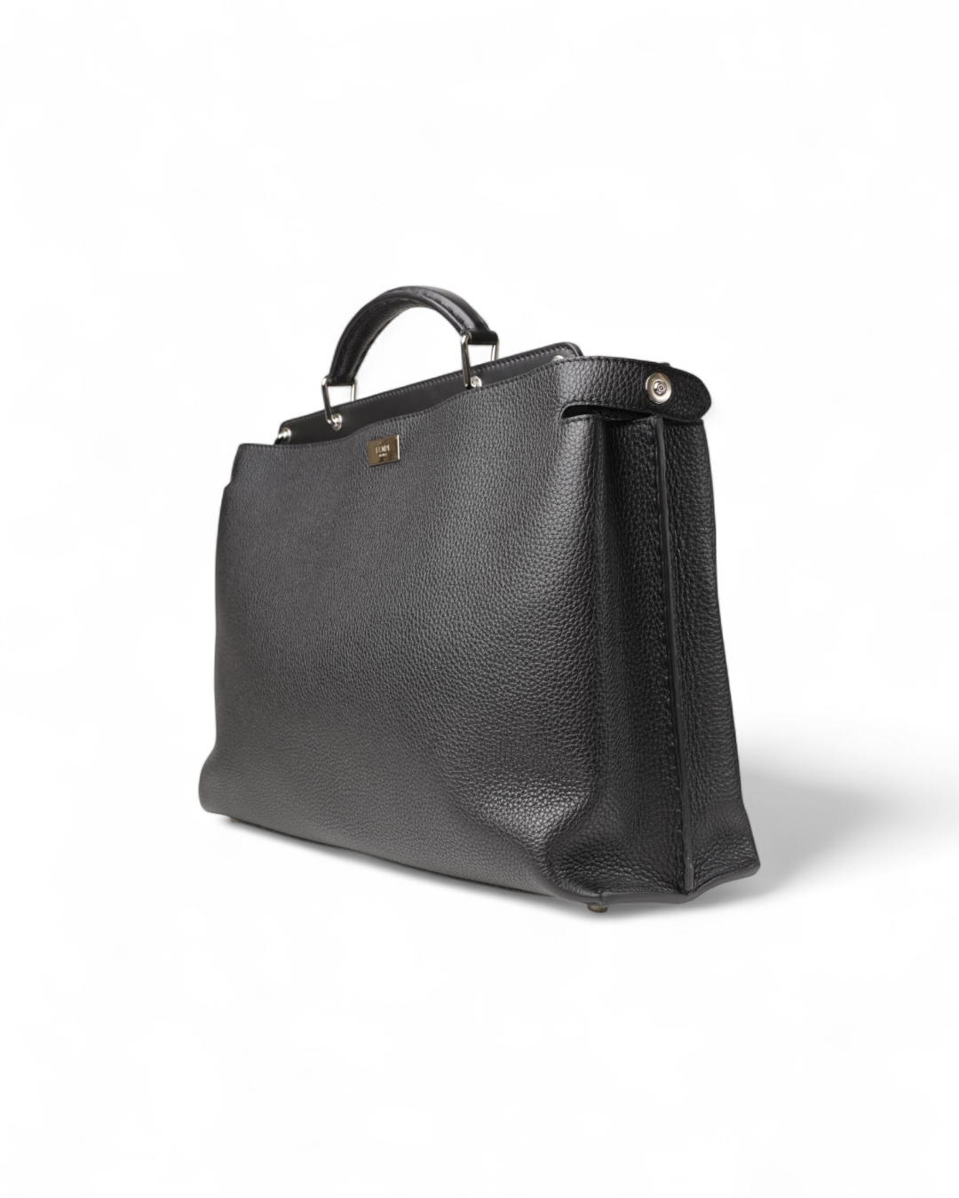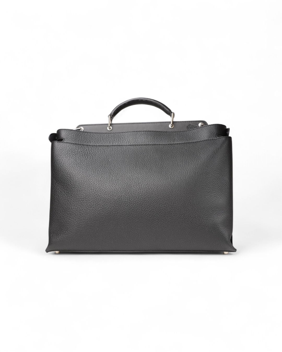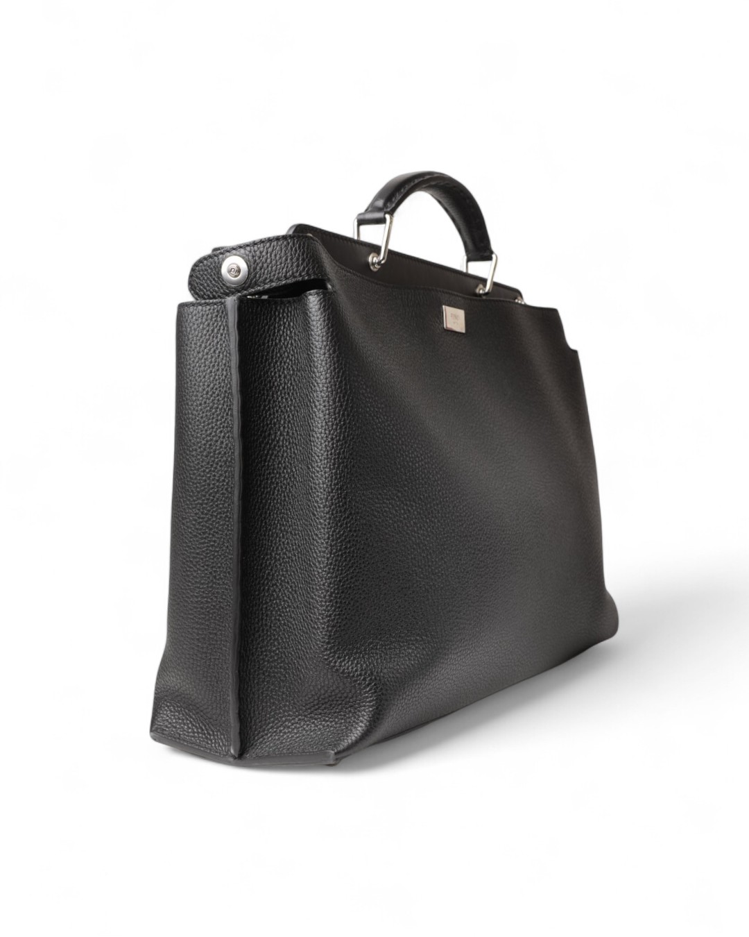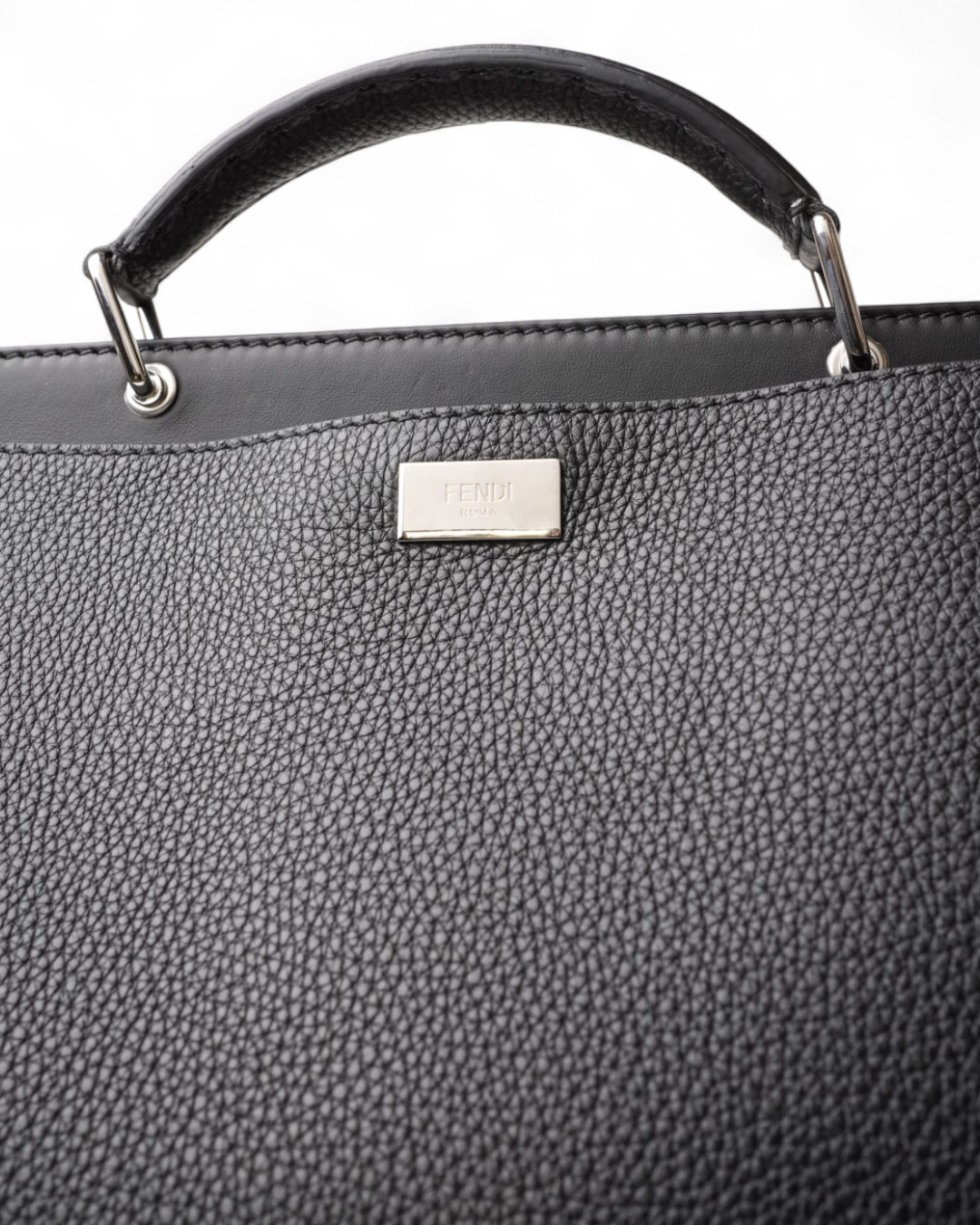 Borsa firmata Fendi, modello Peekaboo Utility nella misura large, realizzata in pelle granulata nera con hardware argento. Dotata di una doppia chiusura a zip e ad incastro, internamente rivestita in pelle liscia tono su tono con comode tasche, la borsa è abbastanza capiente. Munita di doppio manico in pelle e di una tracolla rimovibile e regolabile, per una comoda portata a spalla o a tracolla. L’articolo si presenta in ottime condizioni.