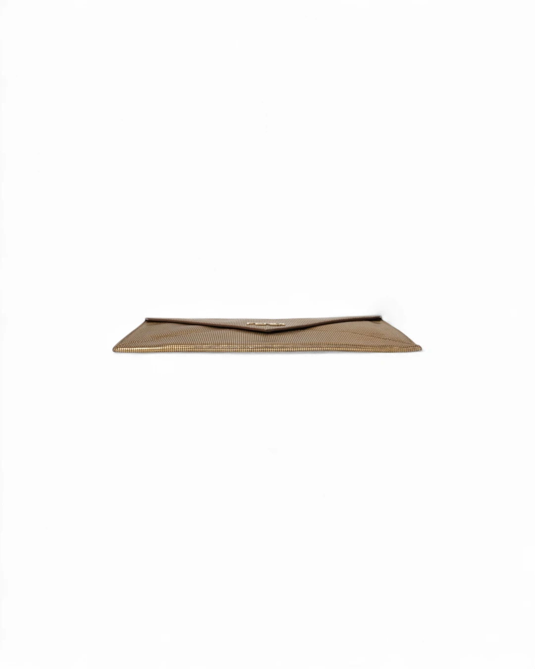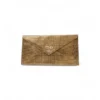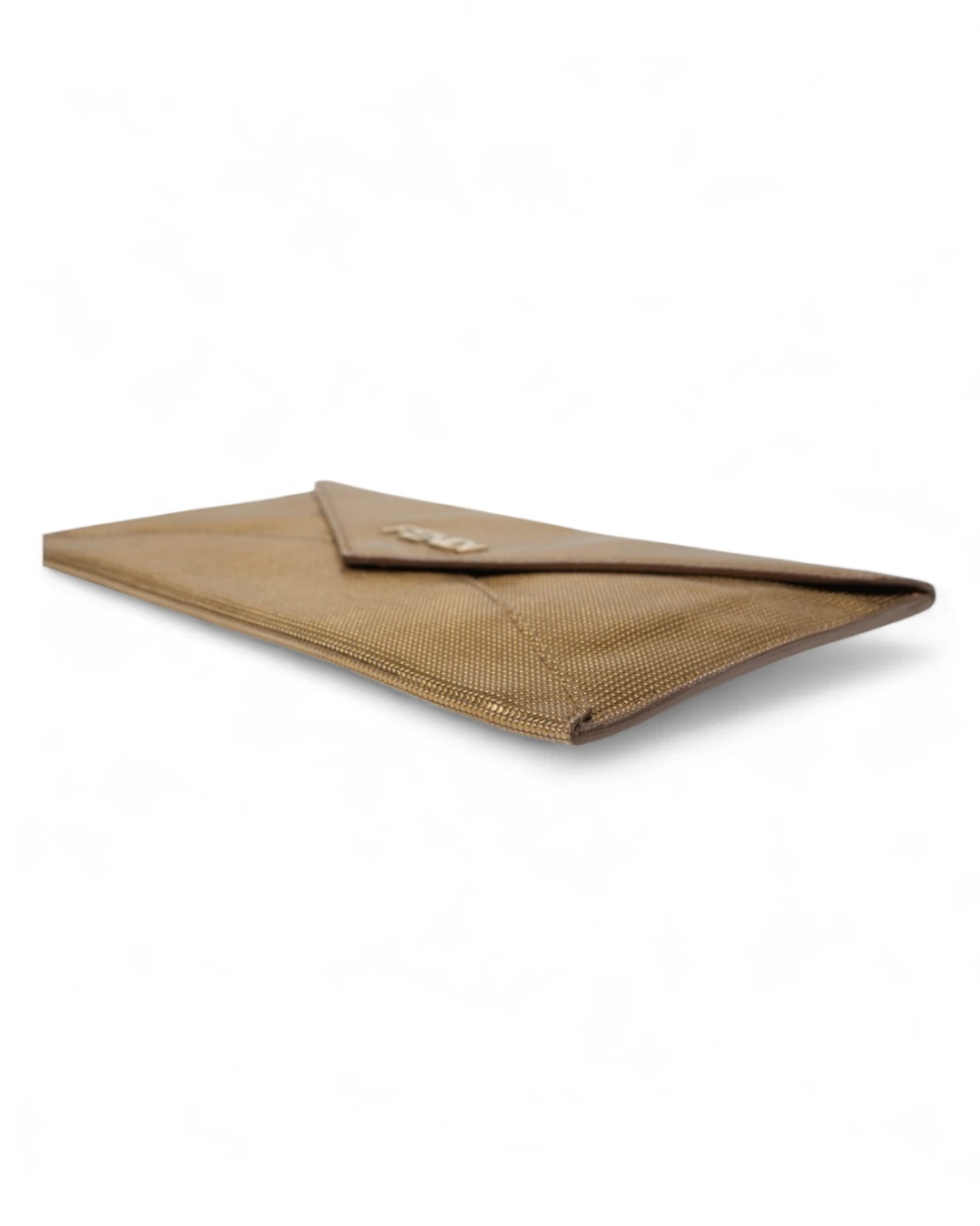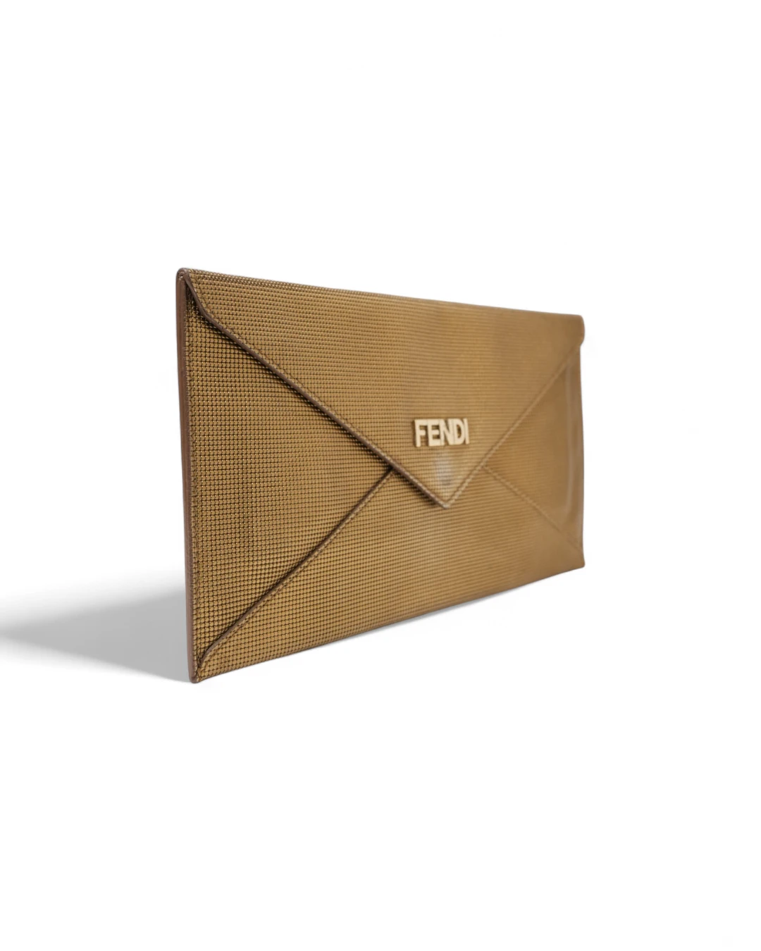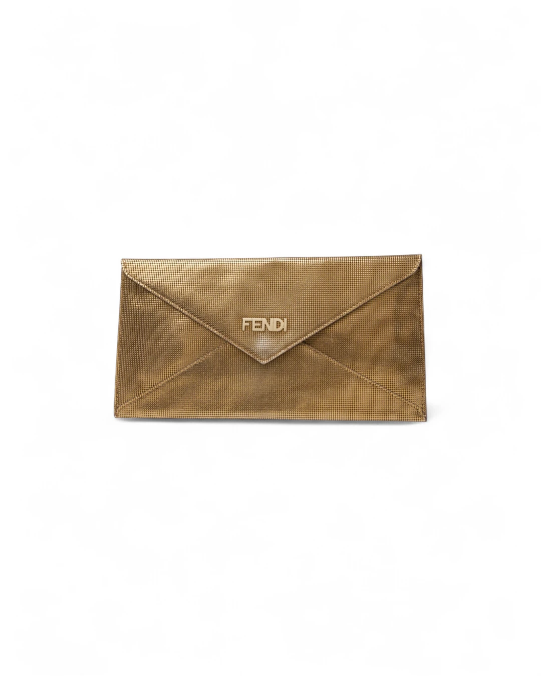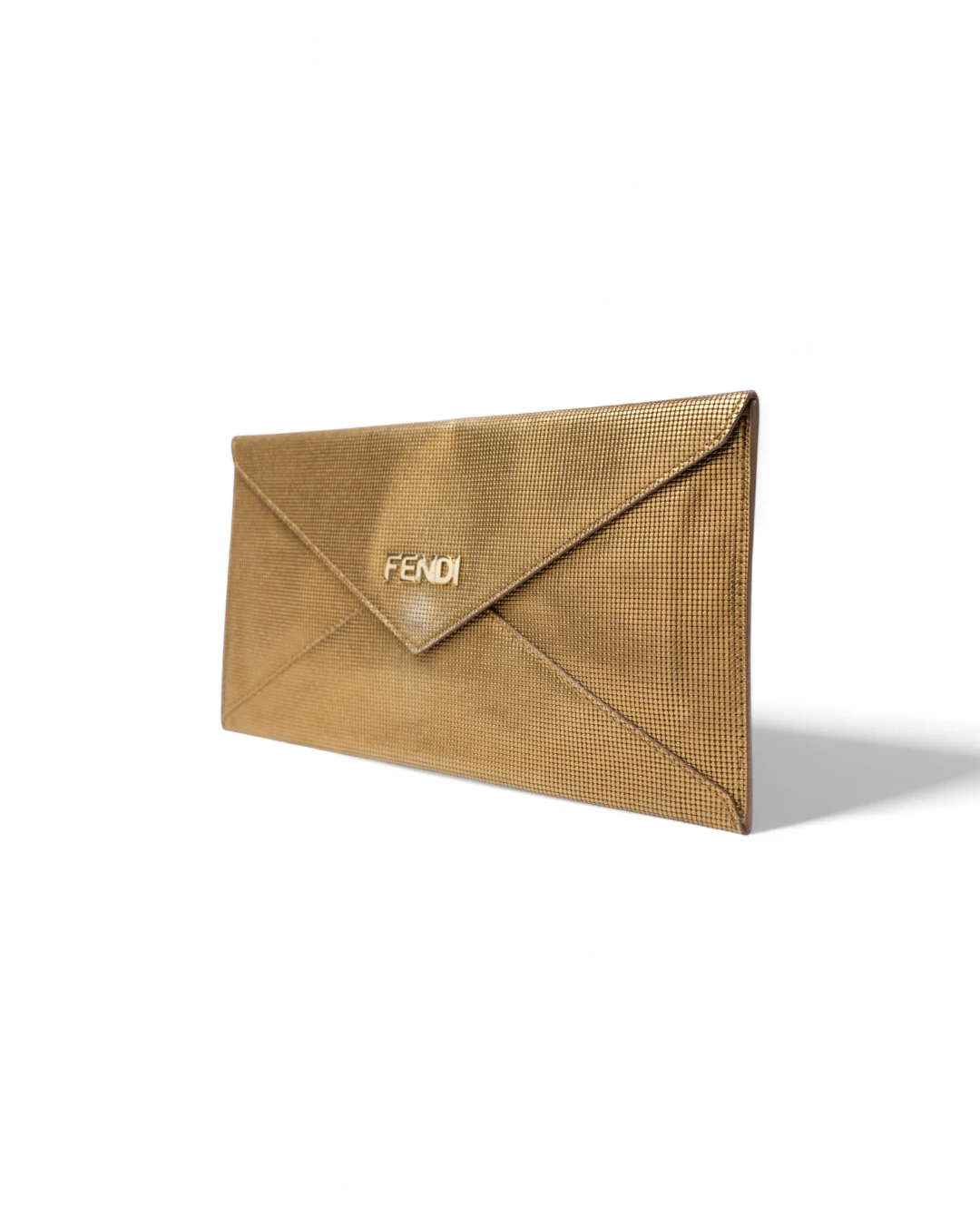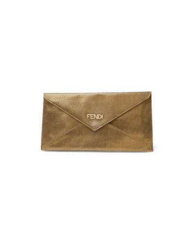 Pochette firmata Fendi, misura small, realizzata in pelle oro con motivo circle  e hardware dorato. Dotata di una patta con chiusura a bottone calamitato, internamente rivestita in pelle liscia tono su tono con comode fessure per documenti e carte, la pochette è capiente per l’essenziale. L’articolo si presenta in buone condizioni.