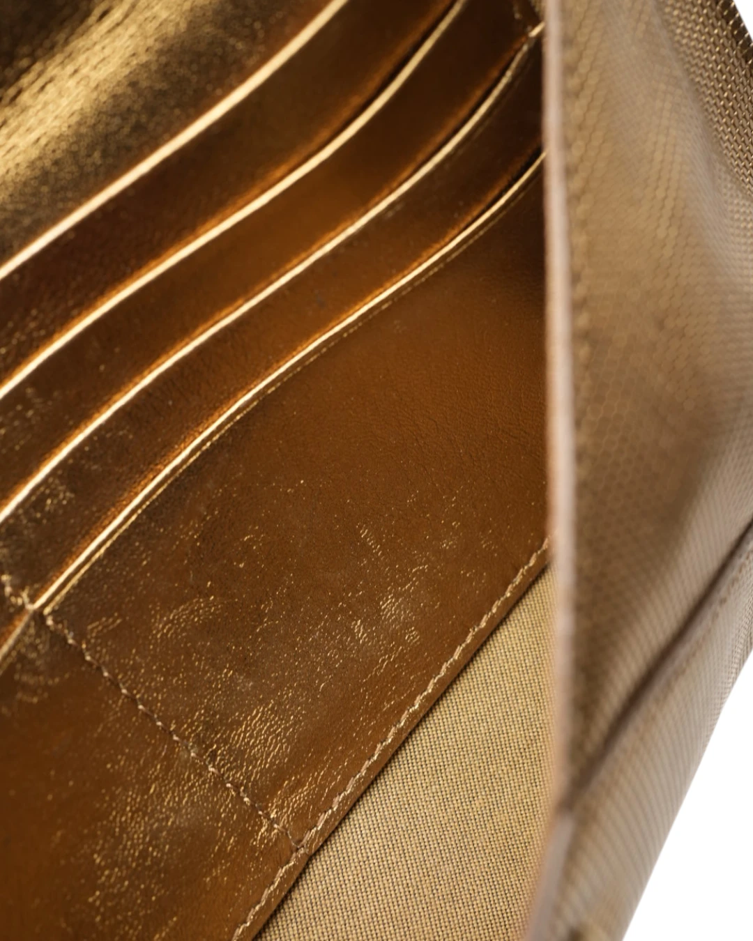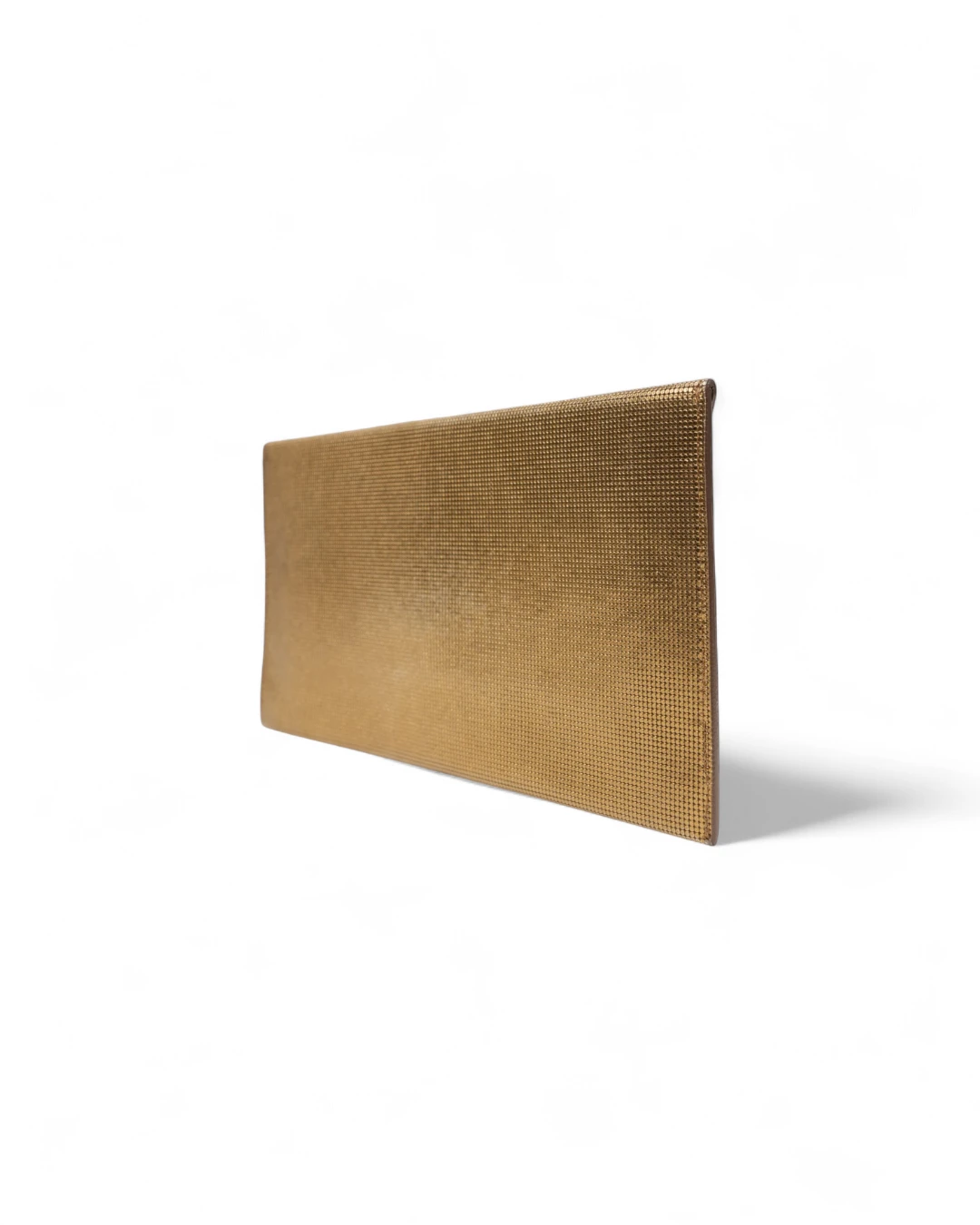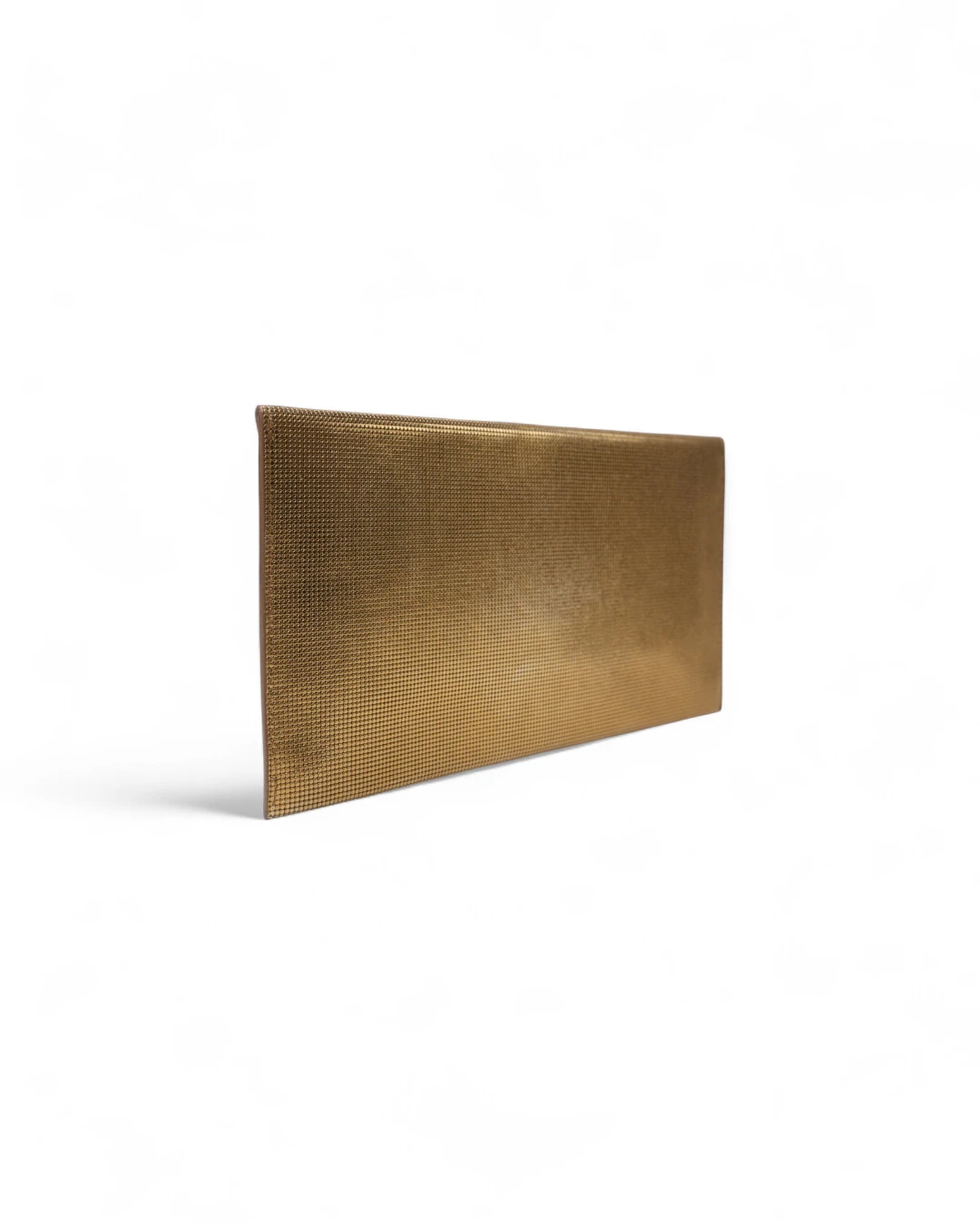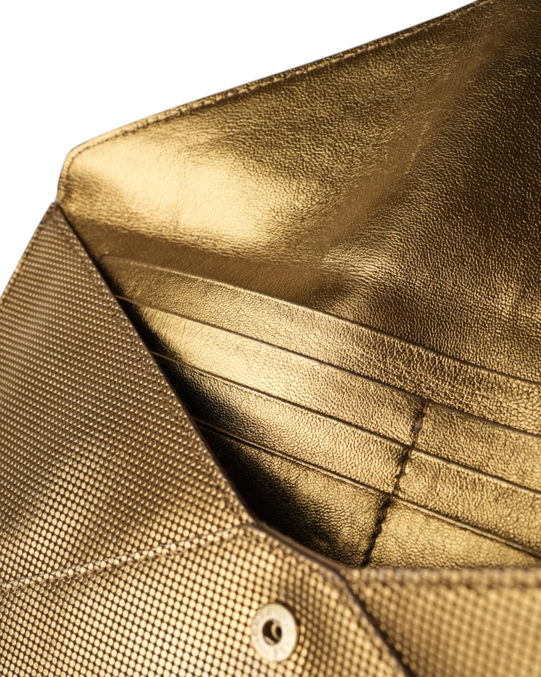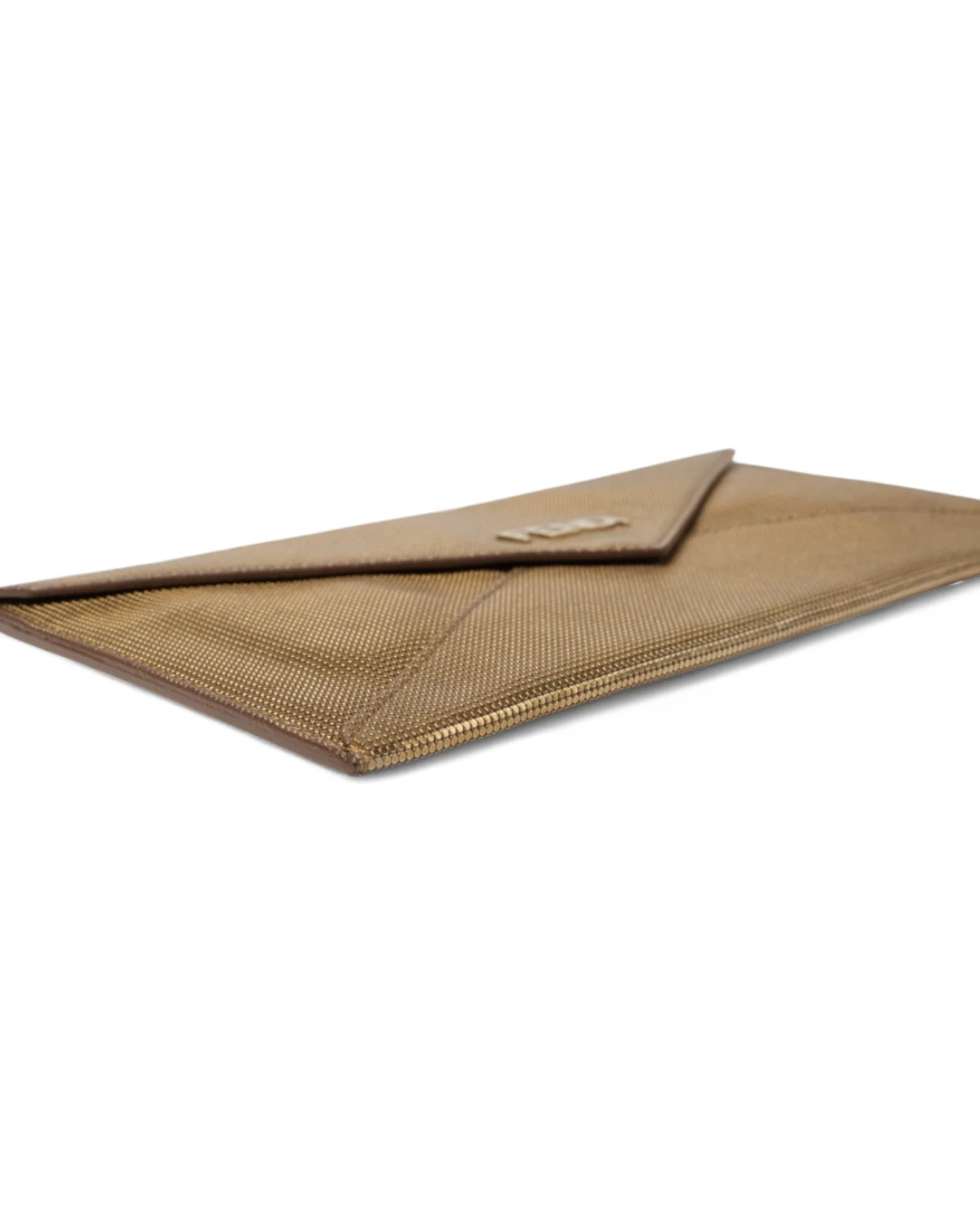 Pochette firmata Fendi, misura small, realizzata in pelle oro con motivo circle  e hardware dorato. Dotata di una patta con chiusura a bottone calamitato, internamente rivestita in pelle liscia tono su tono con comode fessure per documenti e carte, la pochette è capiente per l’essenziale. L’articolo si presenta in buone condizioni.
