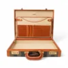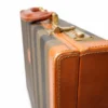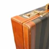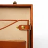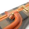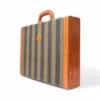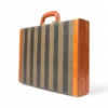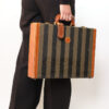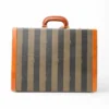 Portadocumenti firmato Fendi, modello rigido, realizzato in tela a righe e rifiniture in pelle marrone con hardware dorati. Dotato di una chiusura ad incastro, internamente rivestito in tessuto scamosciato beige con diverse fessure e tasche per documenti, si presenta molto capiente. Munito di un manico rigido in pelle, per una comoda portata a mano. L’articolo si presenta in buone condizioni con segni di usura visibili in foto.