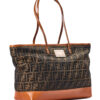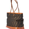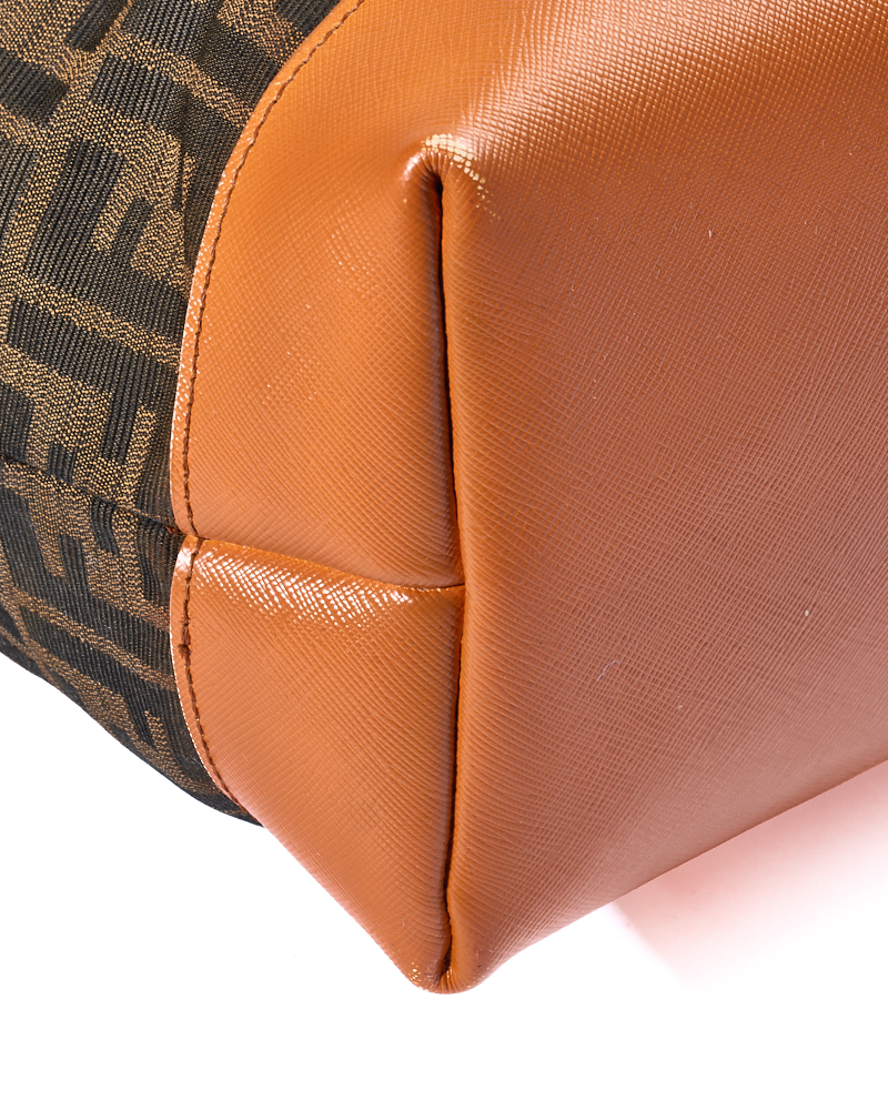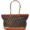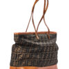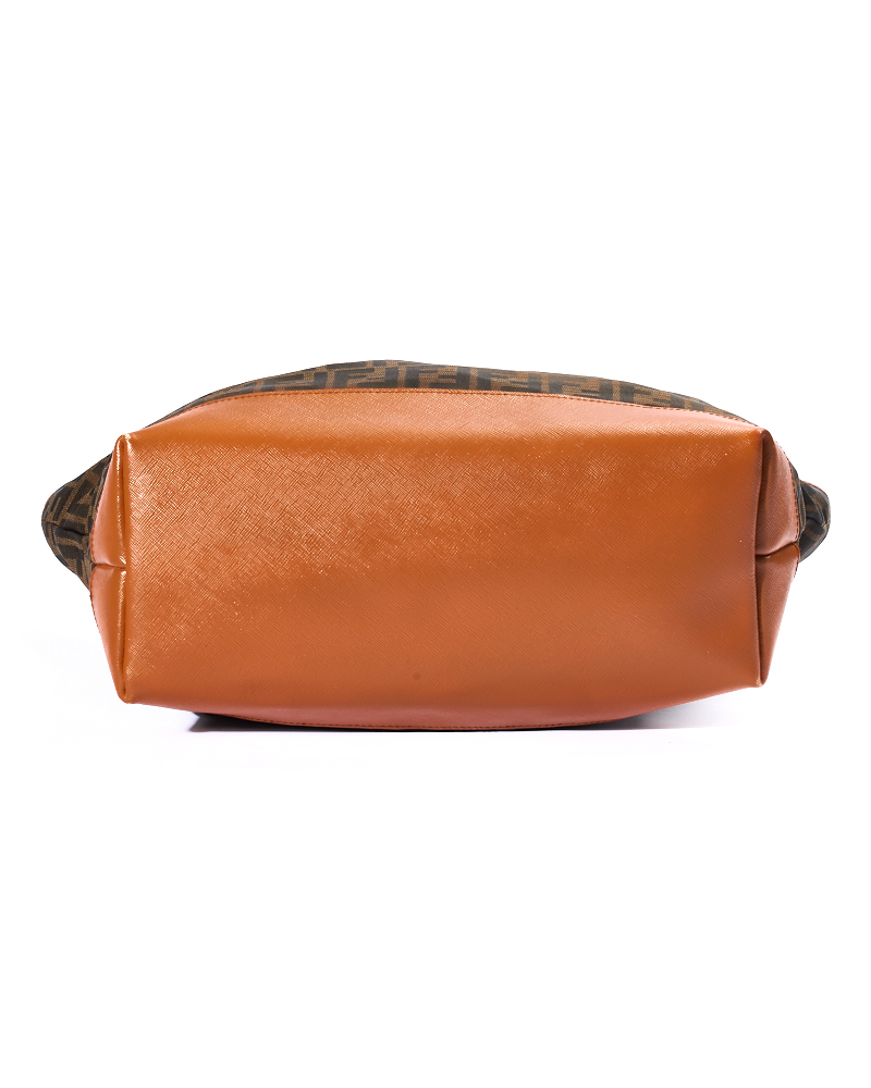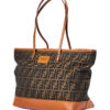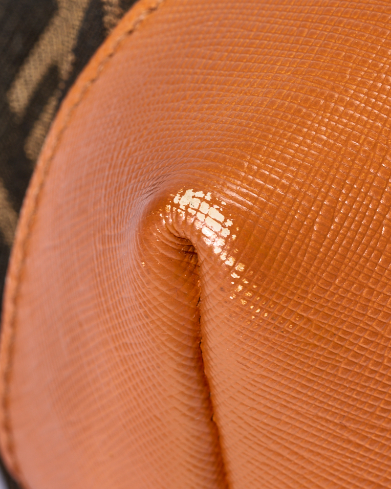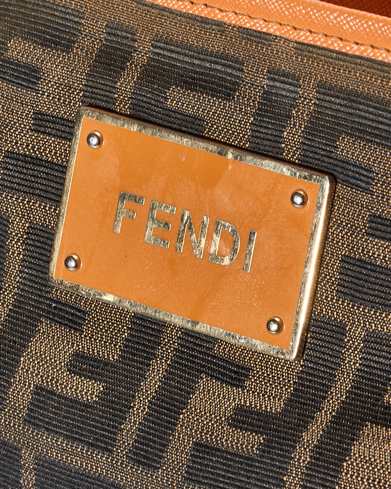 Borsa firmata Fendi, modello Roll Bag, misura Large, realizzata in tela marrone con la classica fantasia FF Logomania con rifiniture in pelle arancione e hardware dorato. Dotata di una chiusura superiore a zip, internamente rivestita in tela e presenta una comoda tasca con zip, la borsa è molto capiente. Munita di doppi manici in pelle per una comoda portata a spalla. L’articolo si presenta in buone condizioni, con segni di usura visibili in foto.