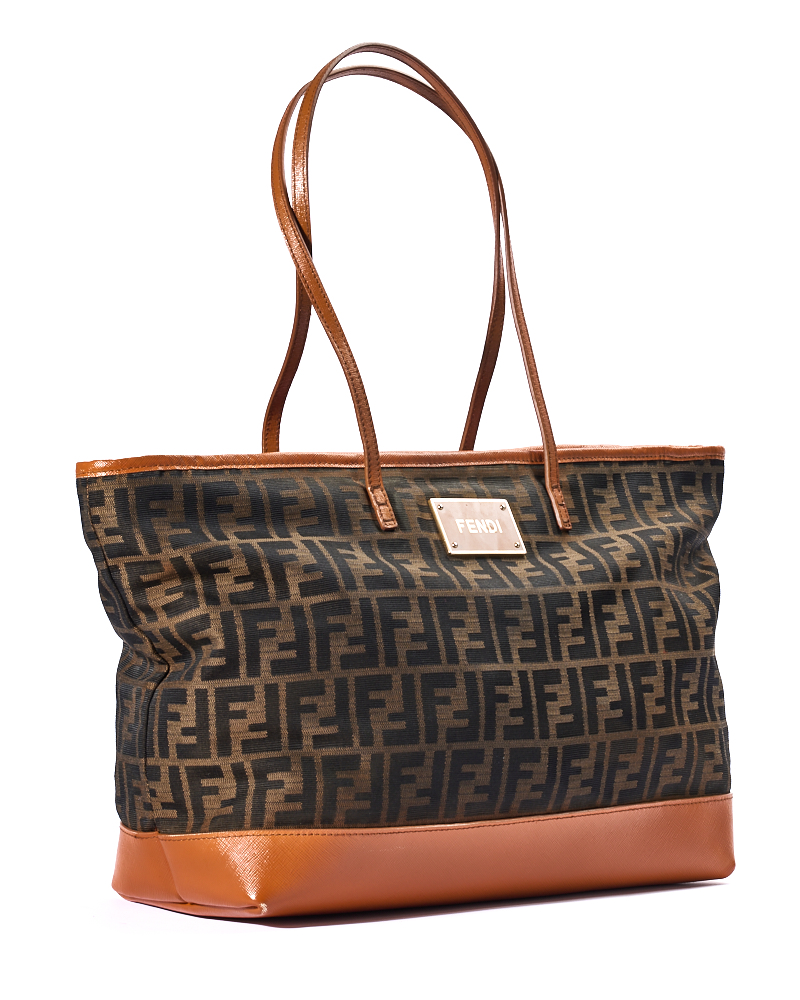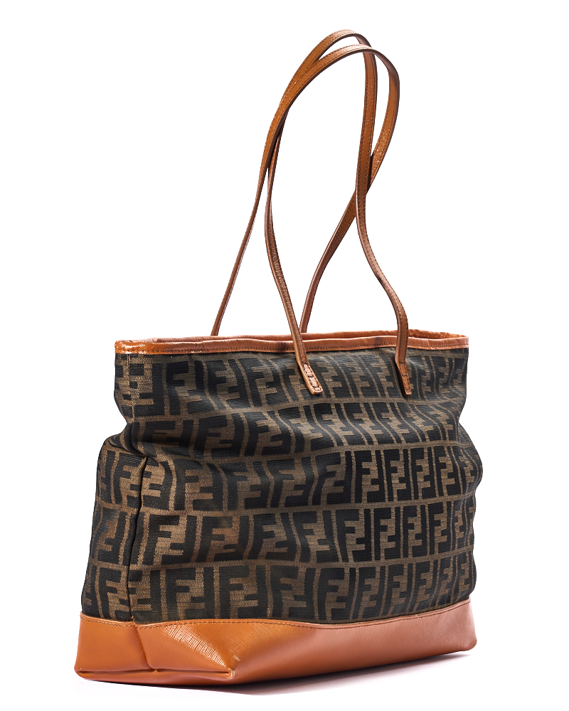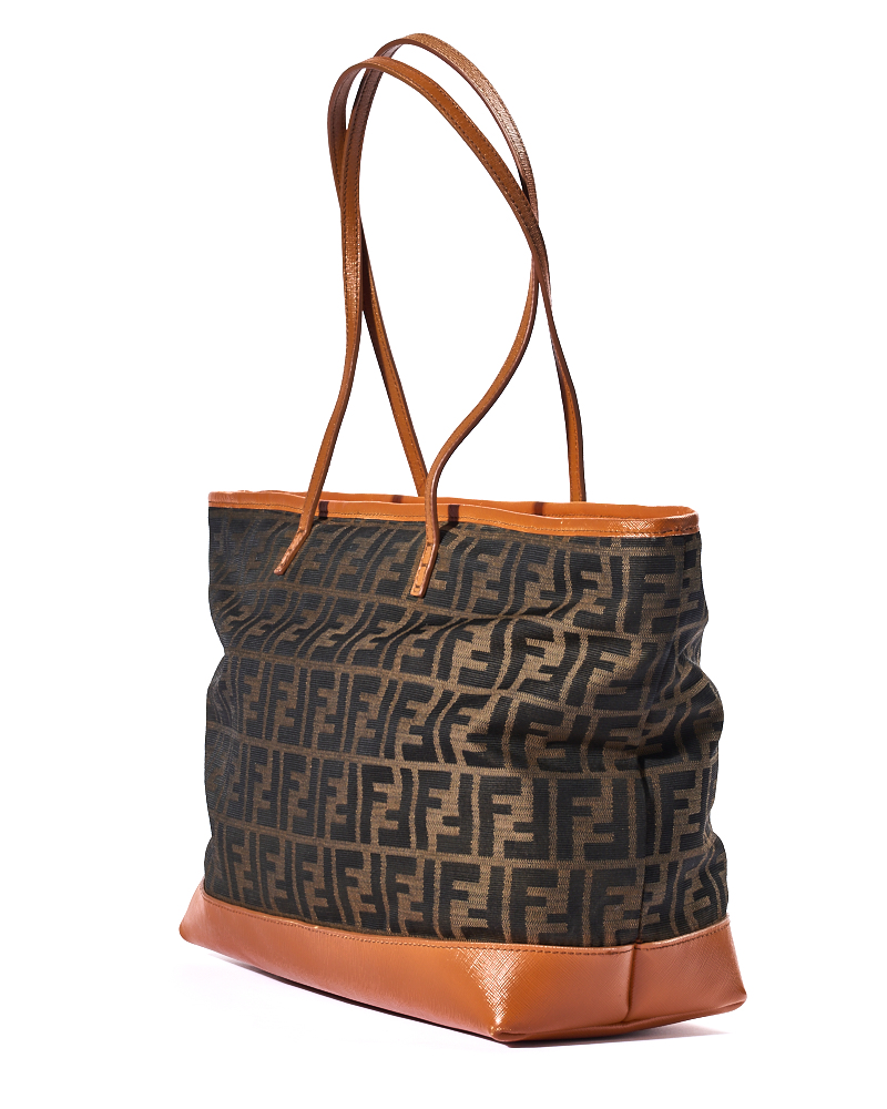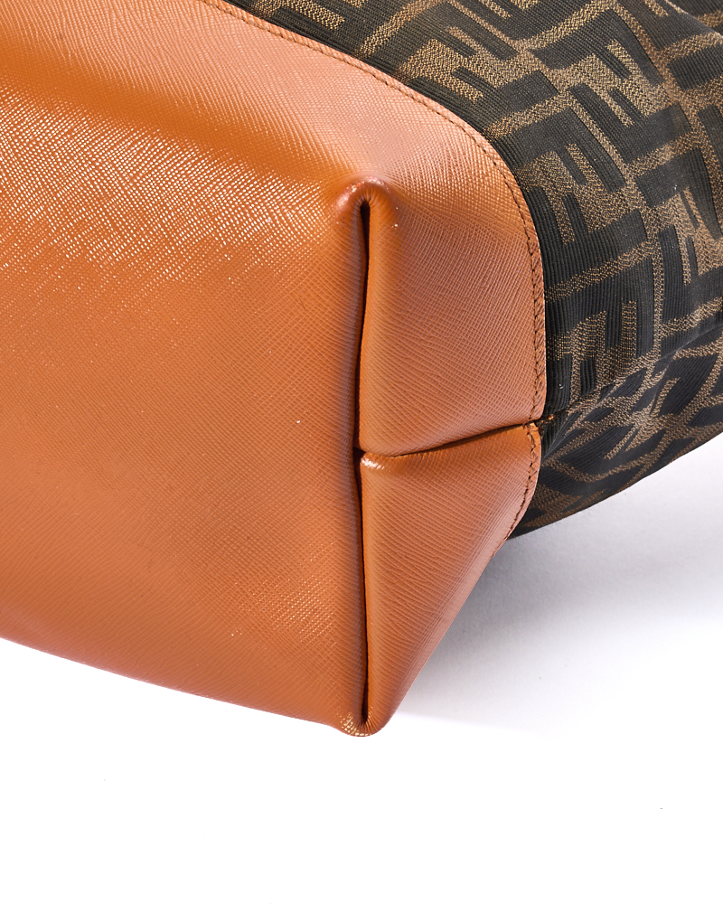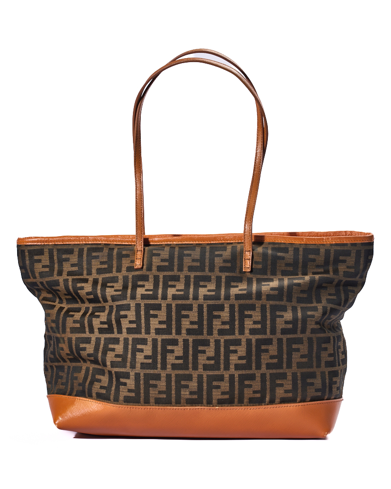 Borsa firmata Fendi, modello Roll Bag, misura Large, realizzata in tela marrone con la classica fantasia FF Logomania con rifiniture in pelle arancione e hardware dorato. Dotata di una chiusura superiore a zip, internamente rivestita in tela e presenta una comoda tasca con zip, la borsa è molto capiente. Munita di doppi manici in pelle per una comoda portata a spalla. L’articolo si presenta in buone condizioni, con segni di usura visibili in foto.