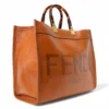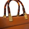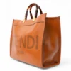 Borsa firmata Fendi, modello Sunshine nella misura medium, realizzata in pelle liscia marrone con hardware dorato. Non è dotata di nessuna chiusura, internamente rivestita in tessuto scamosciato marrone, la borsa è abbastanza capiente. Munita di doppio manico in in plexiglass con effetto tartarugato e di una tracolla rimovibile, per una comoda portata a spalla o a mano. L’articolo si presenta in buone condizioni.