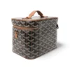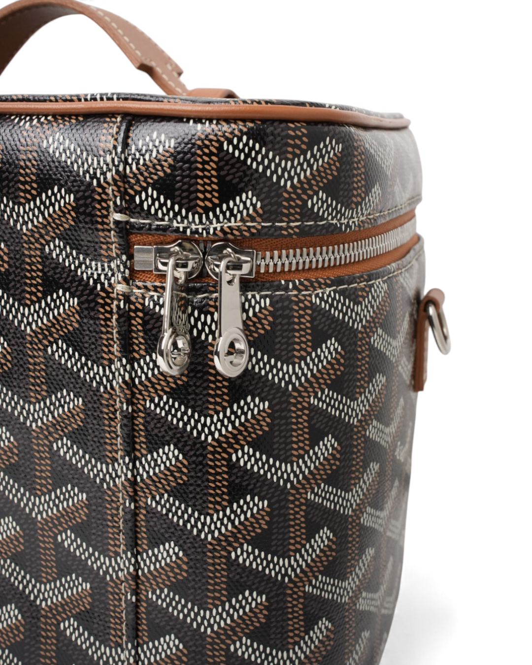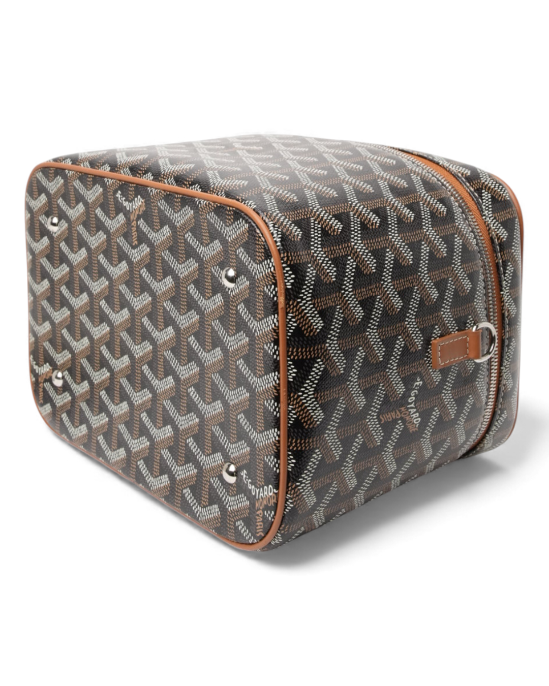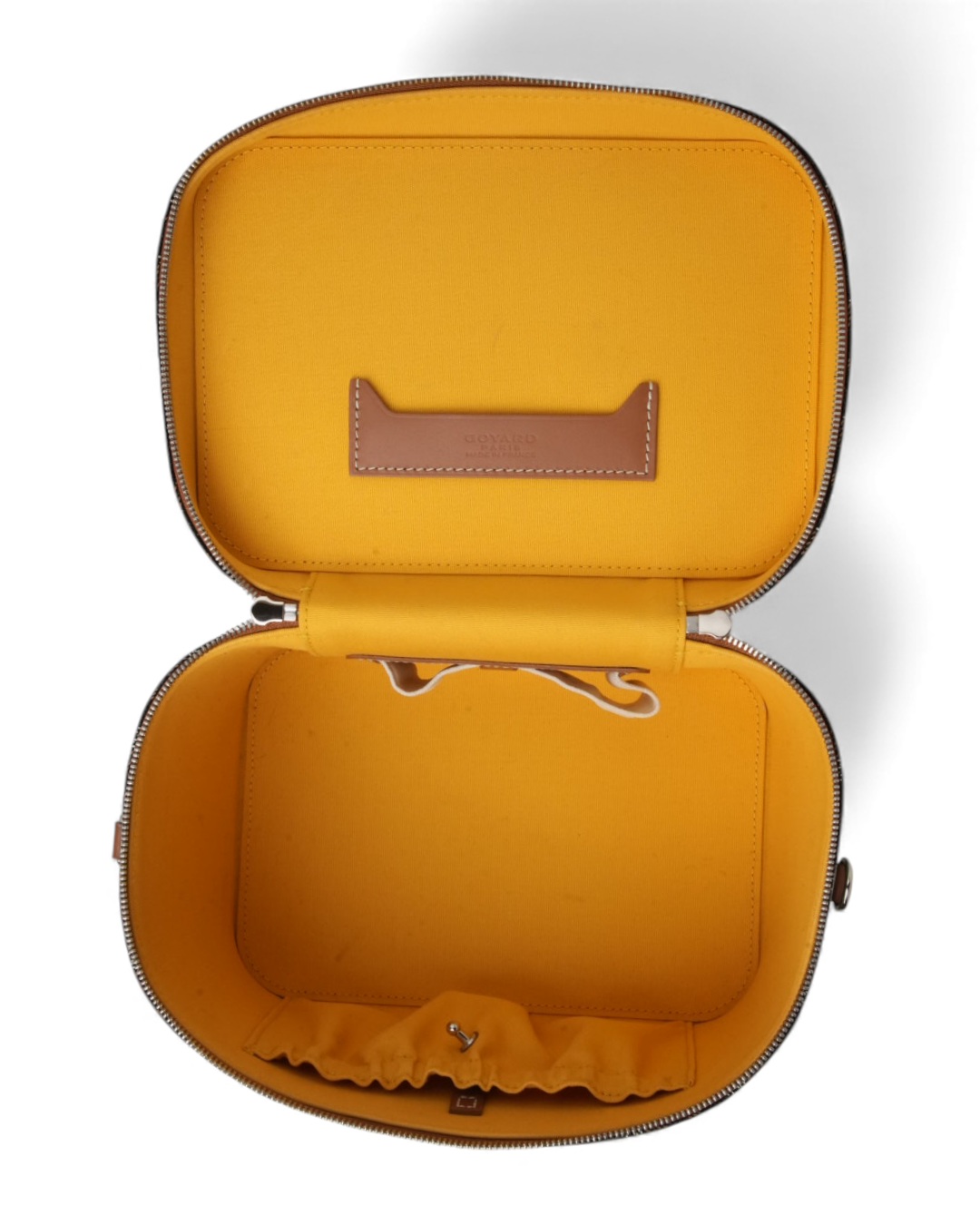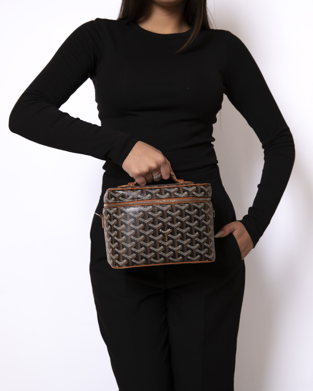 Borsa firmata Goyard, modello Vanity Case nella misura small, realizzata in tela nella fantasia Goyardine con rifiniture in pelle marrone e hardware argento. Dotata di una chiusura superiore a zip con doppio cursore, internamente rivestita in tela gialla con comodi elastici, la borsa è abbastanza capiente. Munita di un manico e di una tracolla rimovibile e regolabile, per una comoda portata a mano o a spalla. L’articolo si presenta in condizioni pari al nuovo.