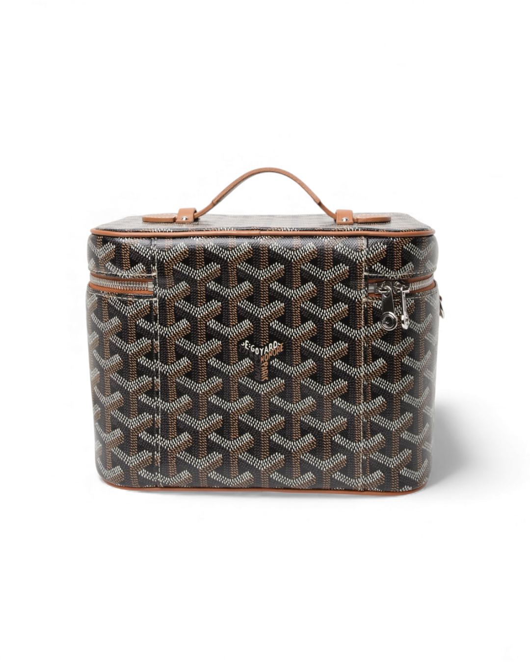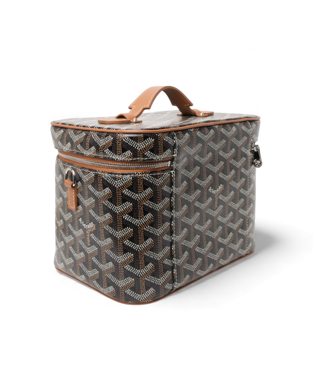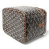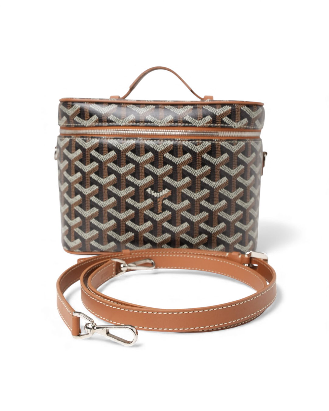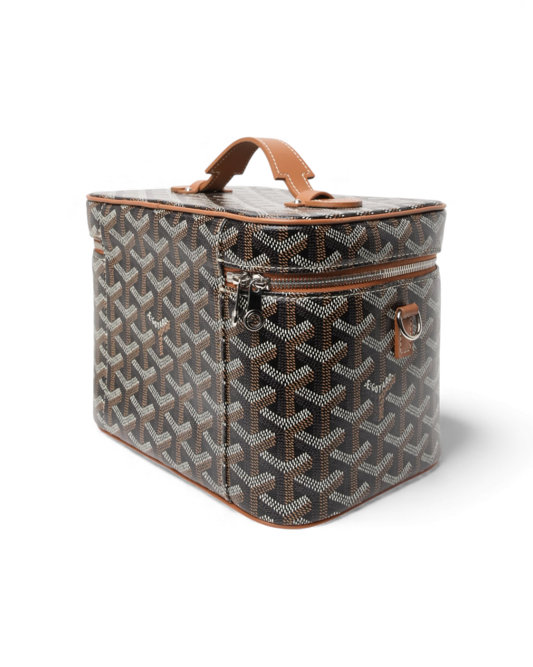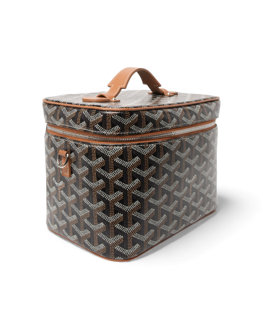 Borsa firmata Goyard, modello Vanity Case nella misura small, realizzata in tela nella fantasia Goyardine con rifiniture in pelle marrone e hardware argento. Dotata di una chiusura superiore a zip con doppio cursore, internamente rivestita in tela gialla con comodi elastici, la borsa è abbastanza capiente. Munita di un manico e di una tracolla rimovibile e regolabile, per una comoda portata a mano o a spalla. L’articolo si presenta in condizioni pari al nuovo.
