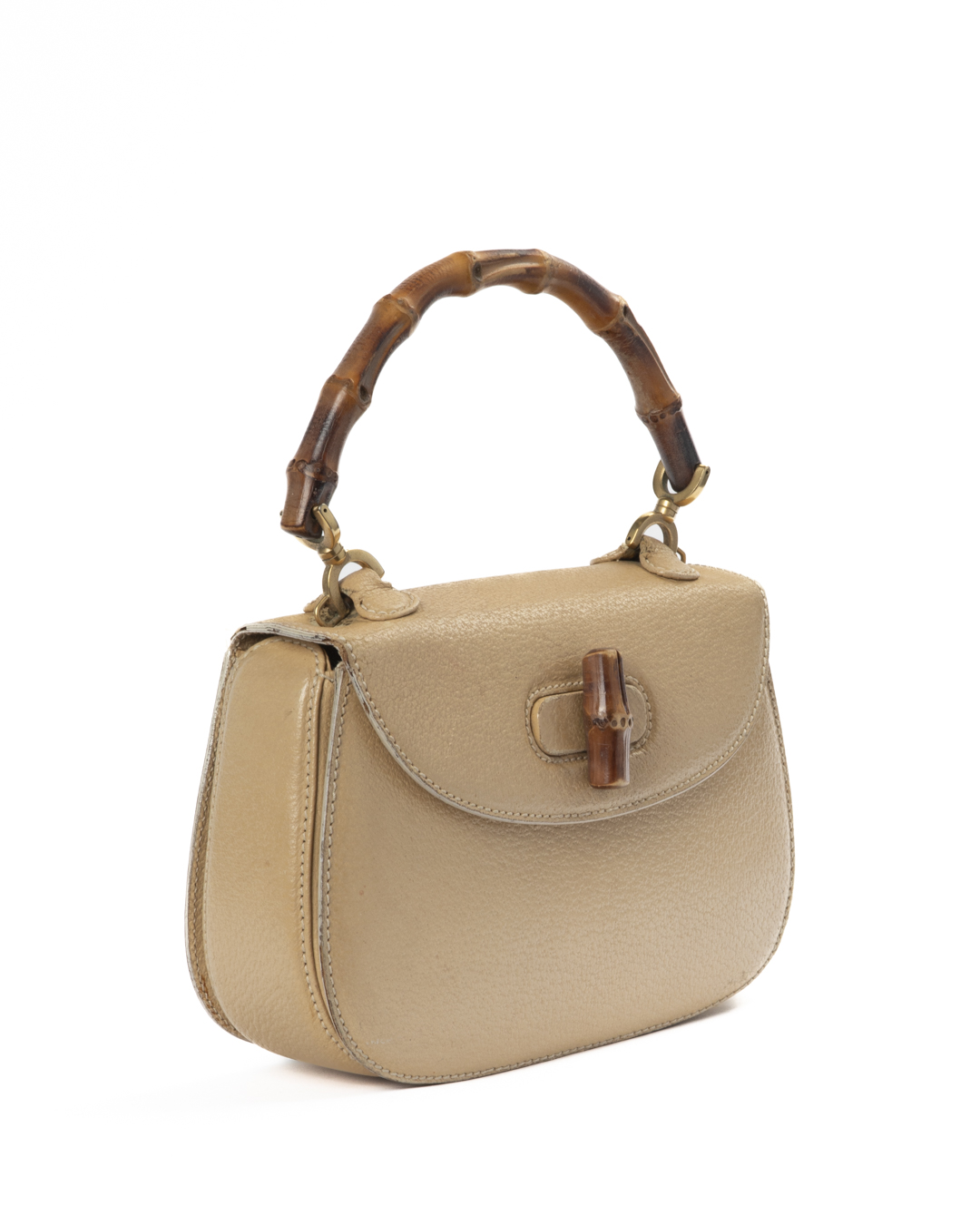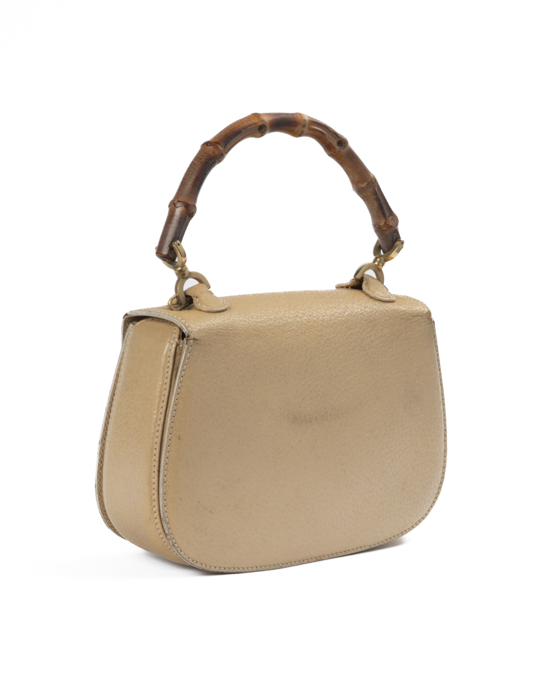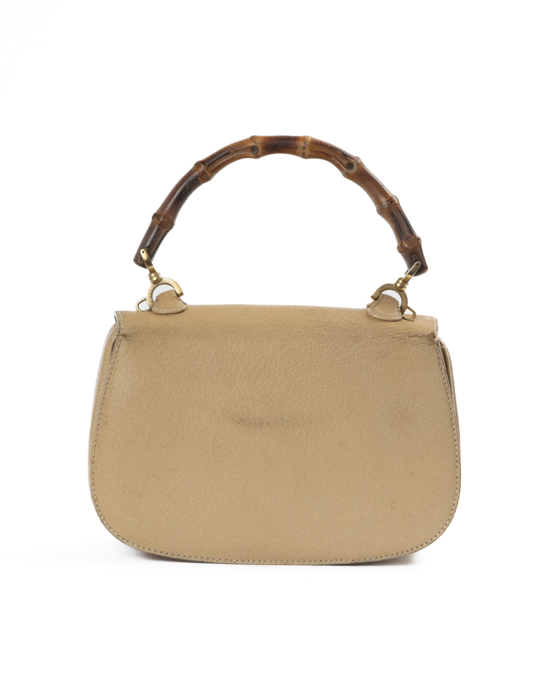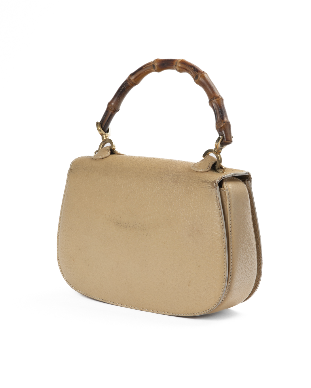 Borsa firmata Gucci, linea Bamboo, modello 1947 nella misurs small, realizzata in pelle beige con hardware dorato. Dotata di una patta con chiusura a girello, internamente rivestita in pelle liscia tono su tono con comode tasche, la borsa è abbastanza capiente. Munita di un manico rigido in bamboo, per una comoda portata a mano. Mancante di tracolla. L'articolo si presenta in buone condizioni, con segni di usura visibili in foto.