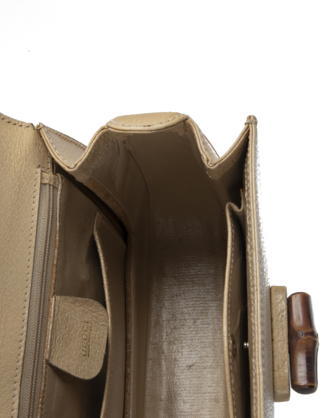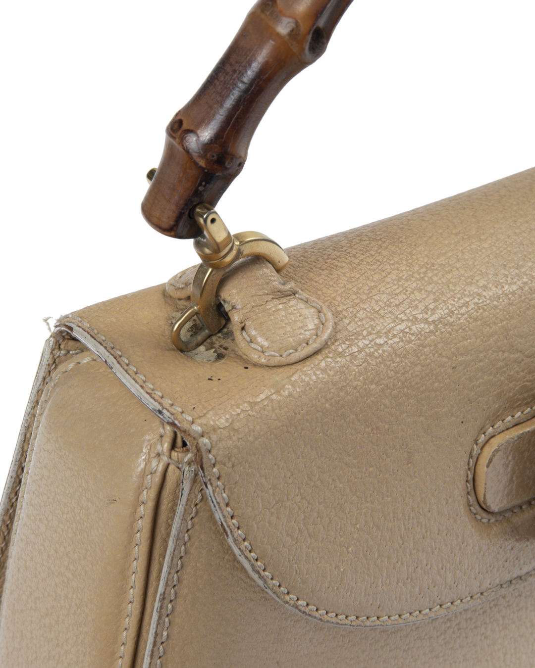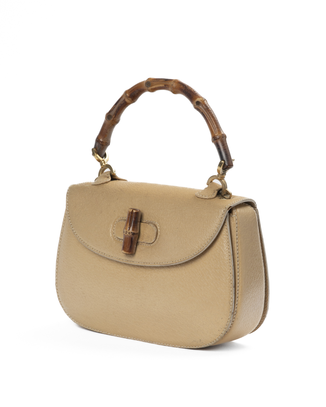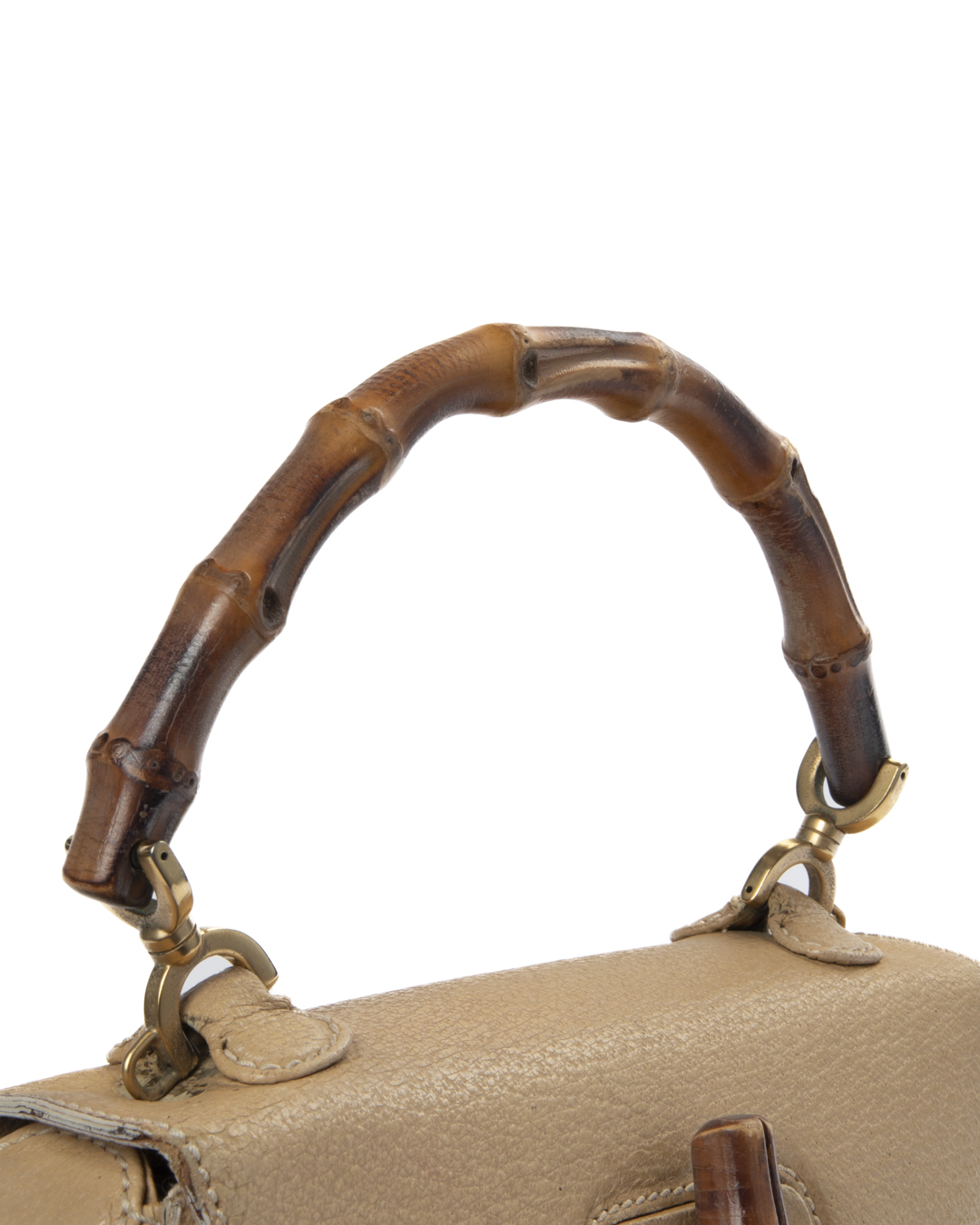 Borsa firmata Gucci, linea Bamboo, modello 1947 nella misurs small, realizzata in pelle beige con hardware dorato. Dotata di una patta con chiusura a girello, internamente rivestita in pelle liscia tono su tono con comode tasche, la borsa è abbastanza capiente. Munita di un manico rigido in bamboo, per una comoda portata a mano. Mancante di tracolla. L'articolo si presenta in buone condizioni, con segni di usura visibili in foto.