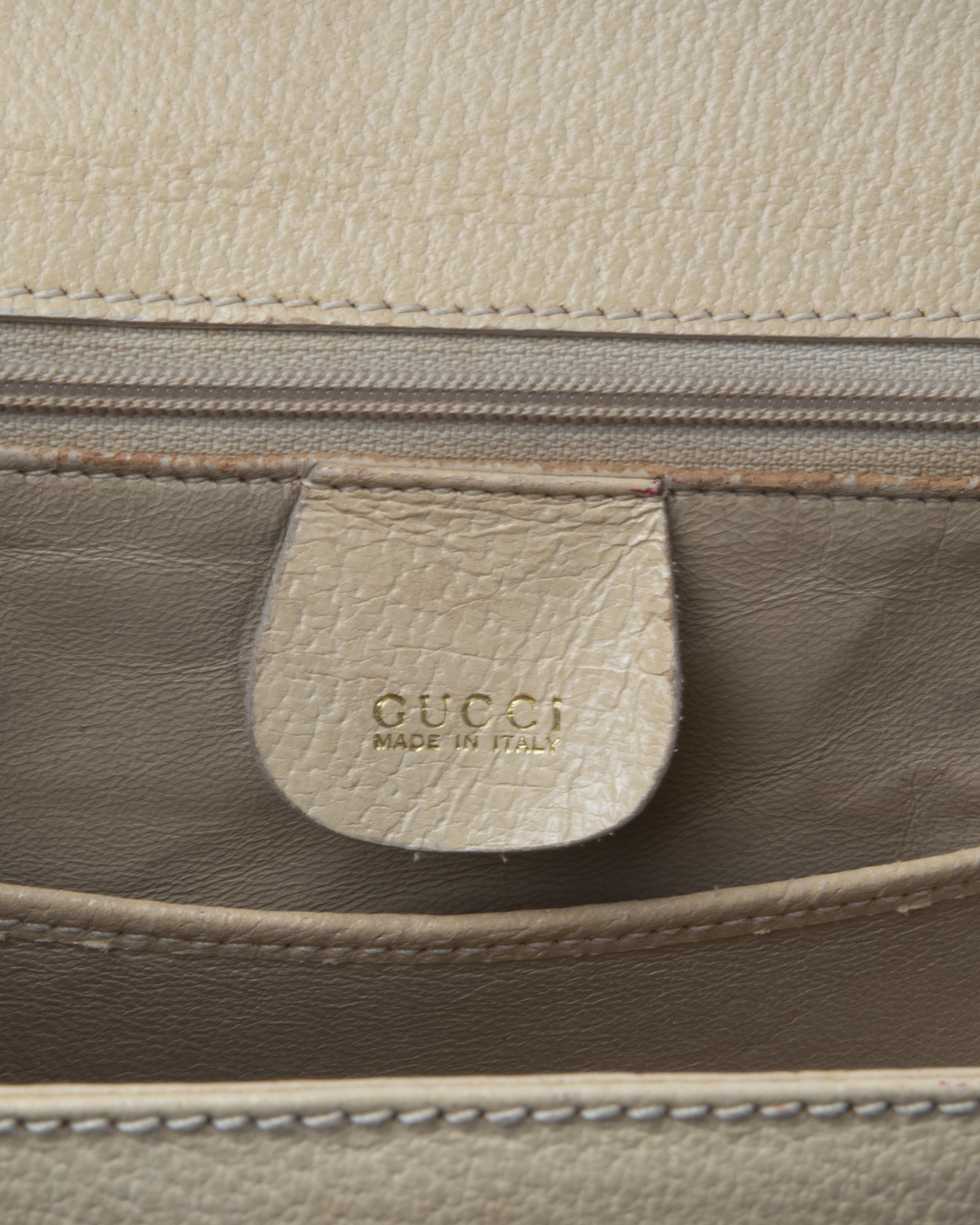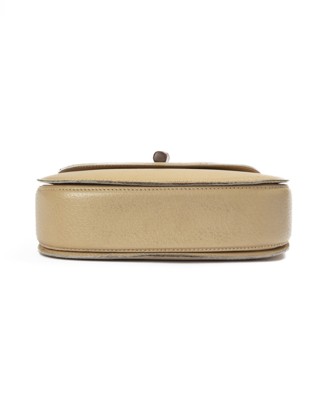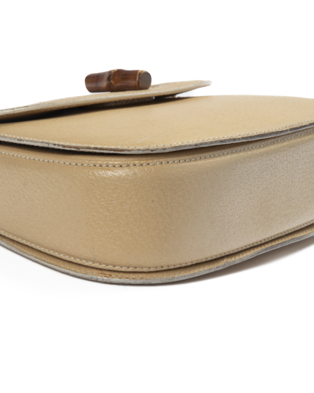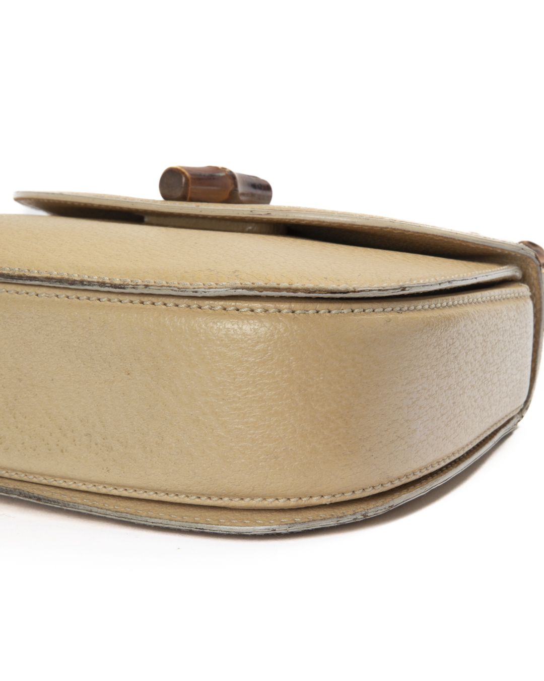 Borsa firmata Gucci, linea Bamboo, modello 1947 nella misurs small, realizzata in pelle beige con hardware dorato. Dotata di una patta con chiusura a girello, internamente rivestita in pelle liscia tono su tono con comode tasche, la borsa è abbastanza capiente. Munita di un manico rigido in bamboo, per una comoda portata a mano. Mancante di tracolla. L'articolo si presenta in buone condizioni, con segni di usura visibili in foto.