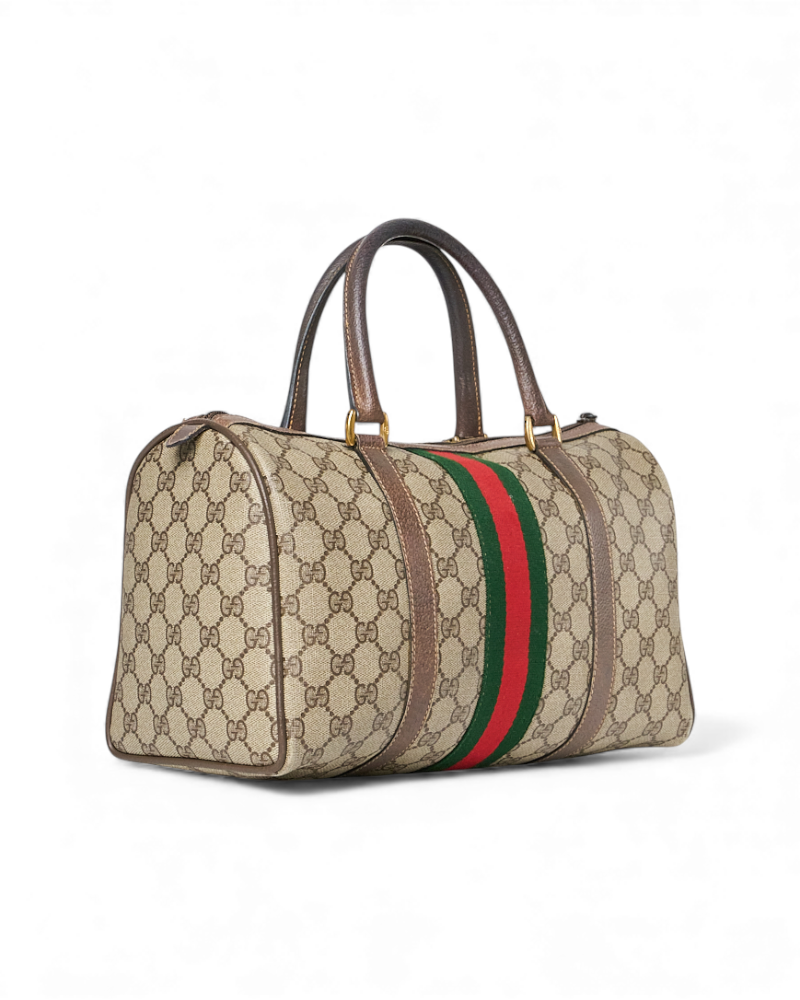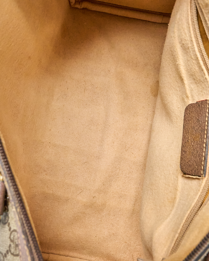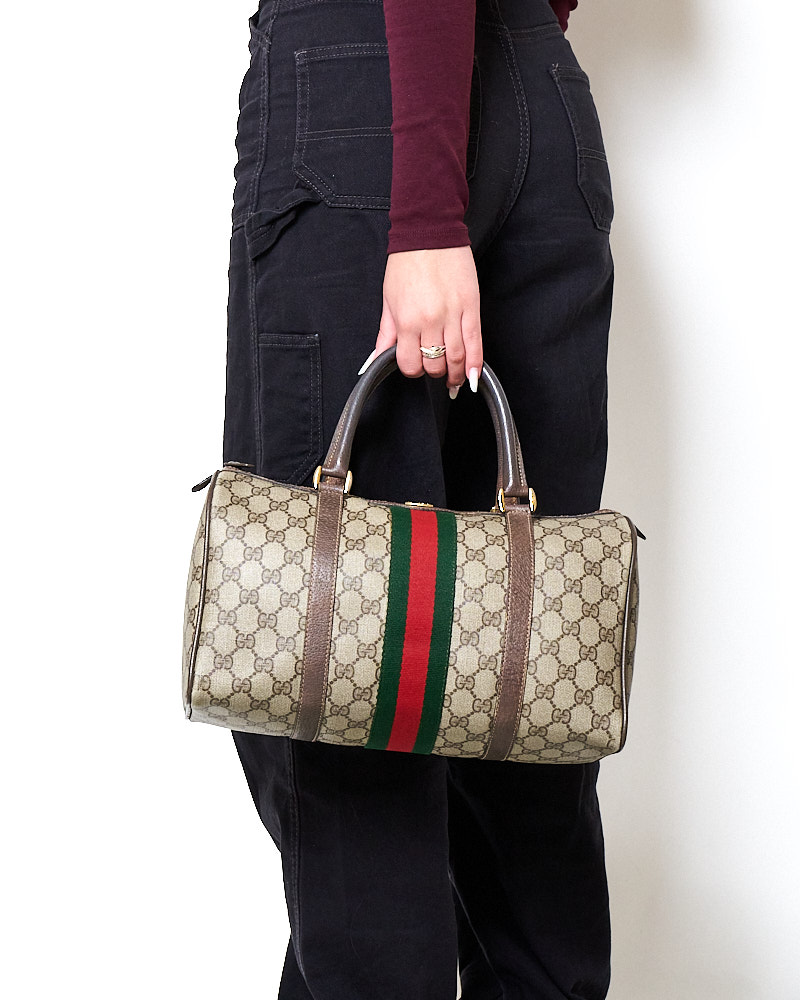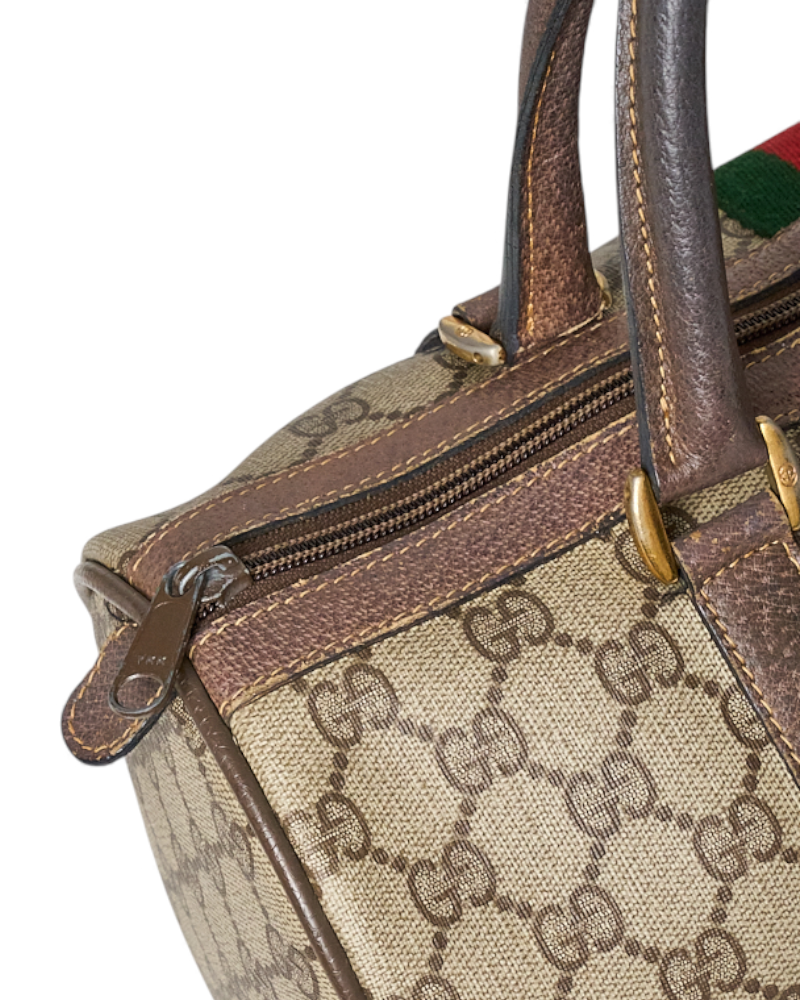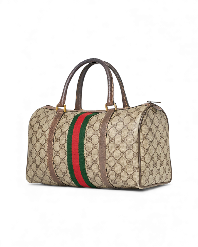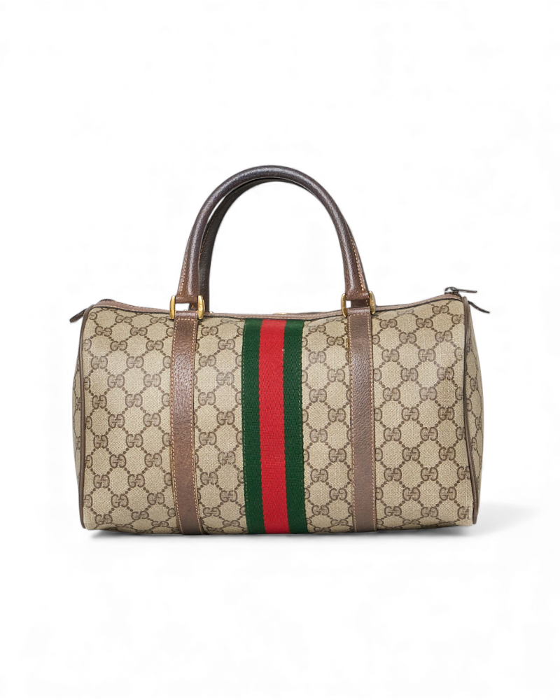 Borsa firmata Gucci, linea Vintage, modello Bauletto nella misura medium, realizzato in tela marrone nella classica fantasia GG Supreme con inserti in pelle marrone e hardware dorato. Dotato di una chiusura superiore a zip, internamente rivestito in tessuto scamosciato beige con comoda tasca, la borsa è abbastanza capiente. Munito di doppio manico in pelle, per una comoda portata a mano. L’articolo si presenta in buone condizioni, con segni di usura visibili in foto.
