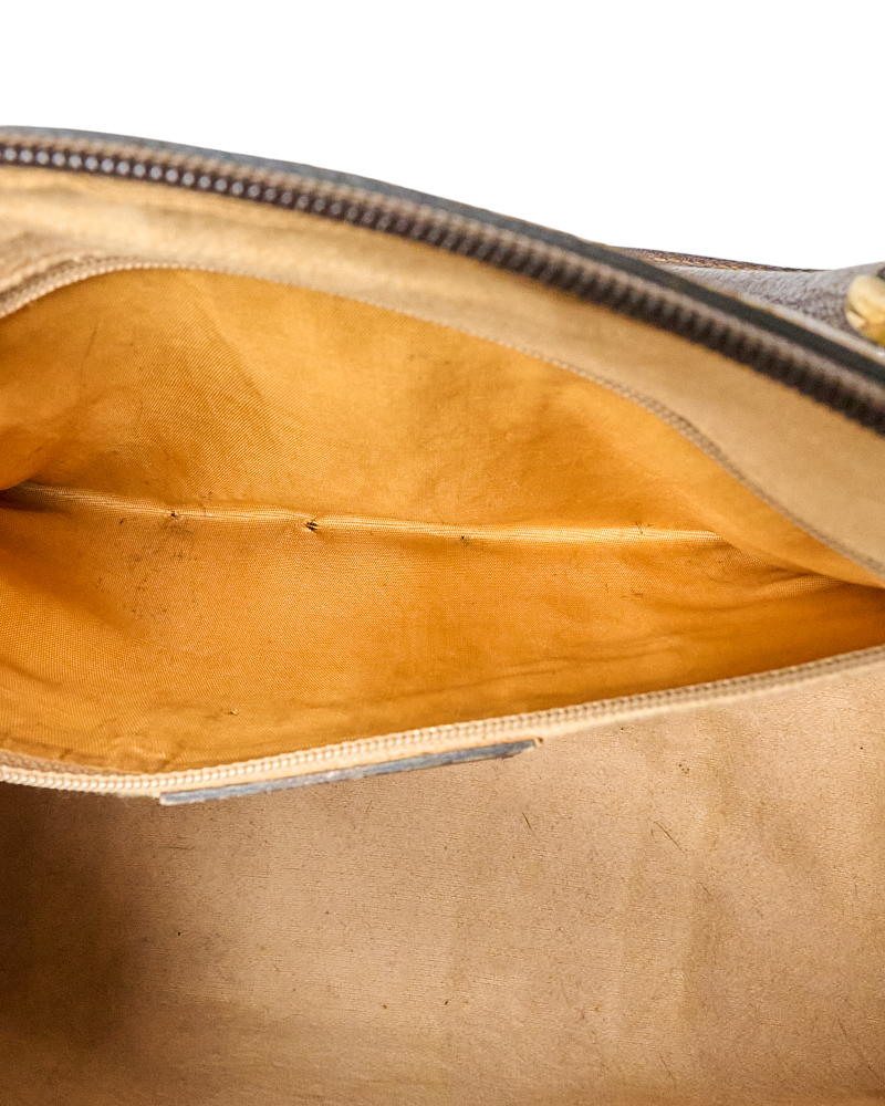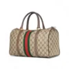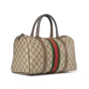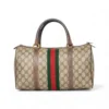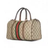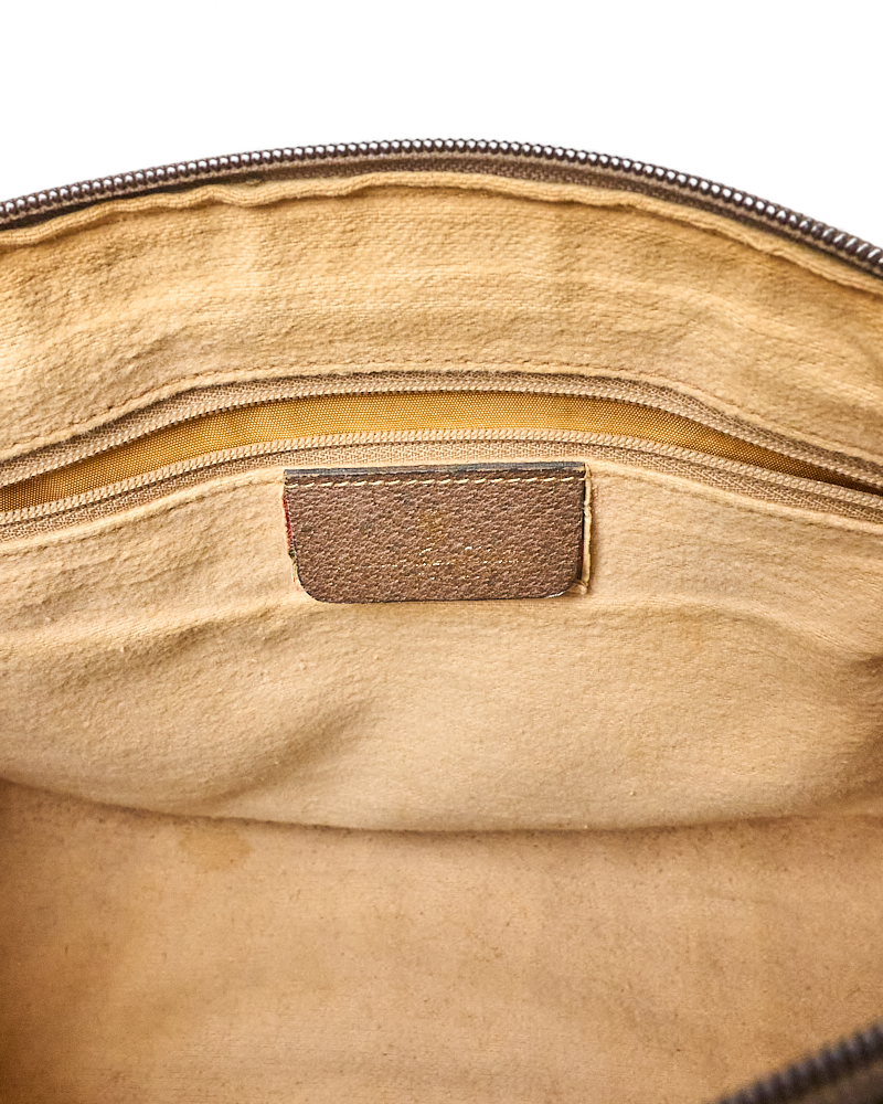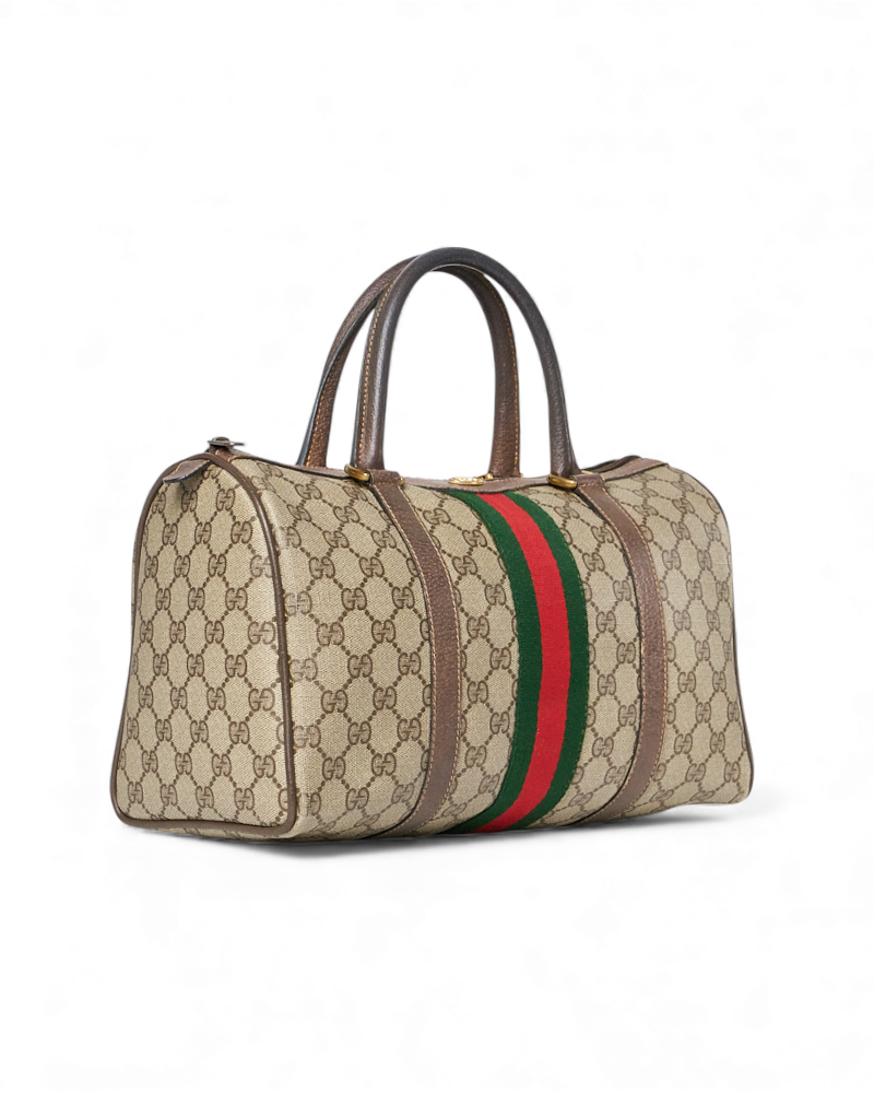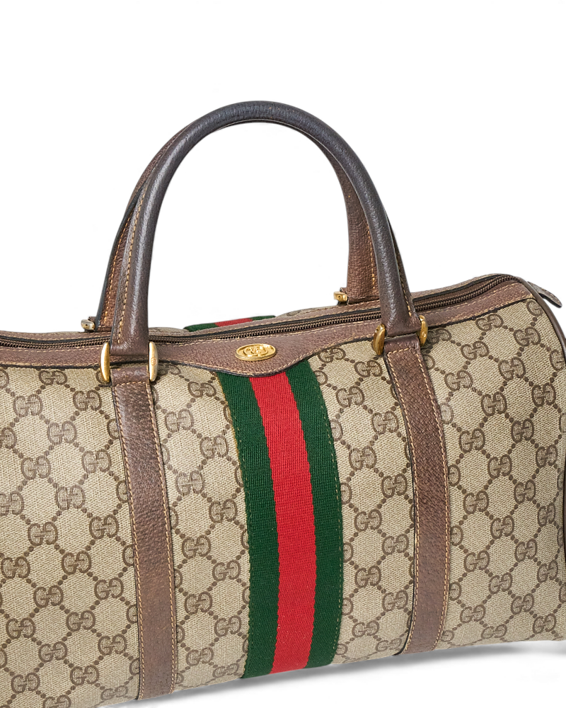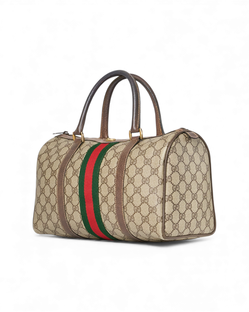 Borsa firmata Gucci, linea Vintage, modello Bauletto nella misura medium, realizzato in tela marrone nella classica fantasia GG Supreme con inserti in pelle marrone e hardware dorato. Dotato di una chiusura superiore a zip, internamente rivestito in tessuto scamosciato beige con comoda tasca, la borsa è abbastanza capiente. Munito di doppio manico in pelle, per una comoda portata a mano. L’articolo si presenta in buone condizioni, con segni di usura visibili in foto.
