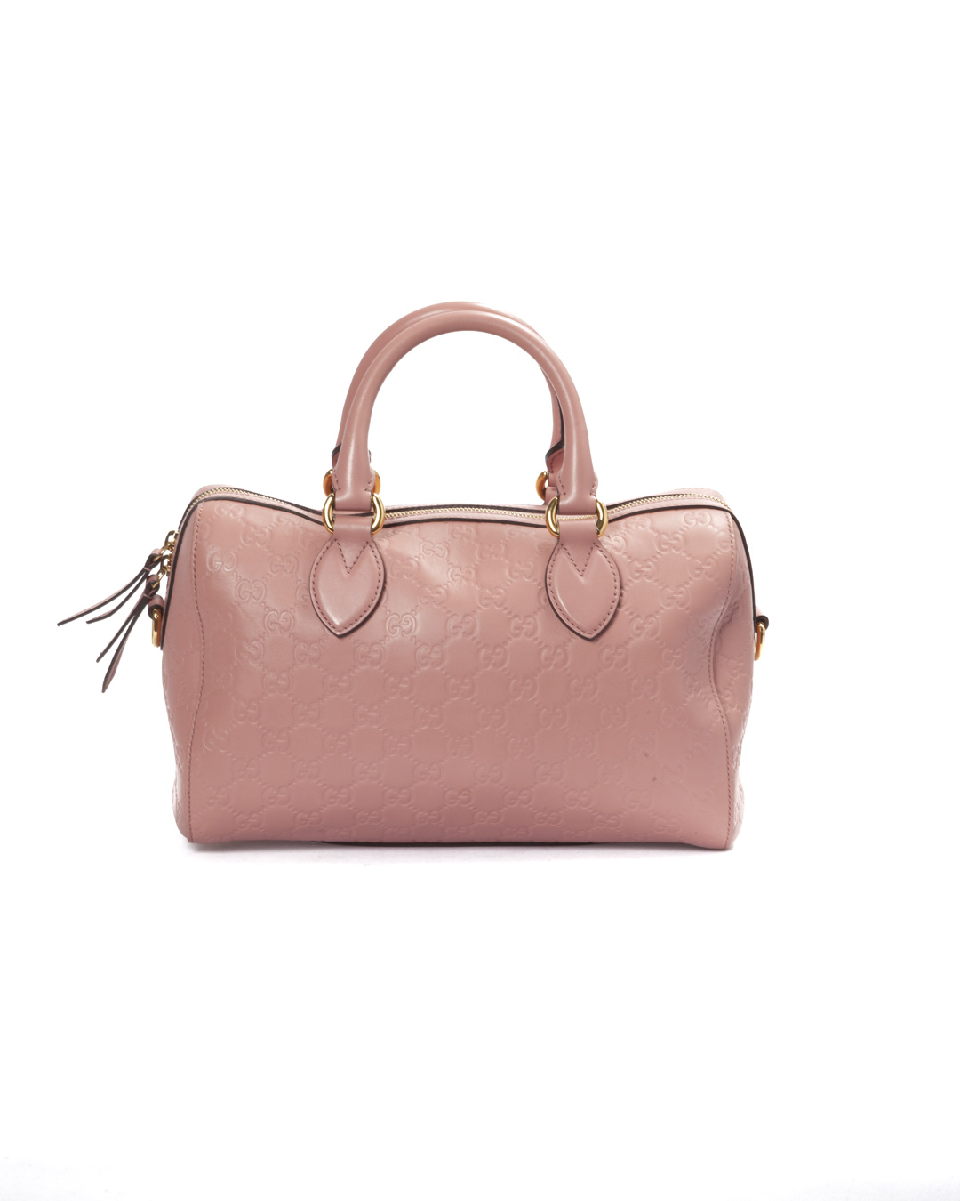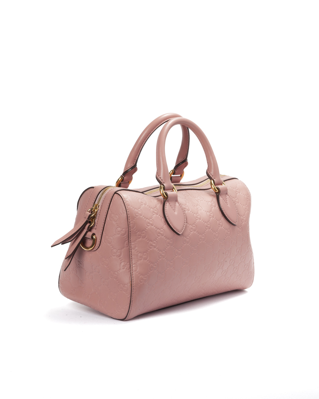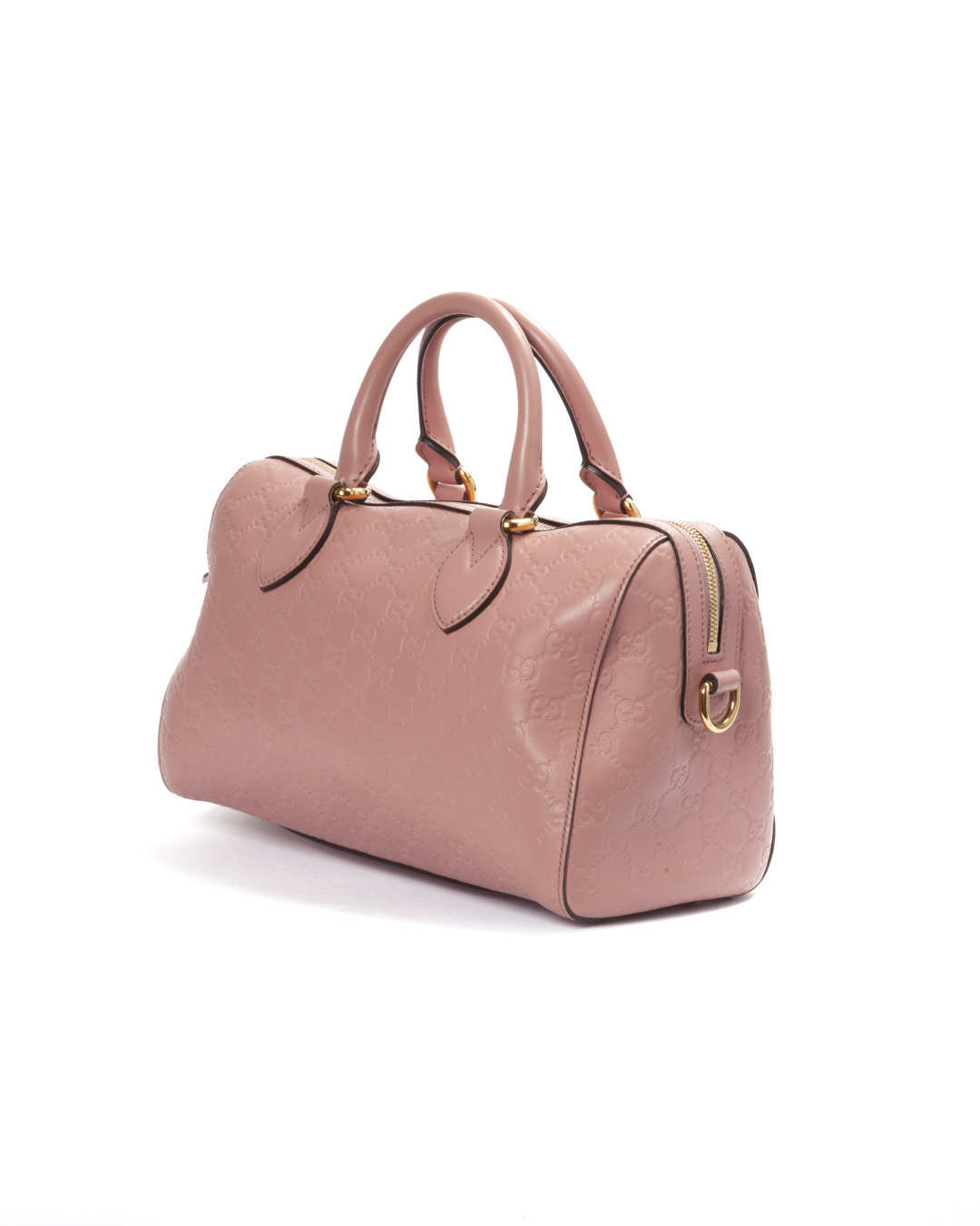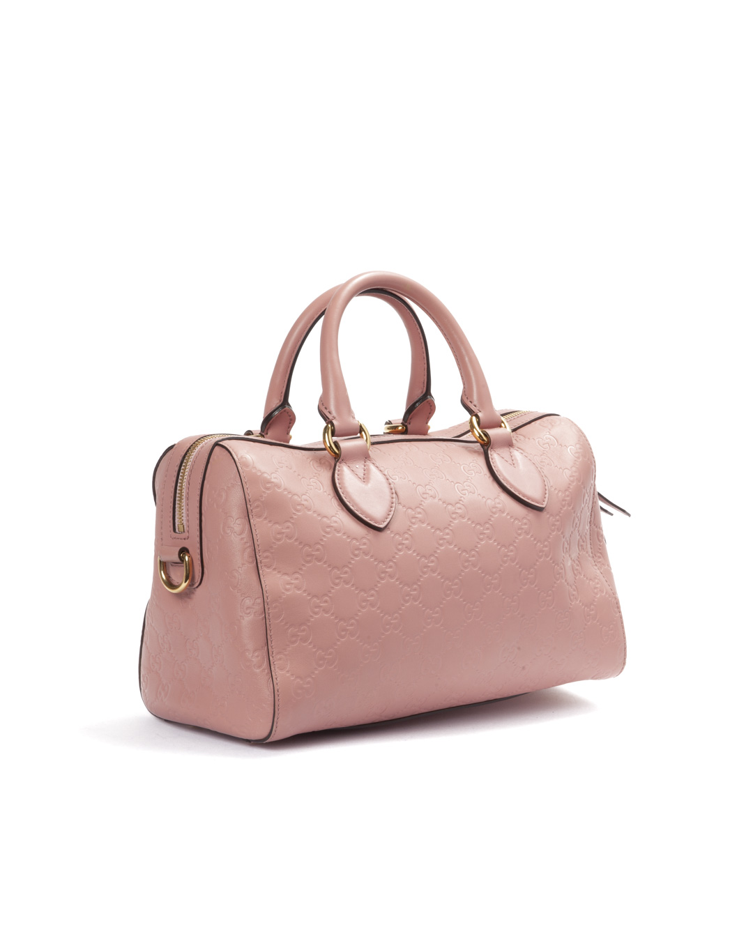 Borsa firmata Gucci, modello boston nella misura small, realizzata in pelle rosa nella fantasia GG Guccissima con hardware dorato. Dotata di una chiusura superiore a zip con doppio cursore, internamente rivestita in tessuto scamosciato beige con comode tasche, la borsa è abbastanza capiente. Munita di doppio manico e di una tracolla rimovibile e regolabile, per una comoda portata a mano o a spalla. L’articolo si presenta in ottime condizioni.