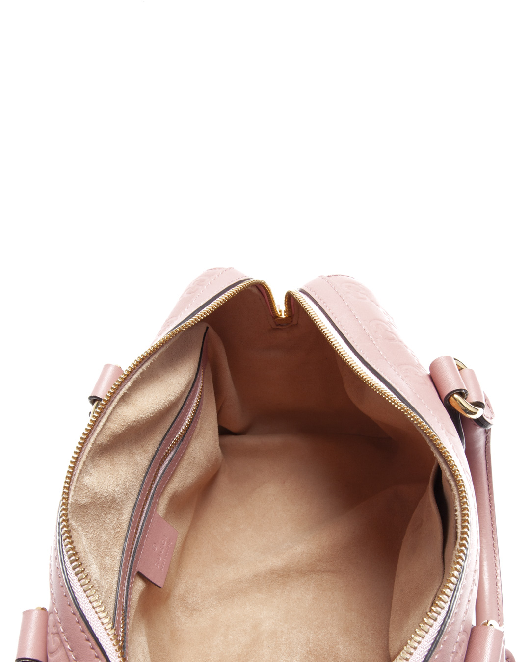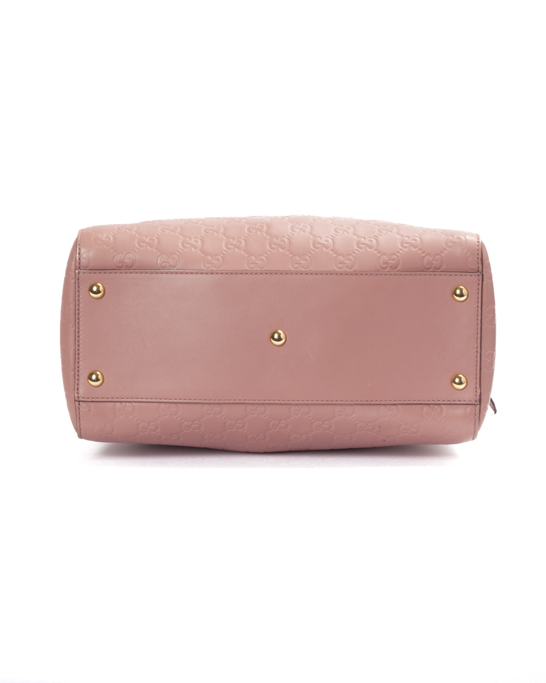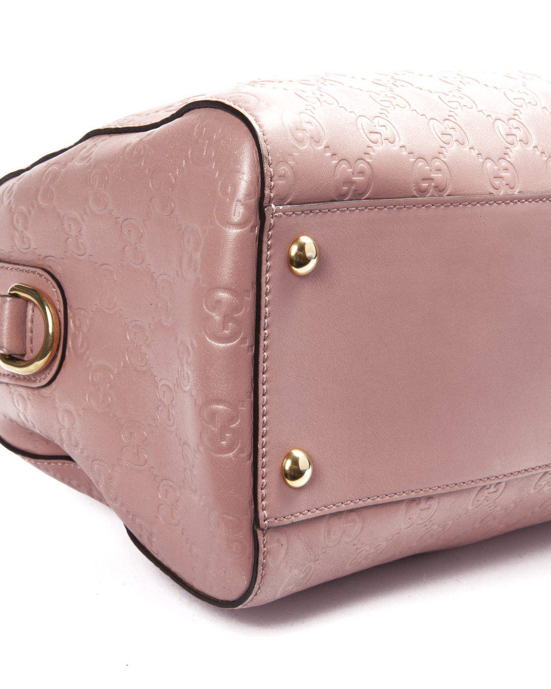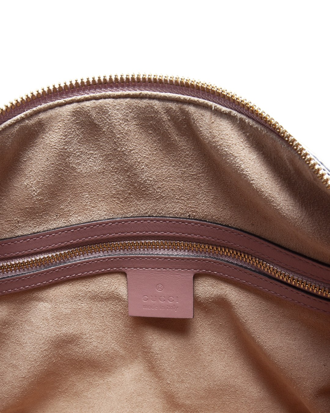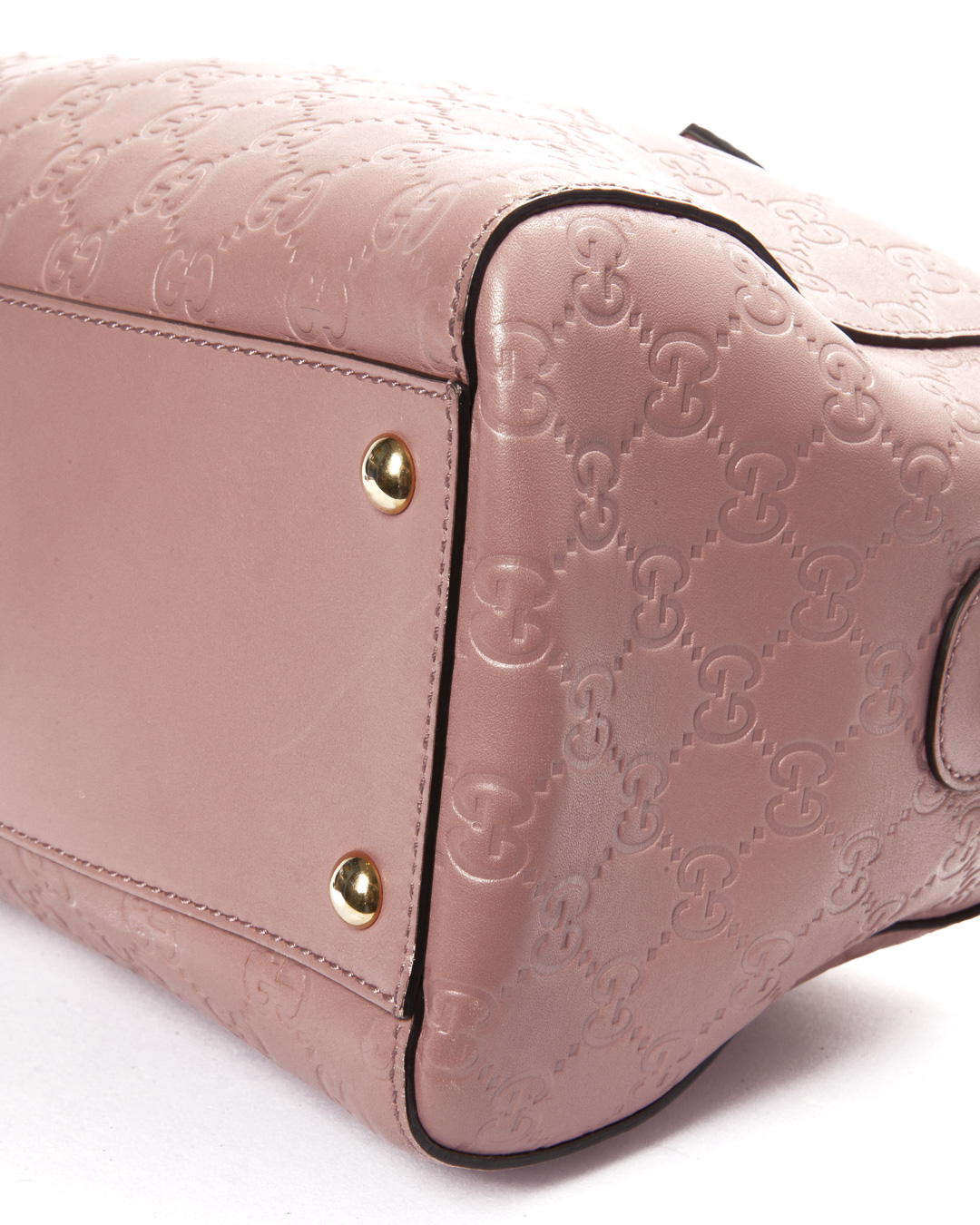 Borsa firmata Gucci, modello boston nella misura small, realizzata in pelle rosa nella fantasia GG Guccissima con hardware dorato. Dotata di una chiusura superiore a zip con doppio cursore, internamente rivestita in tessuto scamosciato beige con comode tasche, la borsa è abbastanza capiente. Munita di doppio manico e di una tracolla rimovibile e regolabile, per una comoda portata a mano o a spalla. L’articolo si presenta in ottime condizioni.