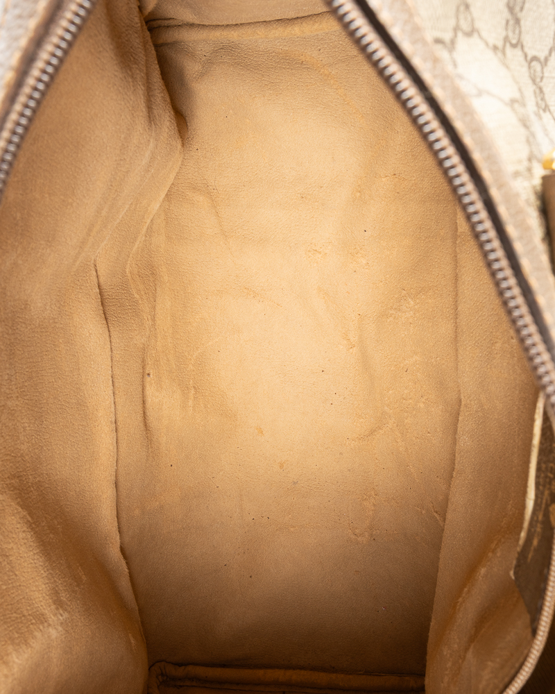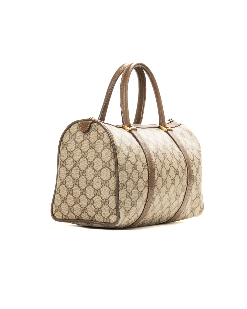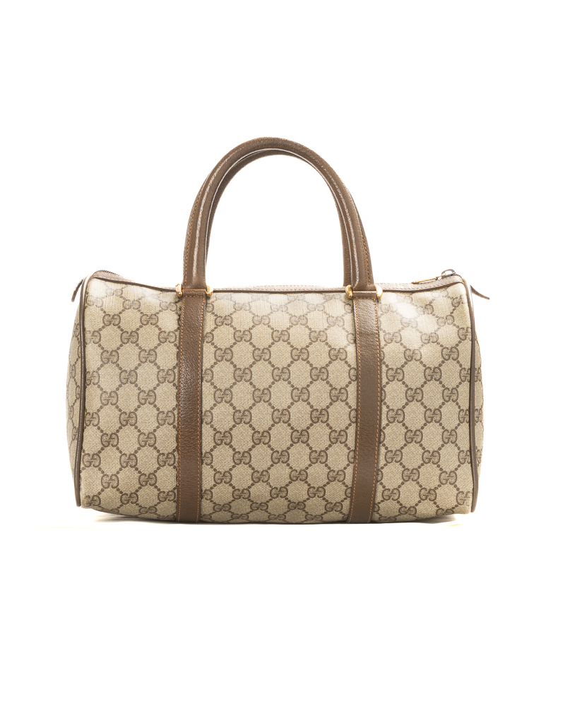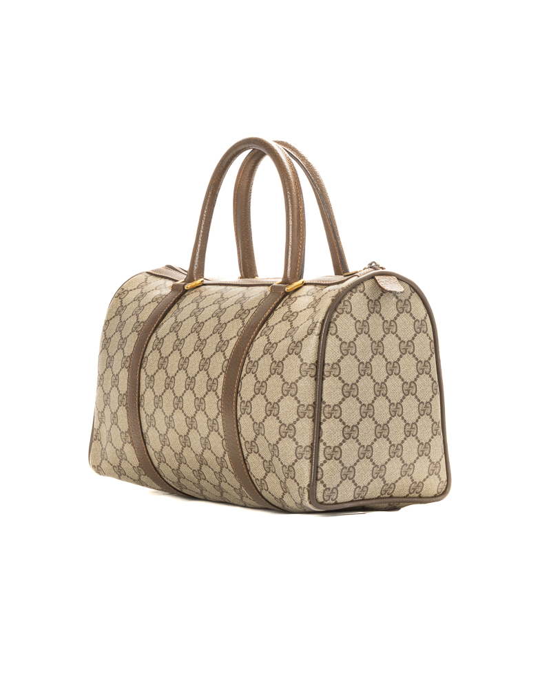 Borsa firmata Gucci, linea Vintage, modello Boston nella misura medium, realizzato in tela nella fantasia GG Supreme con inserti in pelle marrone e hardware dorato. Dotato di una chiusura superiore a zip, internamente rivestito in pelle beige con comoda tasca, la borsa è molto capiente. Munito di doppio manico in pelle, per una comoda portata a mano. L’articolo si presenta in buone condizioni, con usure interne, visibili in foto.