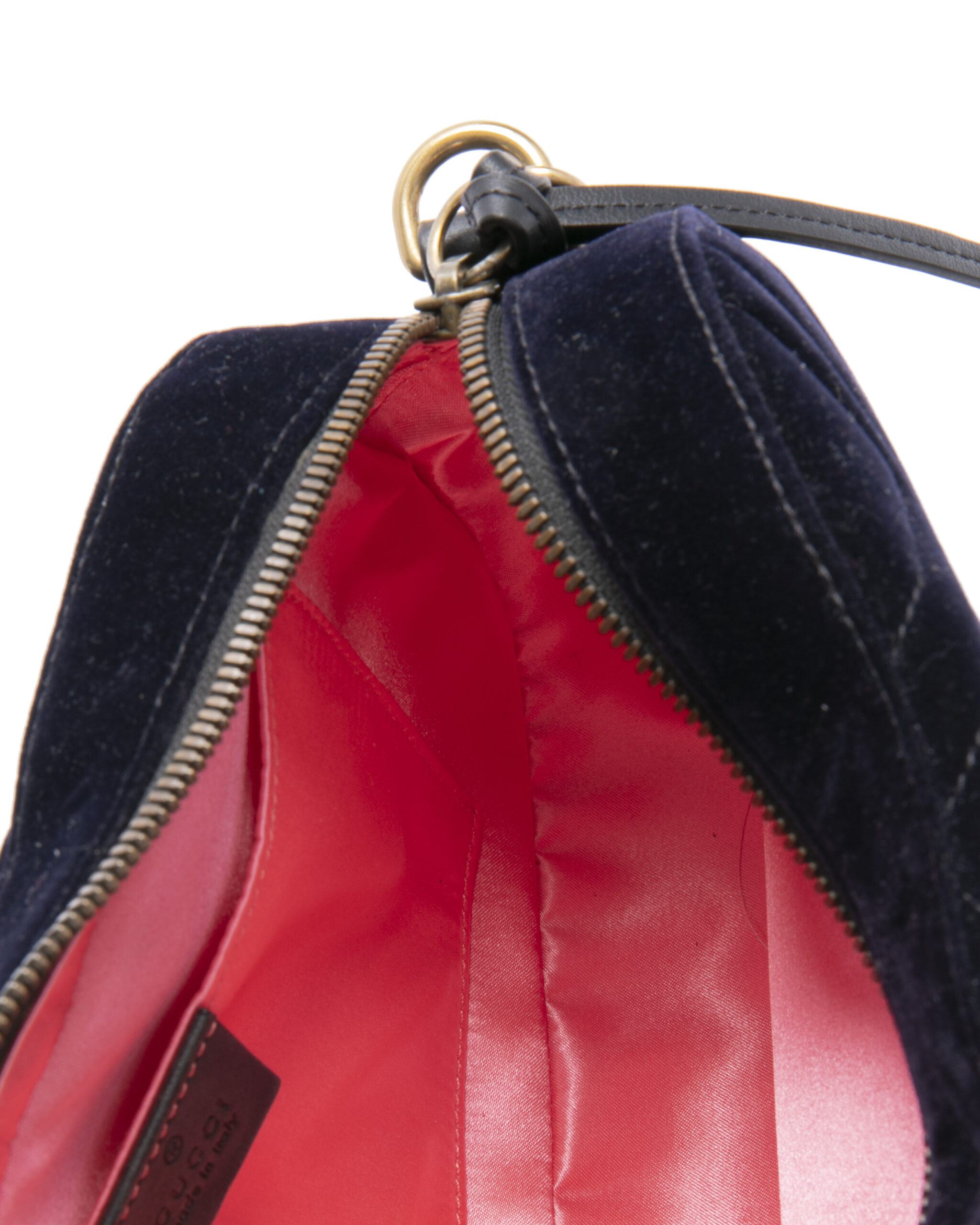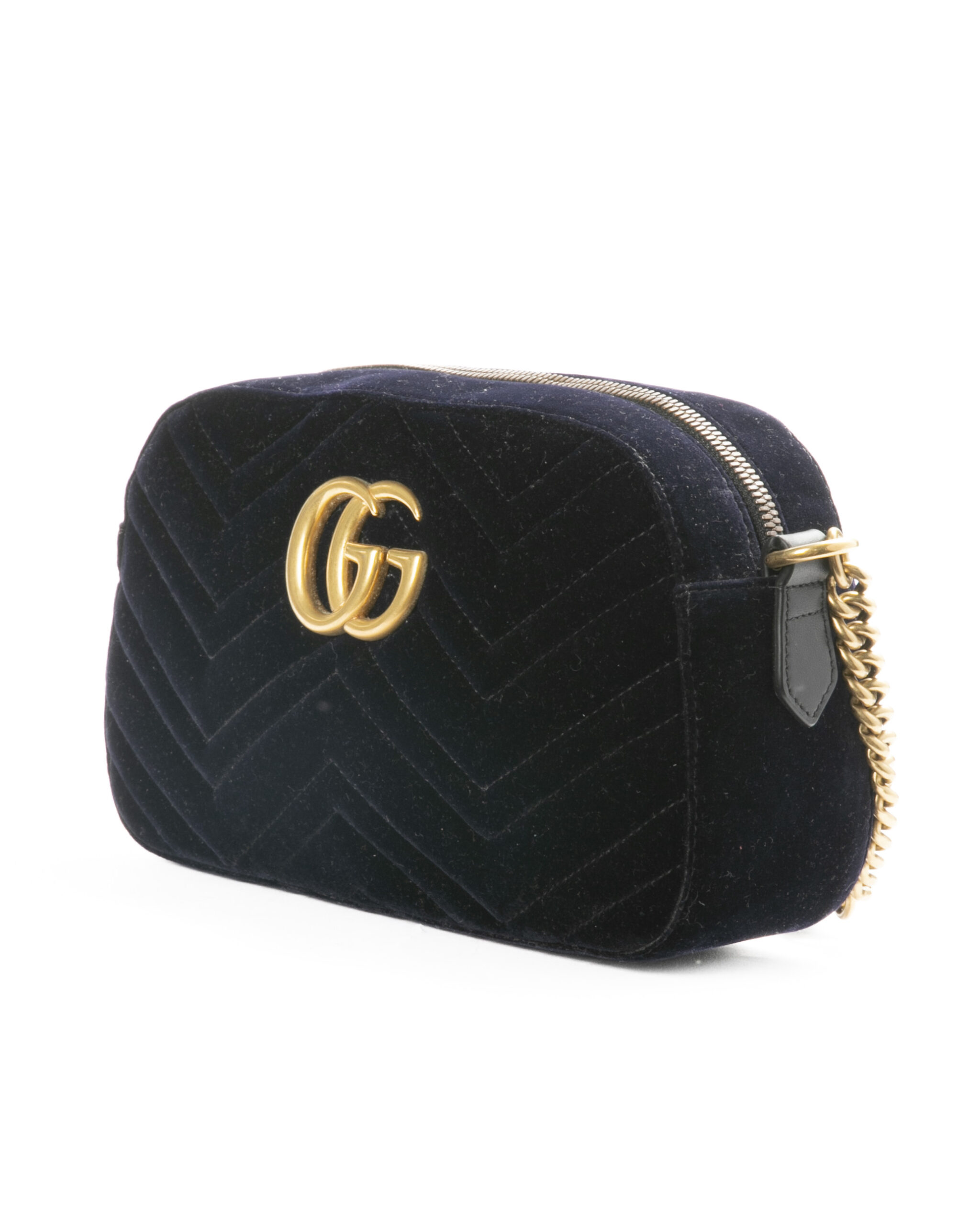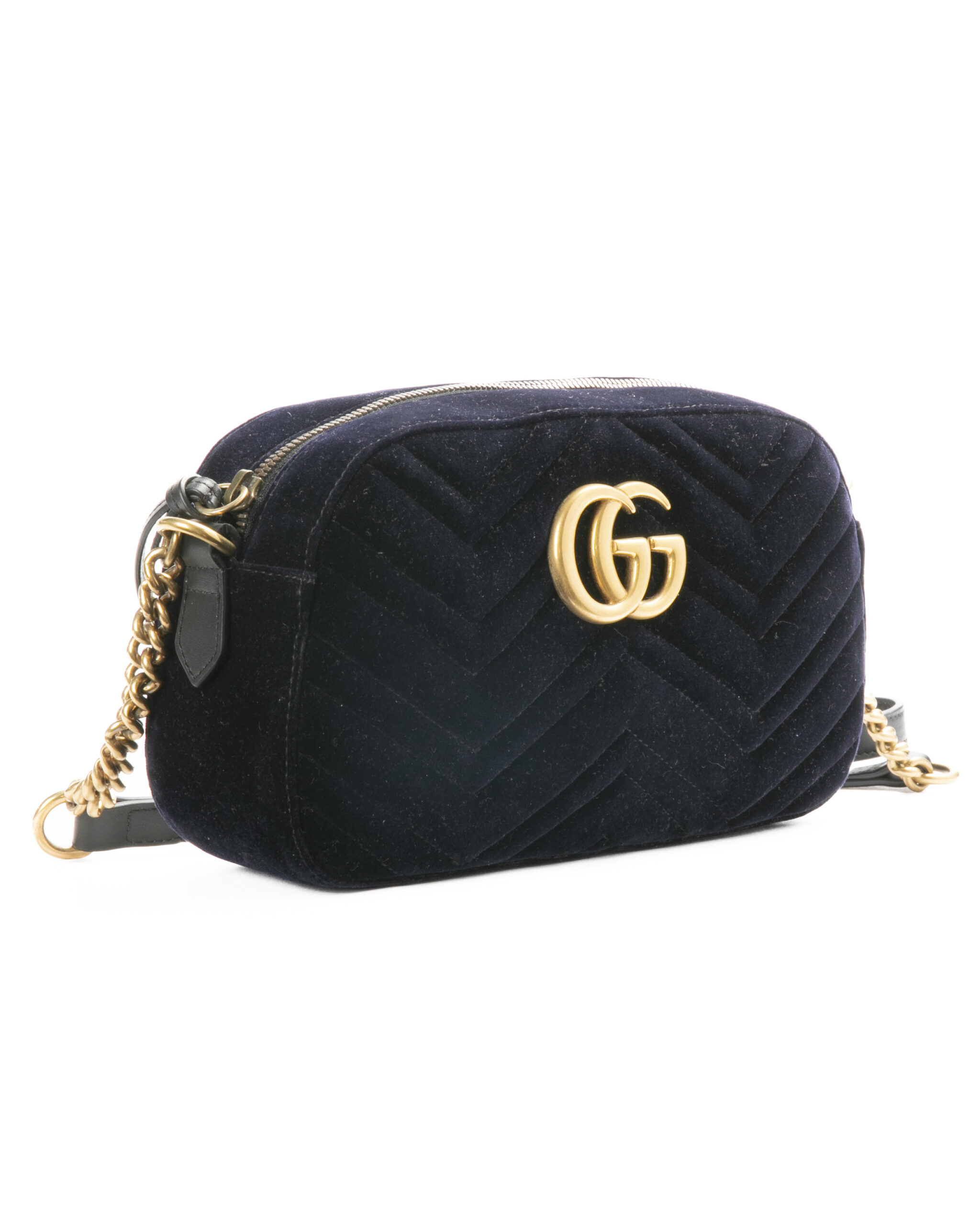 Borsa firmata Gucci, linea marmont, modello camera bag nella misura medium, realizzata in velluto blu con inserti in pelle e hardware dorato. Dotata di una chiusura superiore a zip, internamente rivestita in raso rosa con piccola tasca, la borsa è abbastanza capiente. Munita di una tracolla in pelle e catena regolabile, per una comoda portata a spalla o a tracolla. Arricchita dal classico logo del brand “GG” sulla parte frontale. L’articolo si presenta in ottime condizioni.