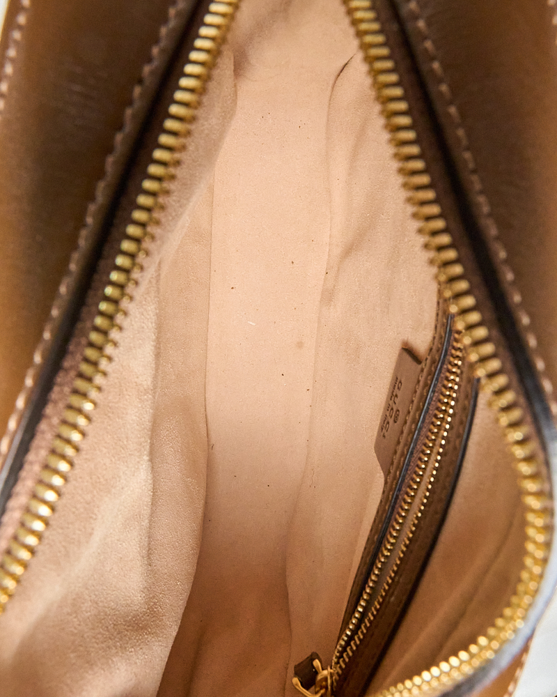 Borsa firmata Gucci, linea Horsebit, modello camera bag nella misura medium, realizzata in tela nella classica fantasia GG Supreme con inserti in pelle marrone e hardware dorato. Dotata di una chiusura superiore a zip, internamente rivestita in tessuto scamosciato beige con comoda tasca, la borsa è abbastanza capiente. Munita di una tracolla regolabile, per una comoda portata a spalla o a tracolla. Arricchita da due tasche sulla parte frontale. L’articolo si presenta in condizioni pari al nuovo.