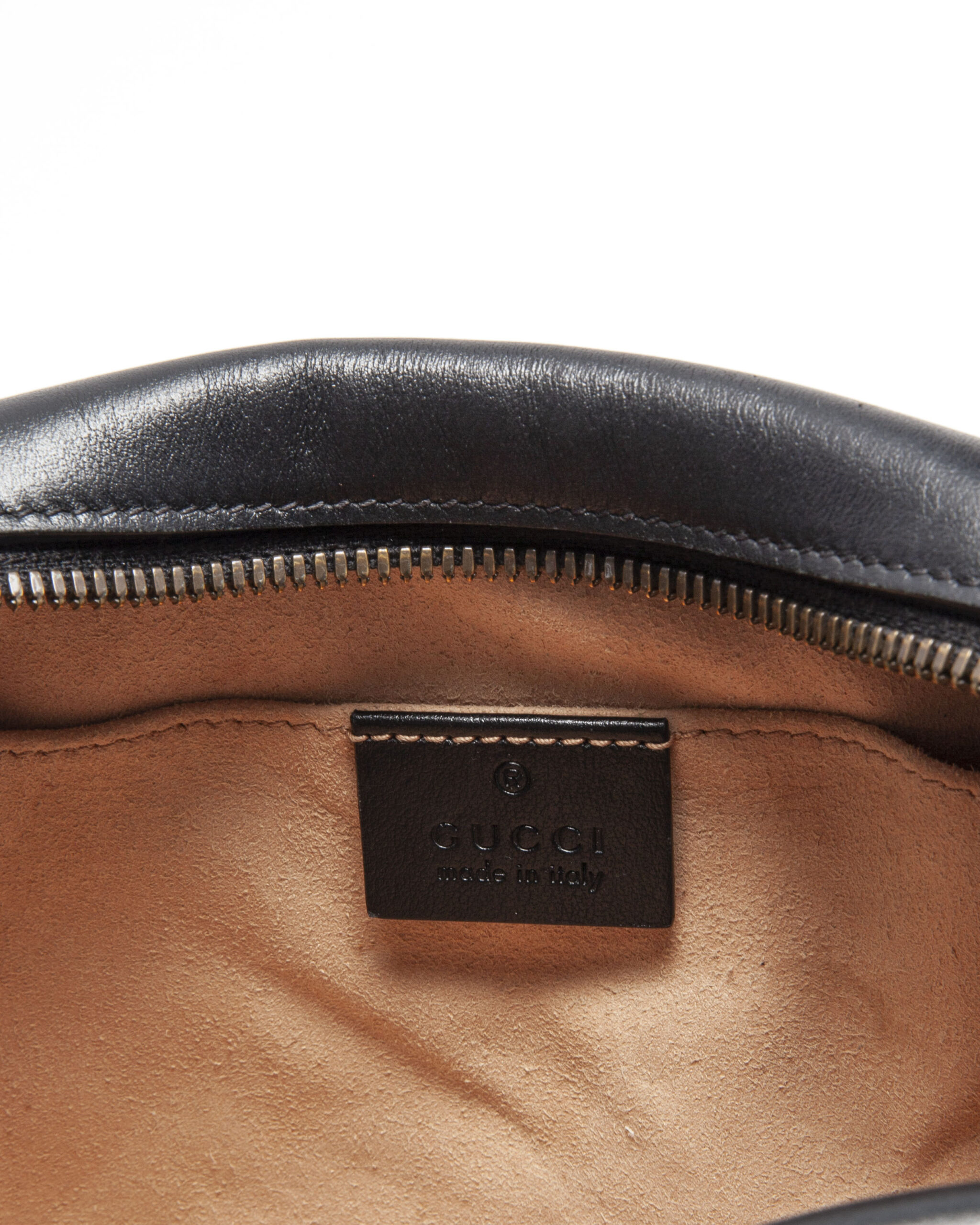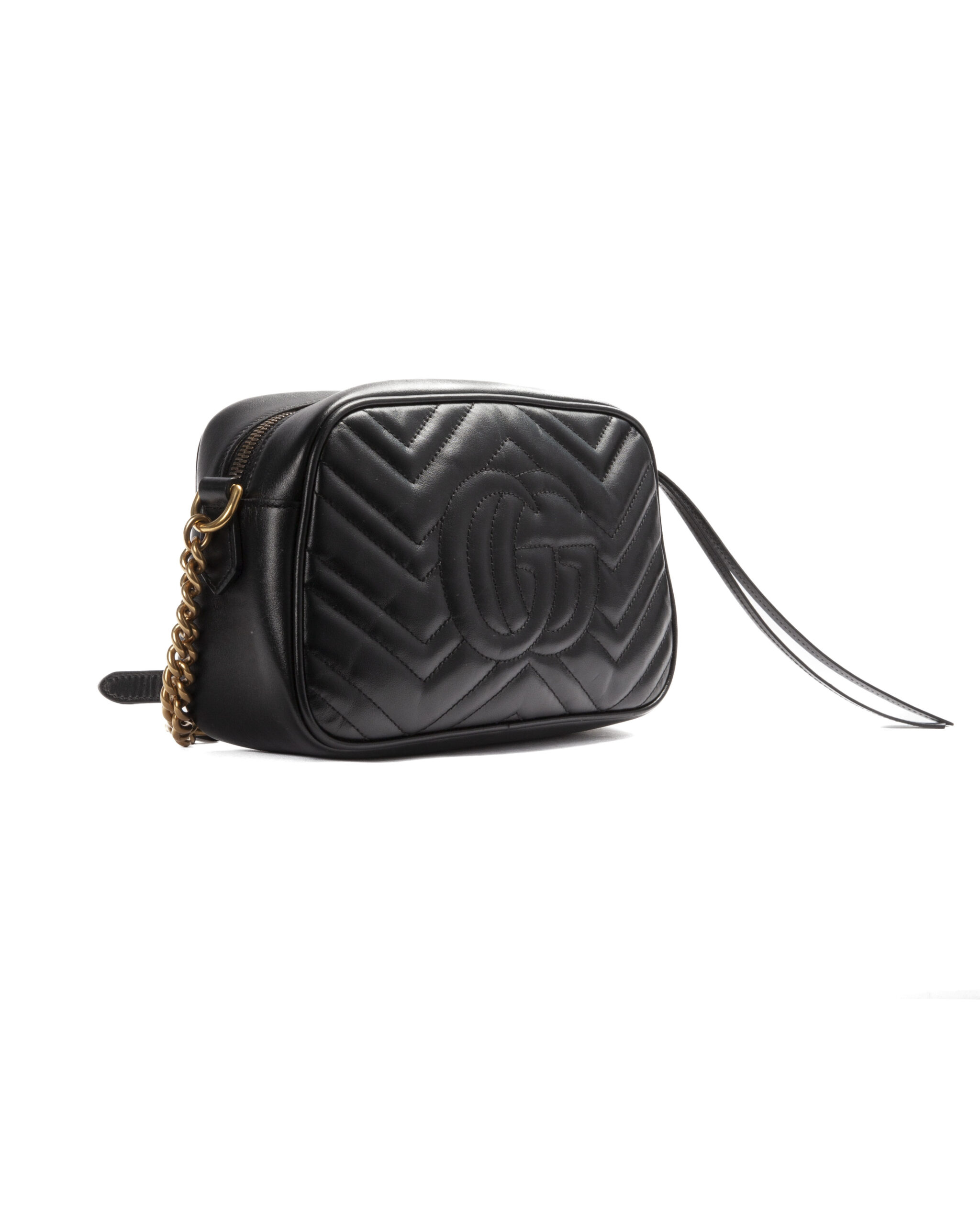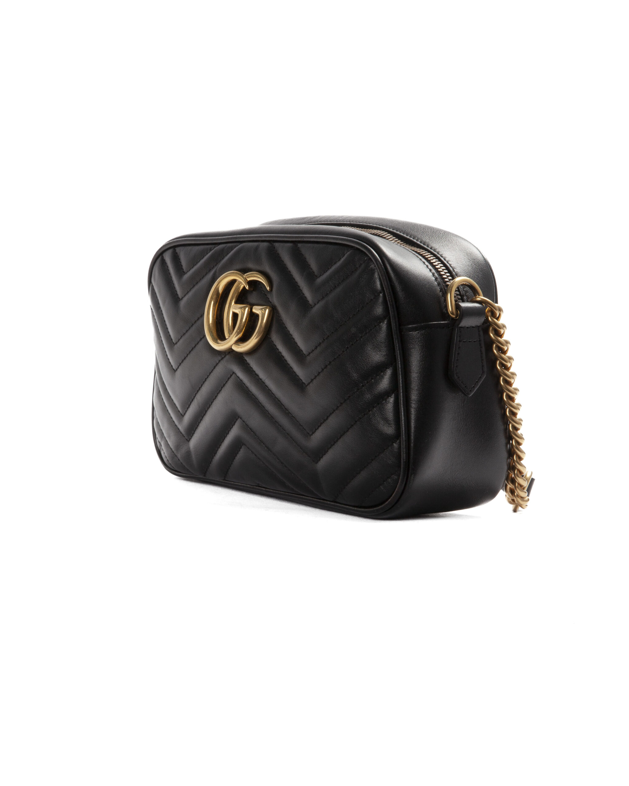 Borsa firmata Gucci, linea marmont, modello camera bag, realizzata in pelle nera con motivo matelassè e hardware dorato. Dotata di una chiusura superiore a zip, internamente rivestita in tessuto scamosciato con comoda tasca, la borsa è abbastanza capiente. Munito di una tracolla regolabile in pelle e catena, per una comoda portata a spalla o a tracolla. L’articolo si presenta in buone condizioni, con segni di usura visibili in foto.