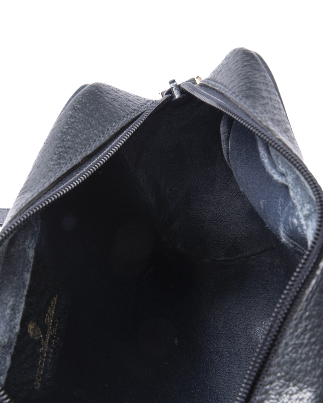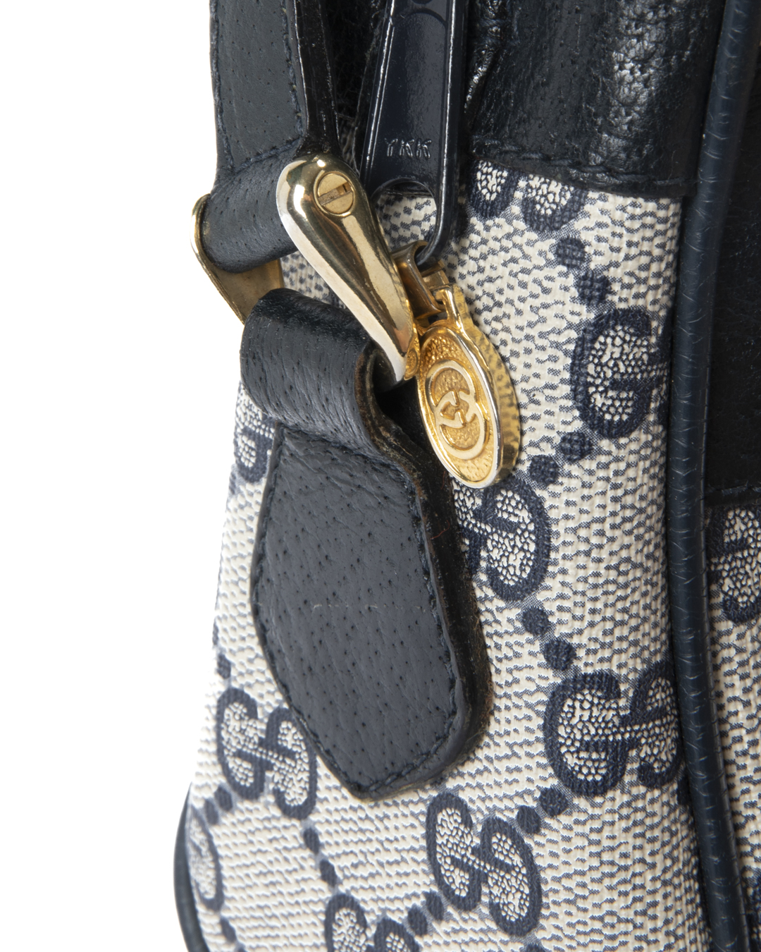 Borsa firmata Gucci, linea Vintage, modello Camera Bag nella misura medium, realizzata in tela nella classica fantasia GG Supreme con inserti in pelle blu e hardware dorato. Dotata di una chiusura superiore a zip, internamente rivestita in tessuto scamosciato tono su tono con comoda tasca, la borsa è abbastanza capiente. Munita di una tracolla regolabile in pelle, per una comoda portata a mano o a spalla. L’articolo si presenta in buone condizioni, con segni di usura visibili in foto.