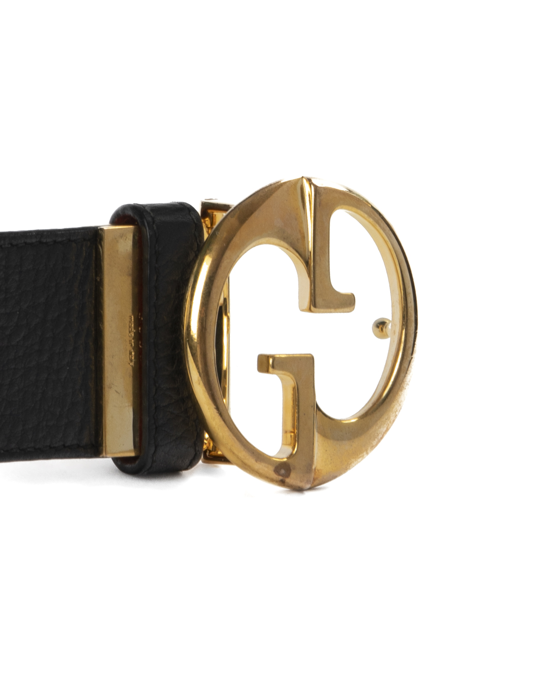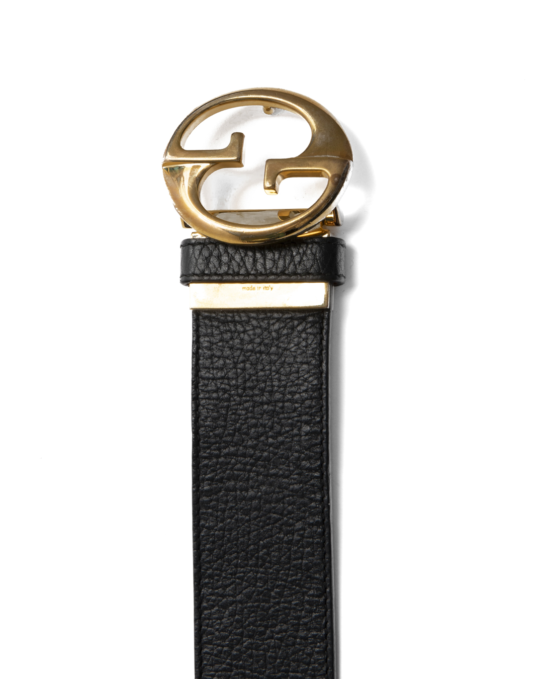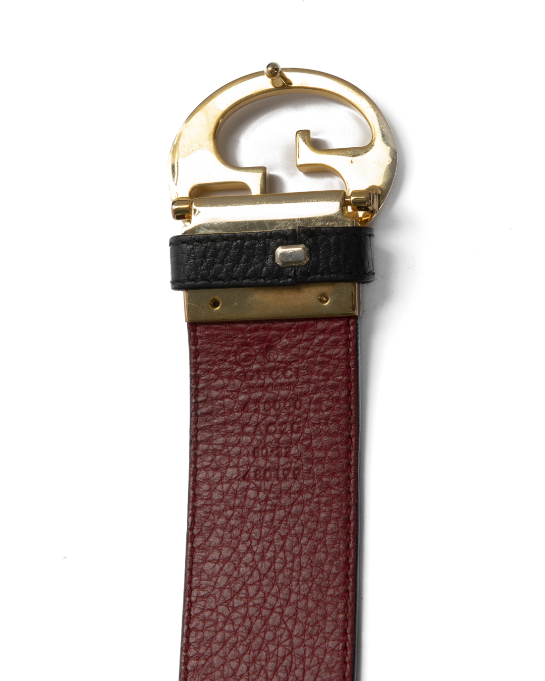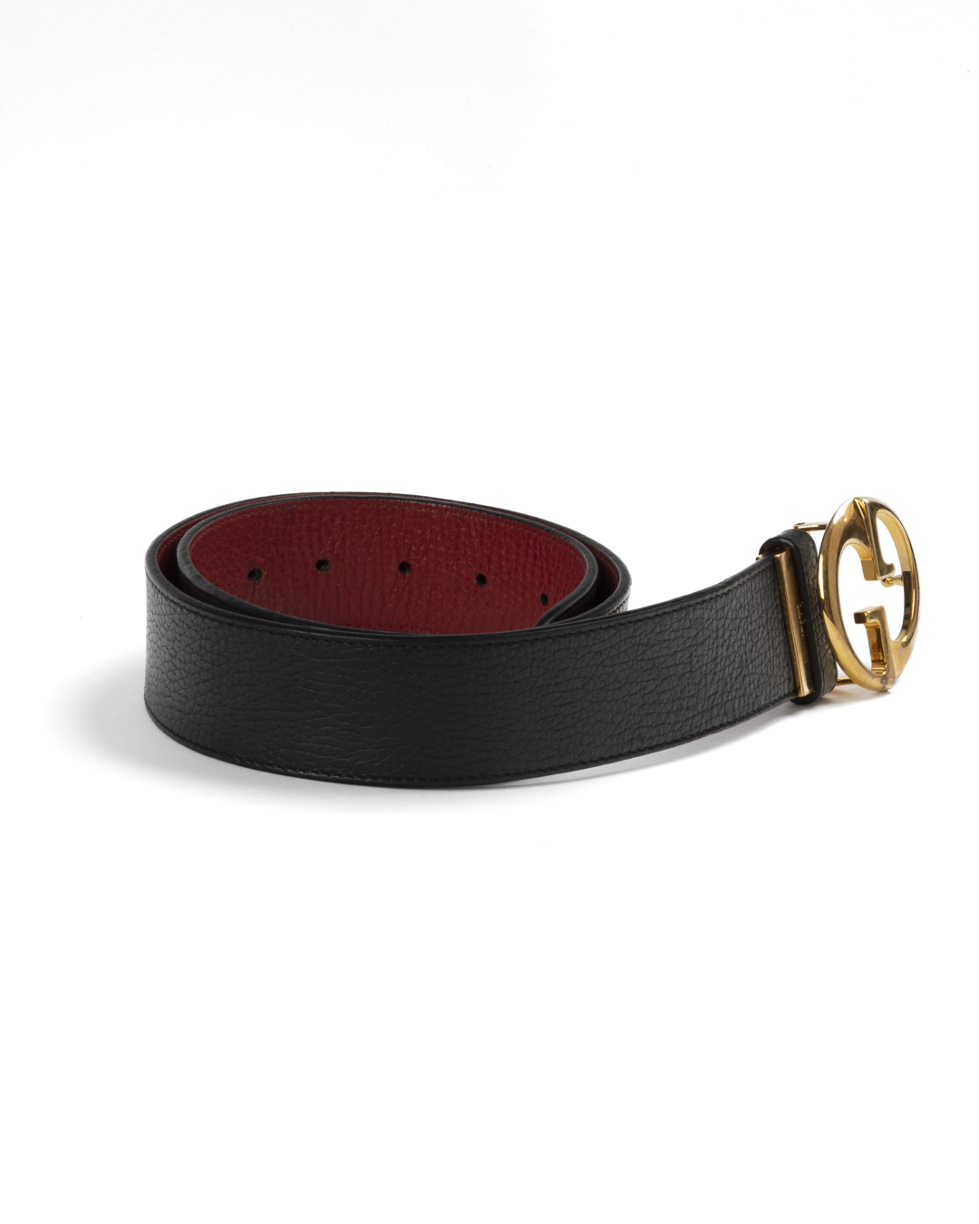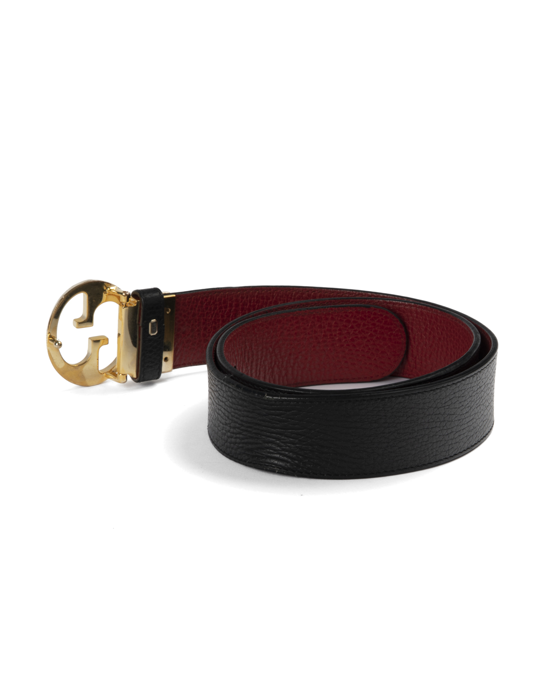 Cintura firmata Gucci, modello reversibile, realizzata in pelle martellata nera e rossa con hardware dorato. Dotata di una fibbia reversibile con classico logo del brand, misura 80 centimetri di lunghezza e 4 centimetri di altezza. L'articolo si presenta in buone condizioni, con fori aggiuntivi, visibili in foto.