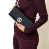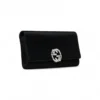 Clutch firmata Gucci, misura medium, realizzata in raso nero con hardware argento. Dotata di una chiusura con classico logo del brand “GG” arricchita da swarovski e chiusura ad incastro, internamente rivestita in pelle nera con piccola tasca, la borsa è abbastanza capiente. L’articolo si presenta in ottime condizioni.