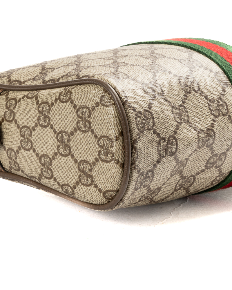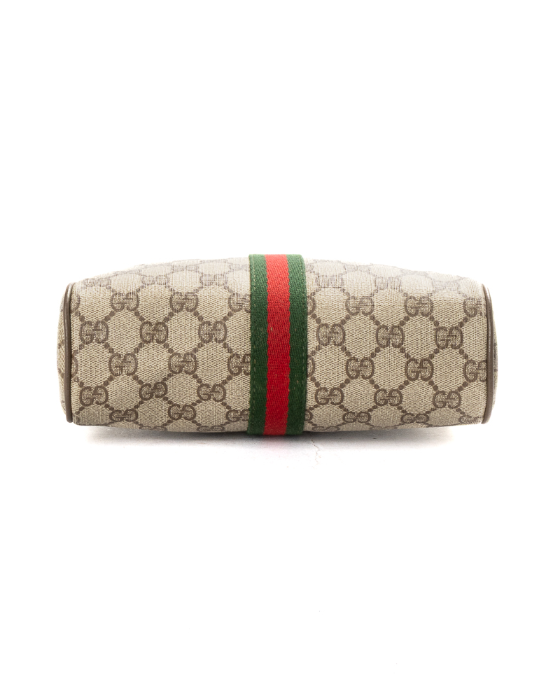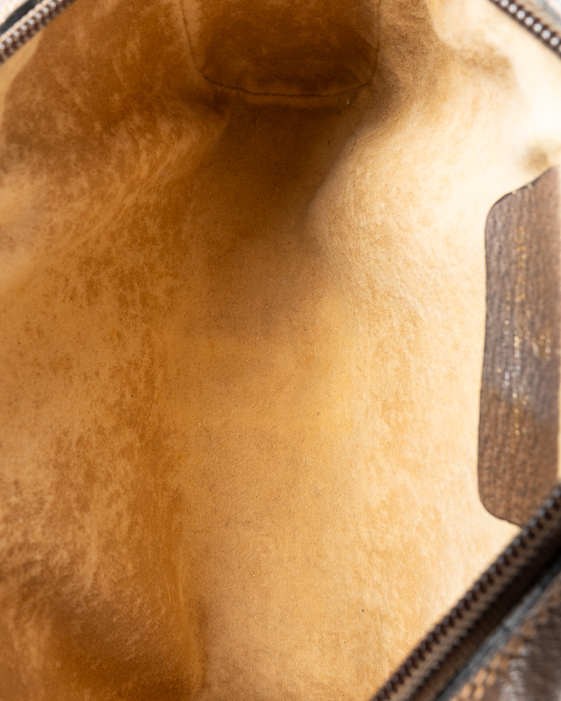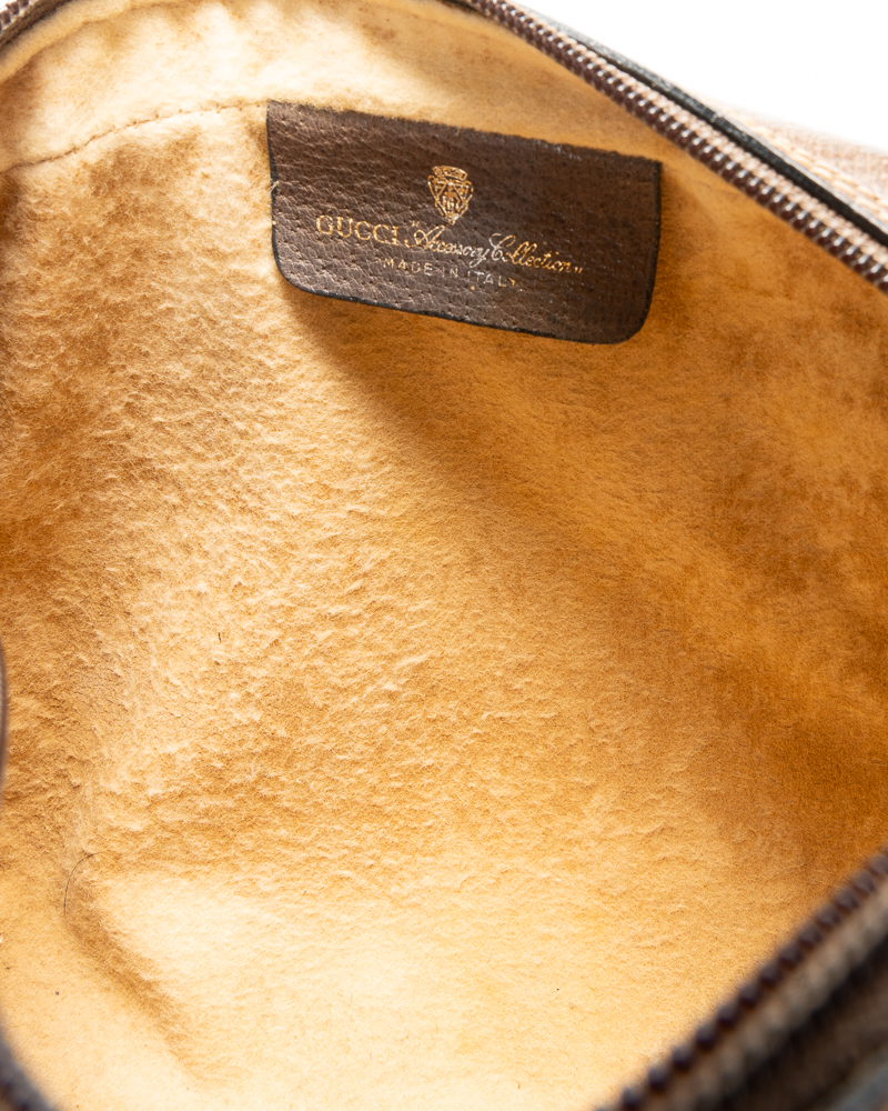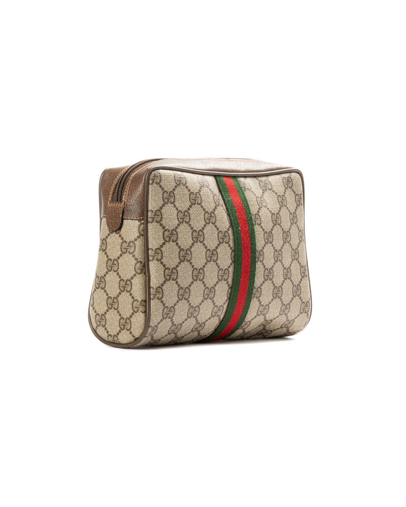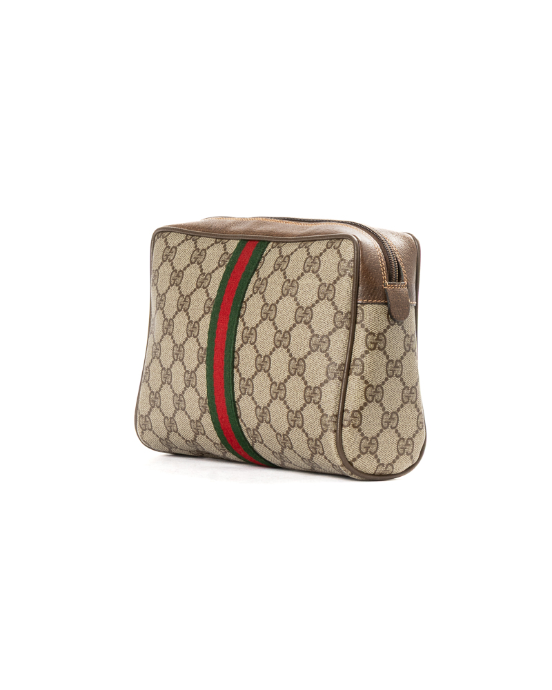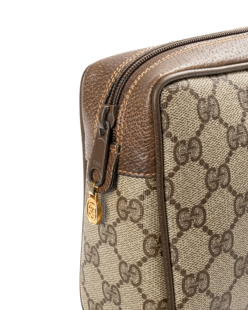 Pochette firmata Gucci, linea Vintage, realizzata in tela nella fantasia GG Supreme con inserti in pelle marrone  e hardware dorato. Dotata di una chiusura superiore a zip, internamente rivestita in tessuto scamosciato, la borsa è capiente per l’essenziale. L’articolo si presenta in buone condizioni, con segni di usura visibili in foto.