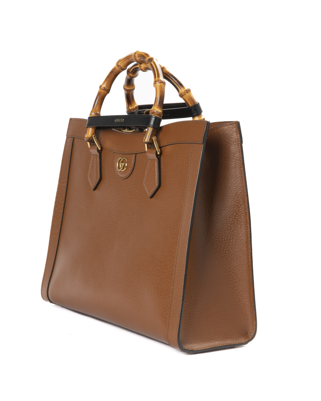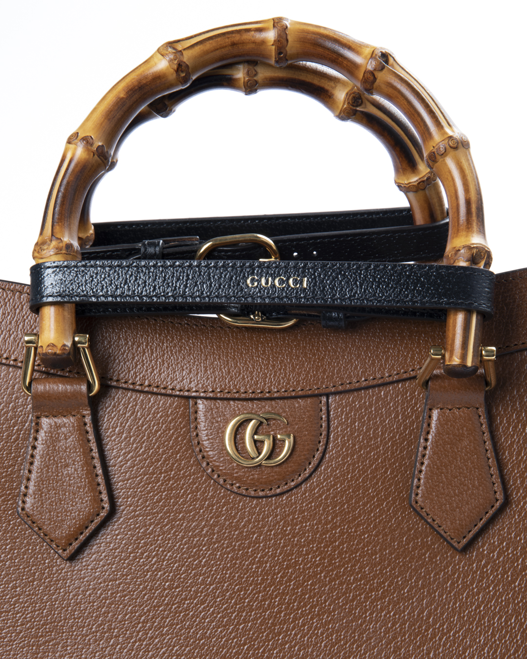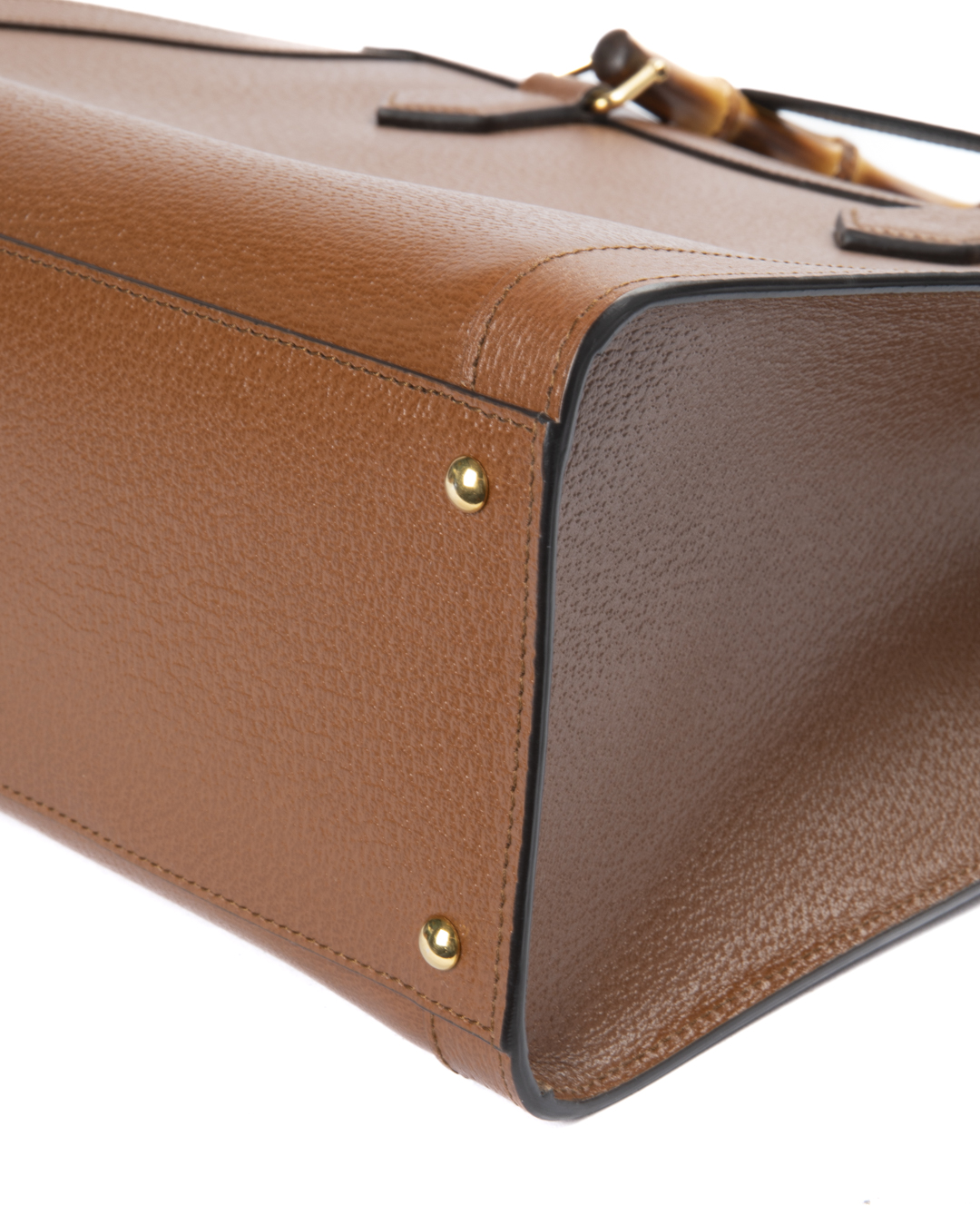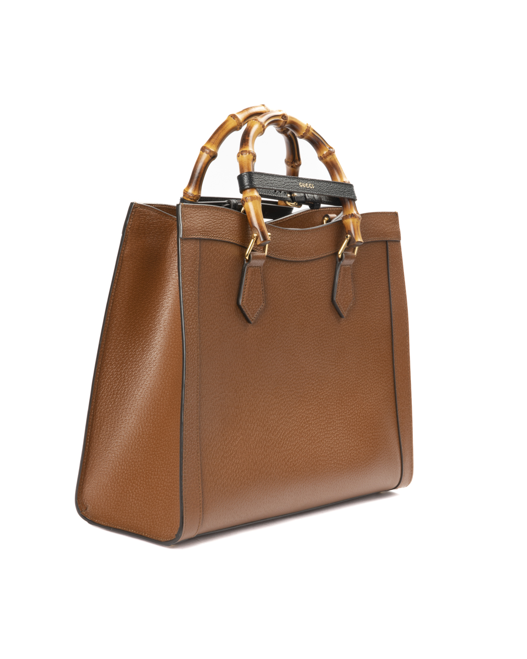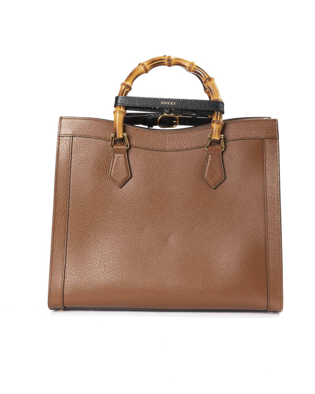 Borsa firmata Gucci, linea Bamboo, modello Diana nella misura medium, realizzata in pelle granulata marrone con hardware dorato. Dotata di una chiusura calamitata, internamente rivestita in tessuto scamosciato beige con comoda tasca, la borsa è abbastanza capiente. Munito di doppio manico in bamboo e di due tracolla rimovibili e regolabili, per una comoda portata a mano o a spalla. L'articolo si presenta in condizioni pari al nuovo.