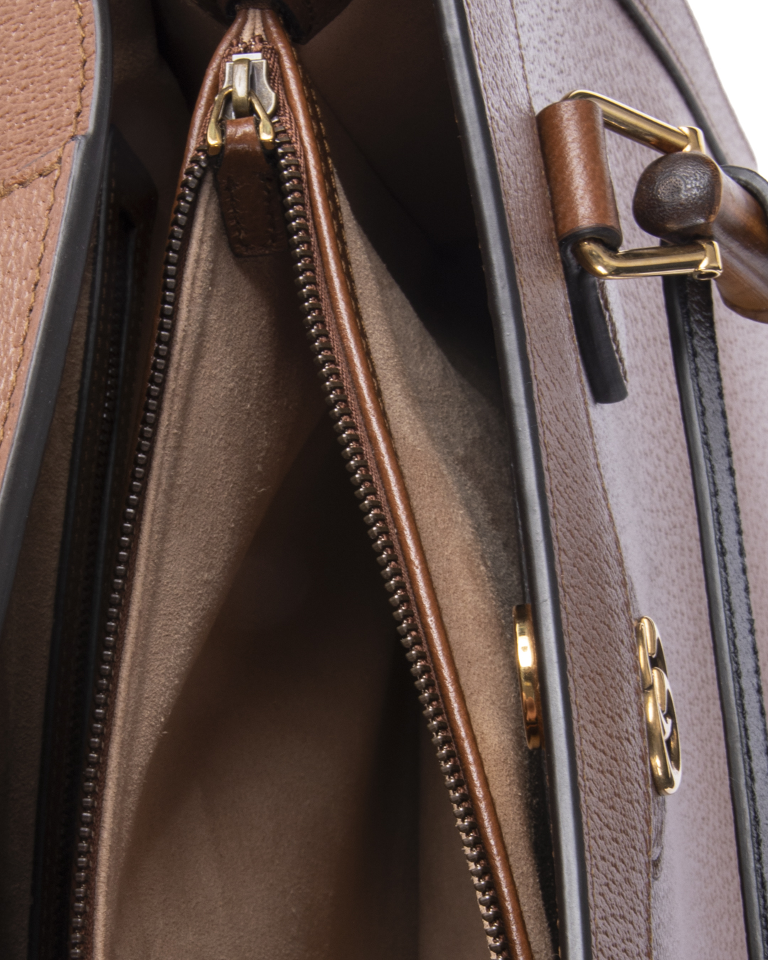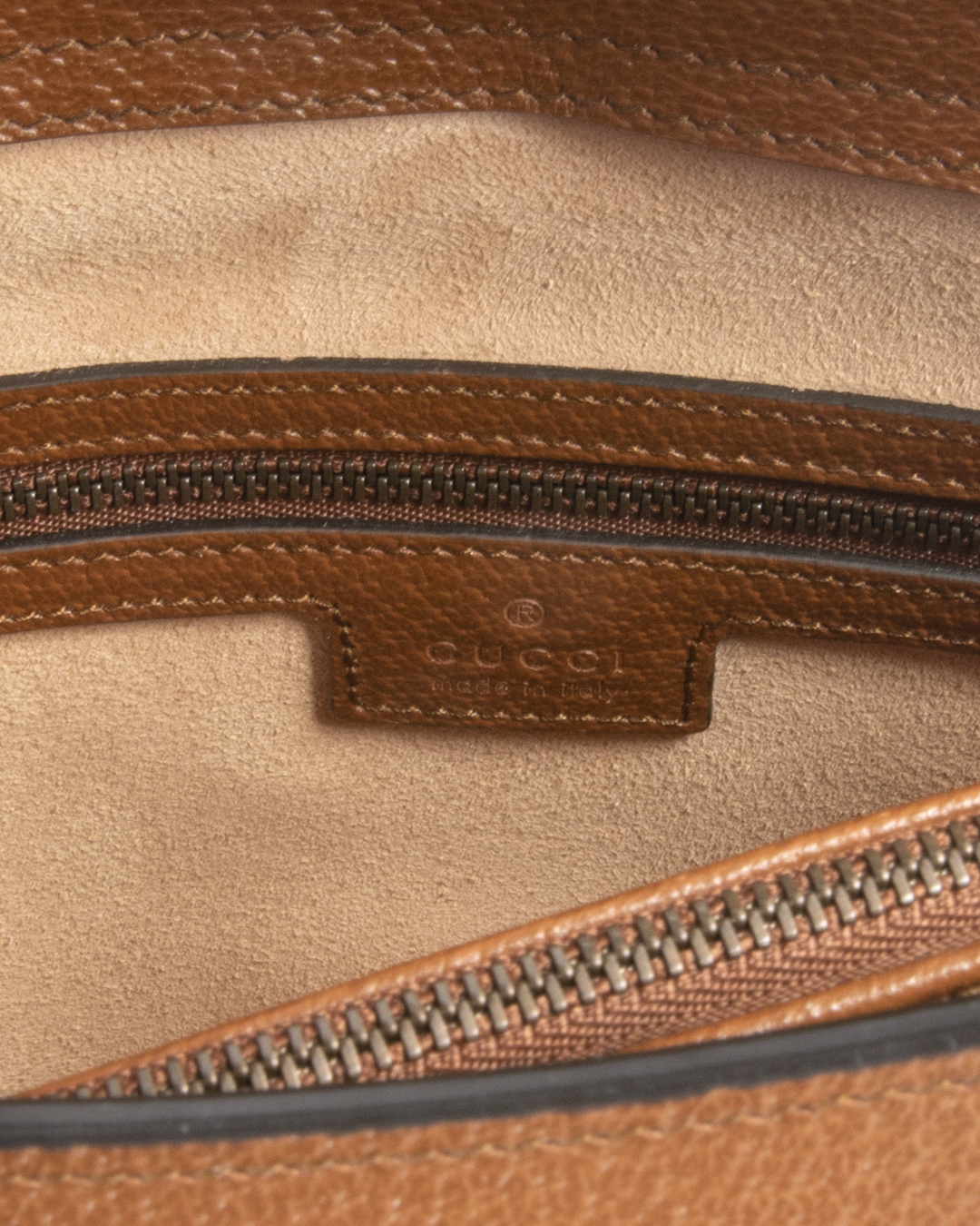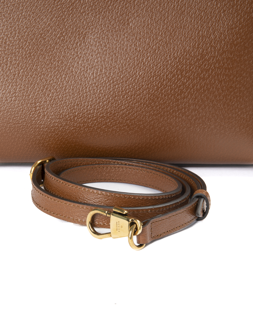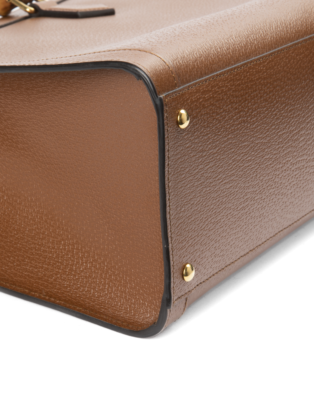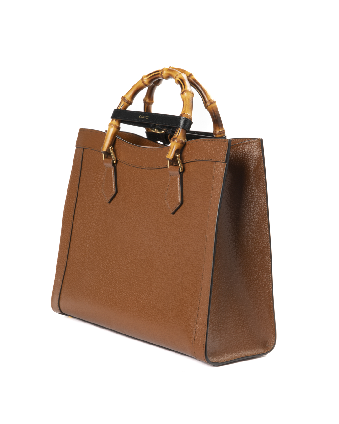 Borsa firmata Gucci, linea Bamboo, modello Diana nella misura medium, realizzata in pelle granulata marrone con hardware dorato. Dotata di una chiusura calamitata, internamente rivestita in tessuto scamosciato beige con comoda tasca, la borsa è abbastanza capiente. Munito di doppio manico in bamboo e di due tracolla rimovibili e regolabili, per una comoda portata a mano o a spalla. L'articolo si presenta in condizioni pari al nuovo.