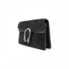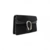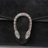 Borsa firmata Gucci, linea Dionysus, nella misura mini, realizzata in tessuto scamosciato nero con rifiniture in pelle e hardware argento. La chiusura ad incastro con teste di tigre, internamente rivestita in tessuto scamosciato beige, la borsa è capiente per l’essenziale. Munita di una tracolla rimovibile, per una comoda portata a spalla o a mano come pochette. L’articolo si presenta in ottime condizioni.