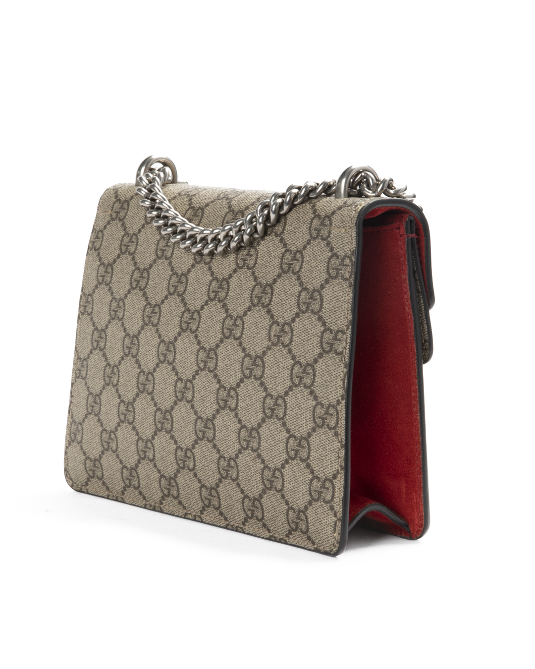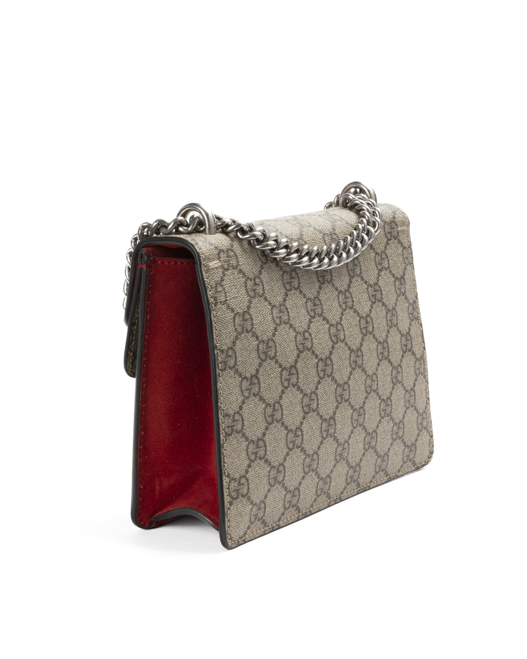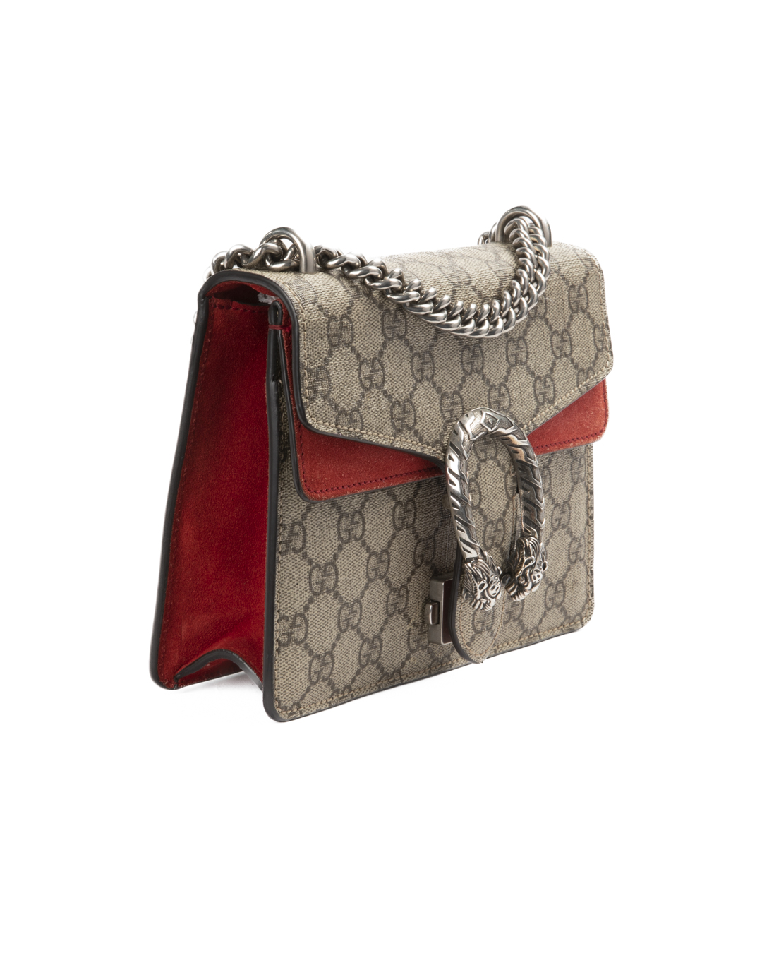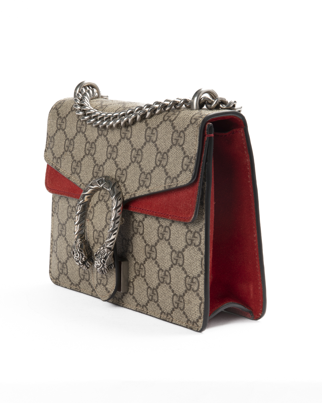 Borsa firmata Gucci, linea Dionysus, nella misura small, realizzata in tela nella classica fantasia GG Supreme con inserti in tessuto scamosciato rosso e hardware argento. La chiusura ad incastro con teste di tigre, internamente rivestita in tessuto scamosciato con piccola tasca, la borsa è capiente per l’essenziale. Munita di una tracolla scorrevole in catena, per una comoda portata a spalla o a tracolla. L’articolo si presenta in ottime condizioni.