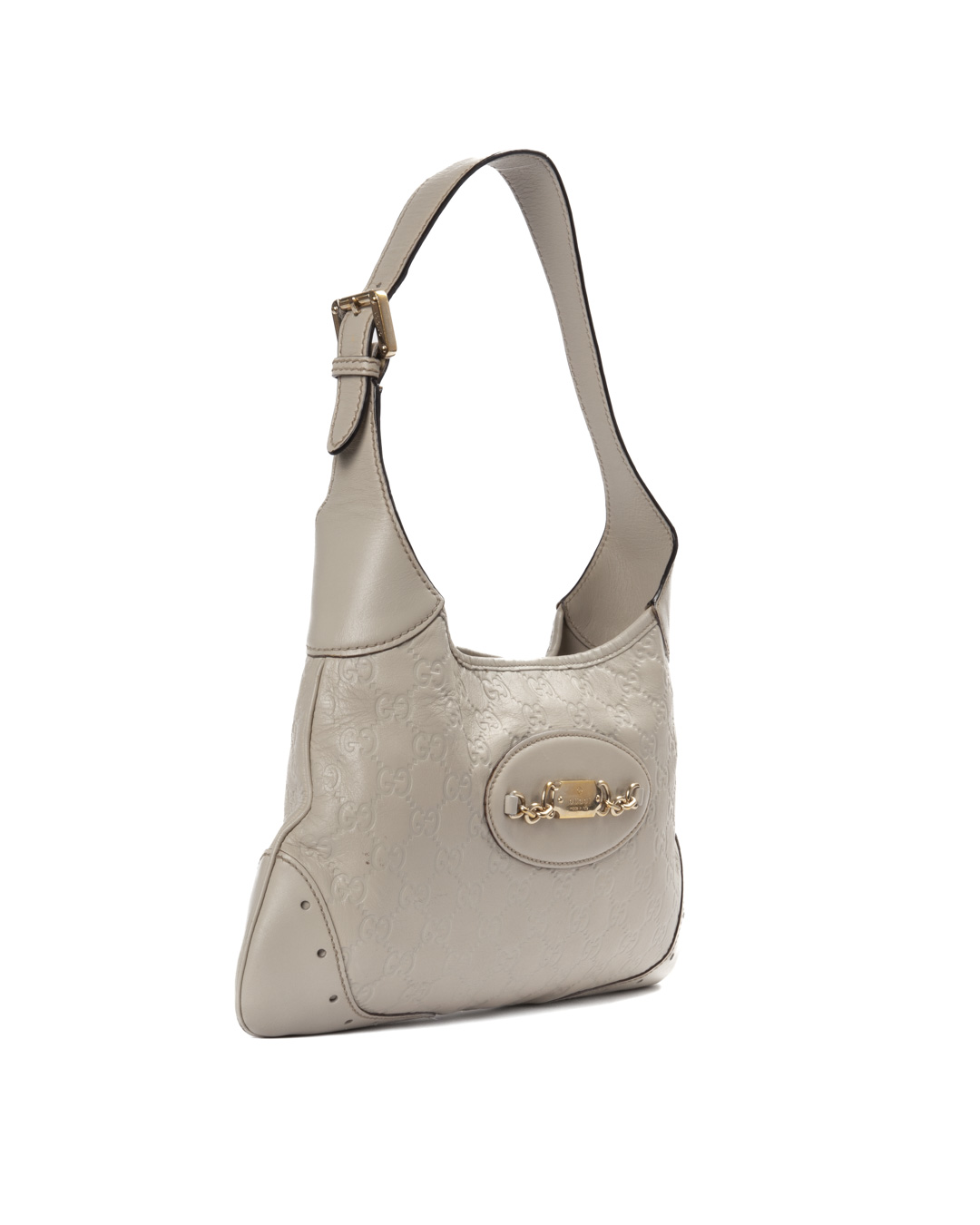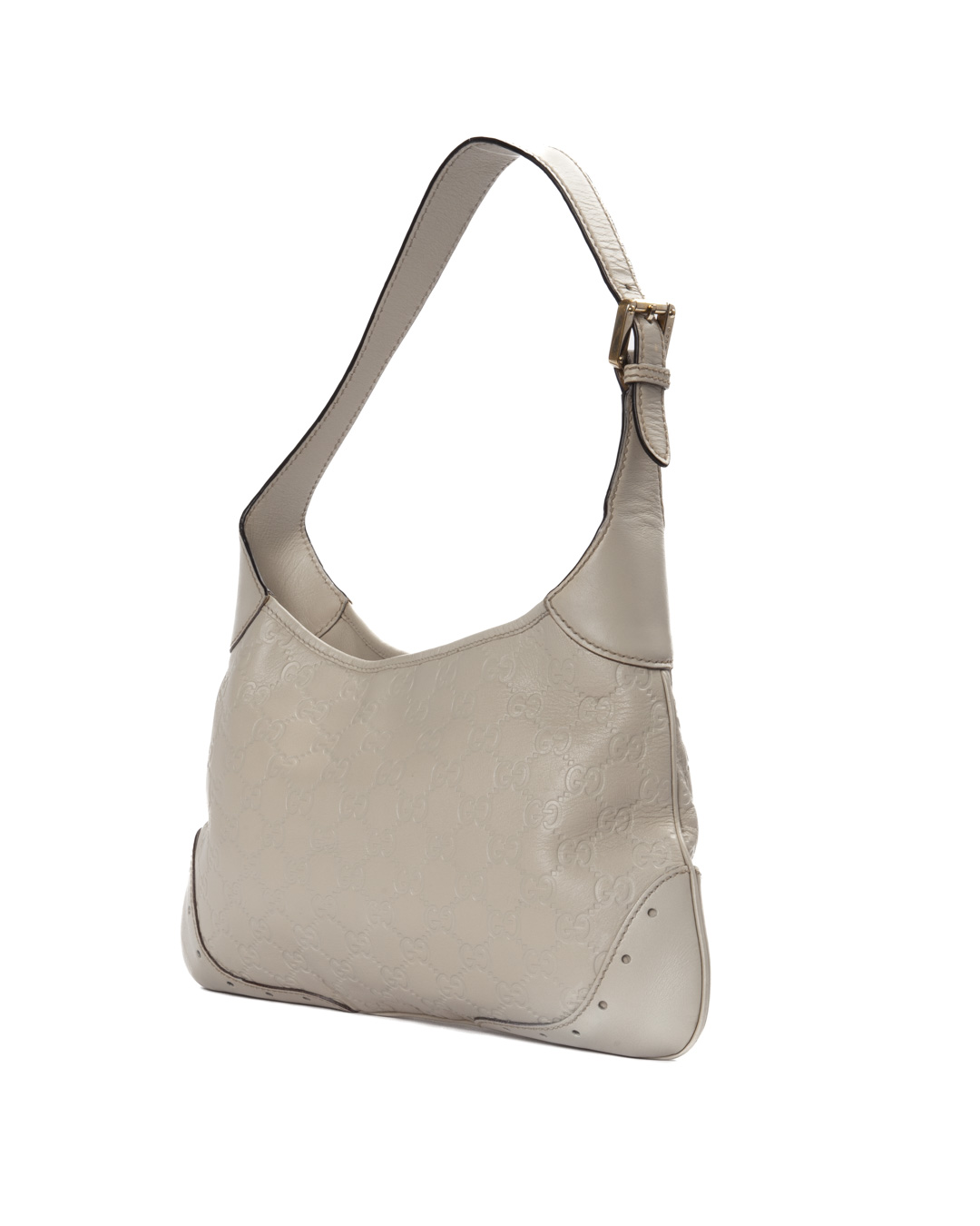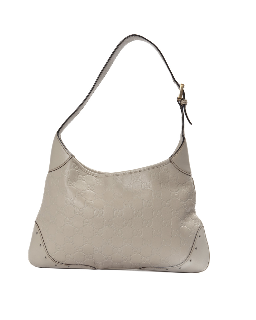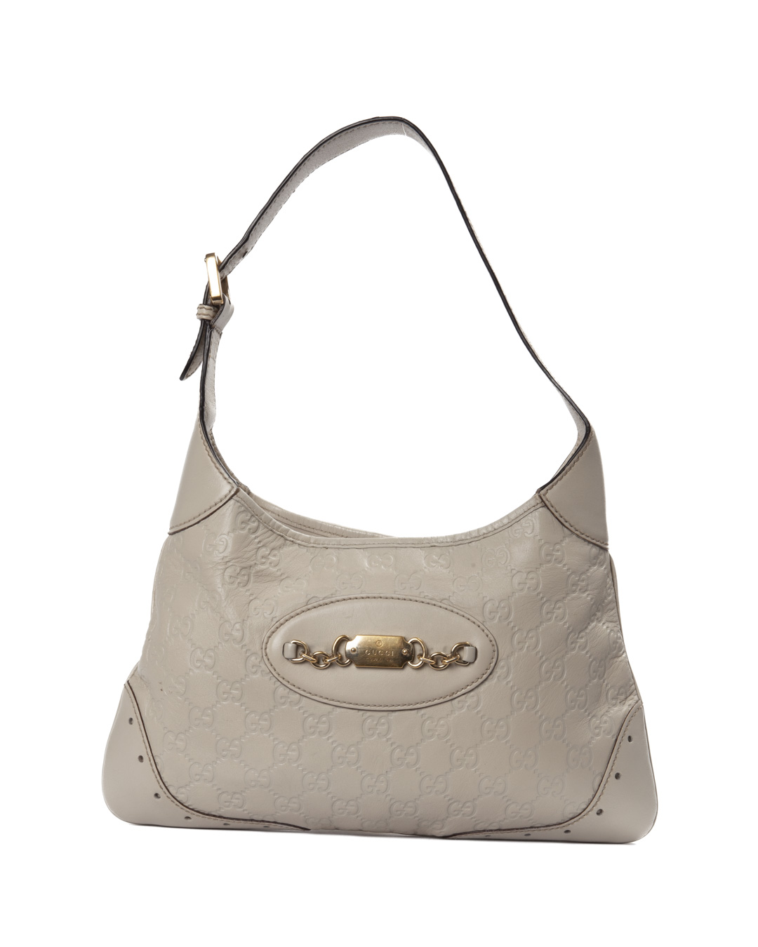 Borsa firmata Gucci, modello Hobo Sottospalla nella misura small, realizzata in pelle nella classica fantasia GG Supreme bianca con hardware dorato. Dotata di una chiusura ad incastro, internamente rivestita in tela marrone con comoda tasca, la borsa è abbastanza capiente. Munita di un manico regolabile in pelle, per una comoda portata a spalla o a mano. L’articolo si presenta in buone condizioni.