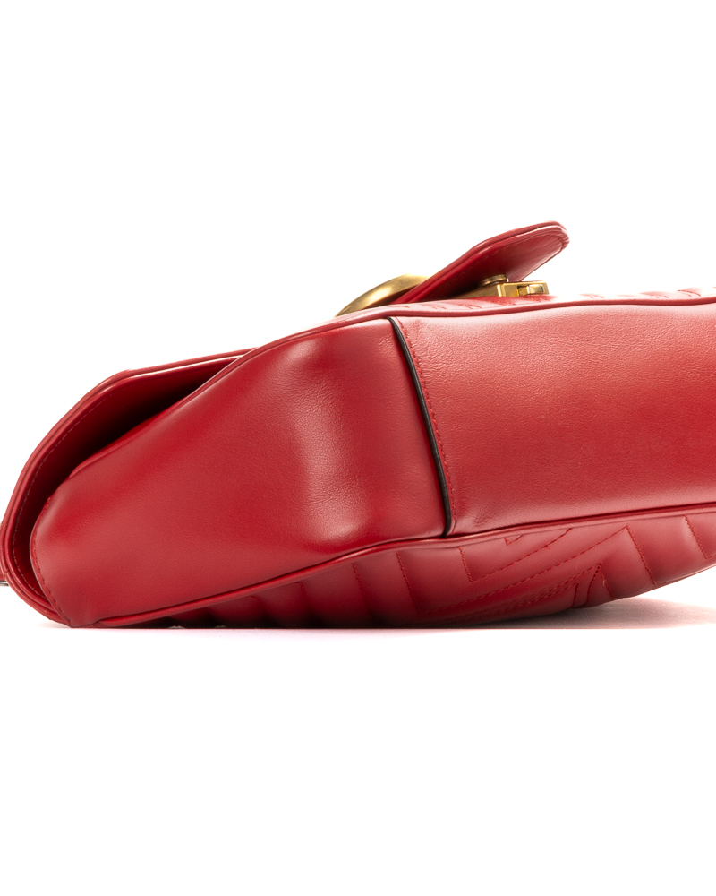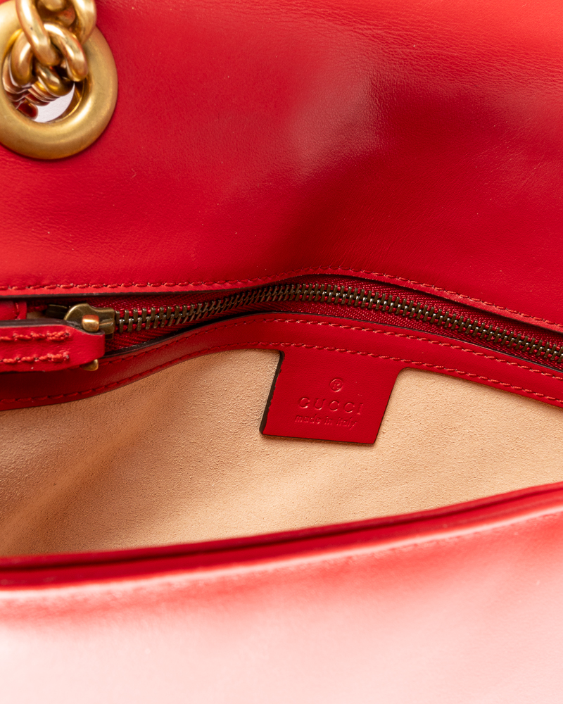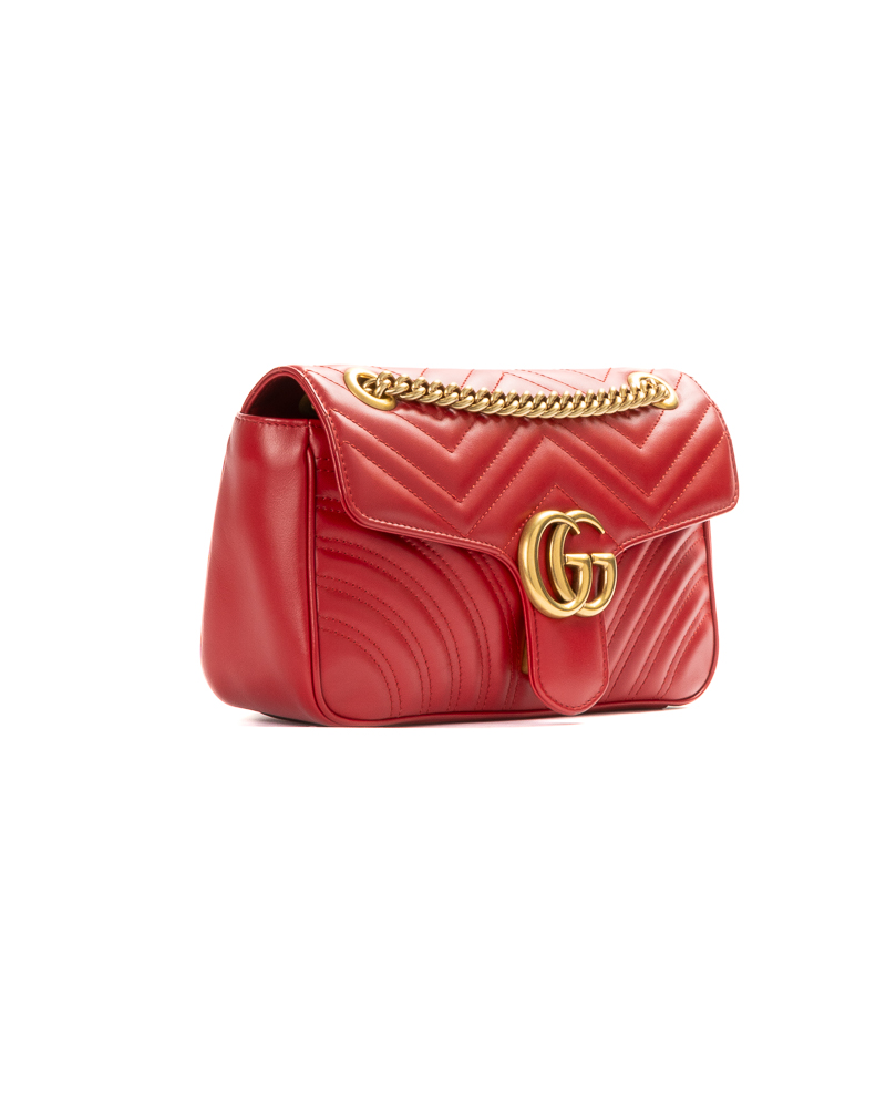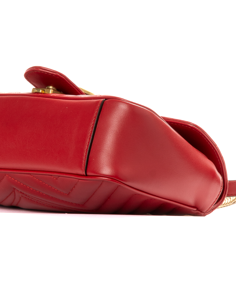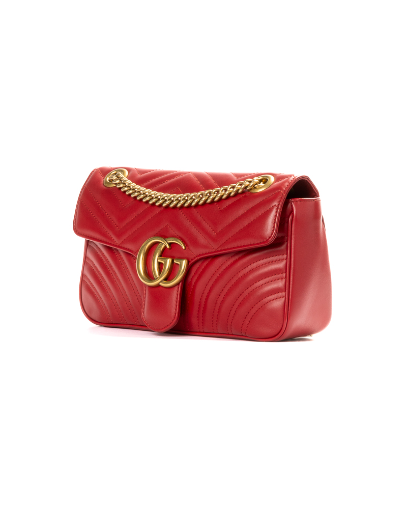 Borsa firmata Gucci, linea Marmont nella misura 26, realizzata in pelle rossa con motivo matelassè e hardware dorato. Dotata di una patta con classico logo del brand "GG" e chiusura ad incastro, internamente rivestita in tessuto scamosciato beige con comoda tasca, la borsa è abbastanza capiente. Munita di una tracolla a scorrimento in pelle e catena, per una comoda portata a spalla o a tracolla. L'articolo si presenta in condizioni pari al nuovo.