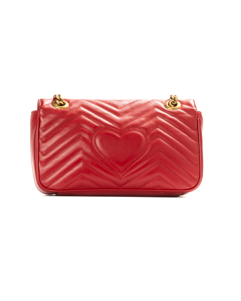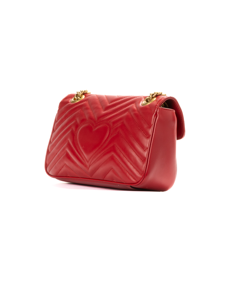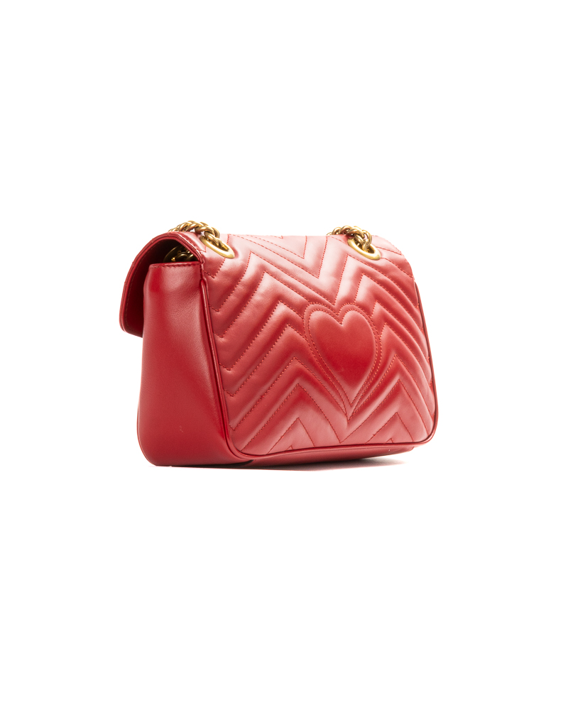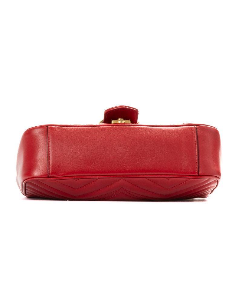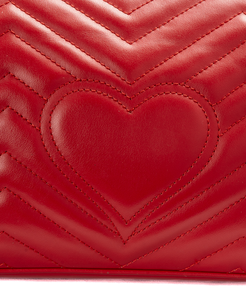 Borsa firmata Gucci, linea Marmont nella misura 26, realizzata in pelle rossa con motivo matelassè e hardware dorato. Dotata di una patta con classico logo del brand "GG" e chiusura ad incastro, internamente rivestita in tessuto scamosciato beige con comoda tasca, la borsa è abbastanza capiente. Munita di una tracolla a scorrimento in pelle e catena, per una comoda portata a spalla o a tracolla. L'articolo si presenta in condizioni pari al nuovo.