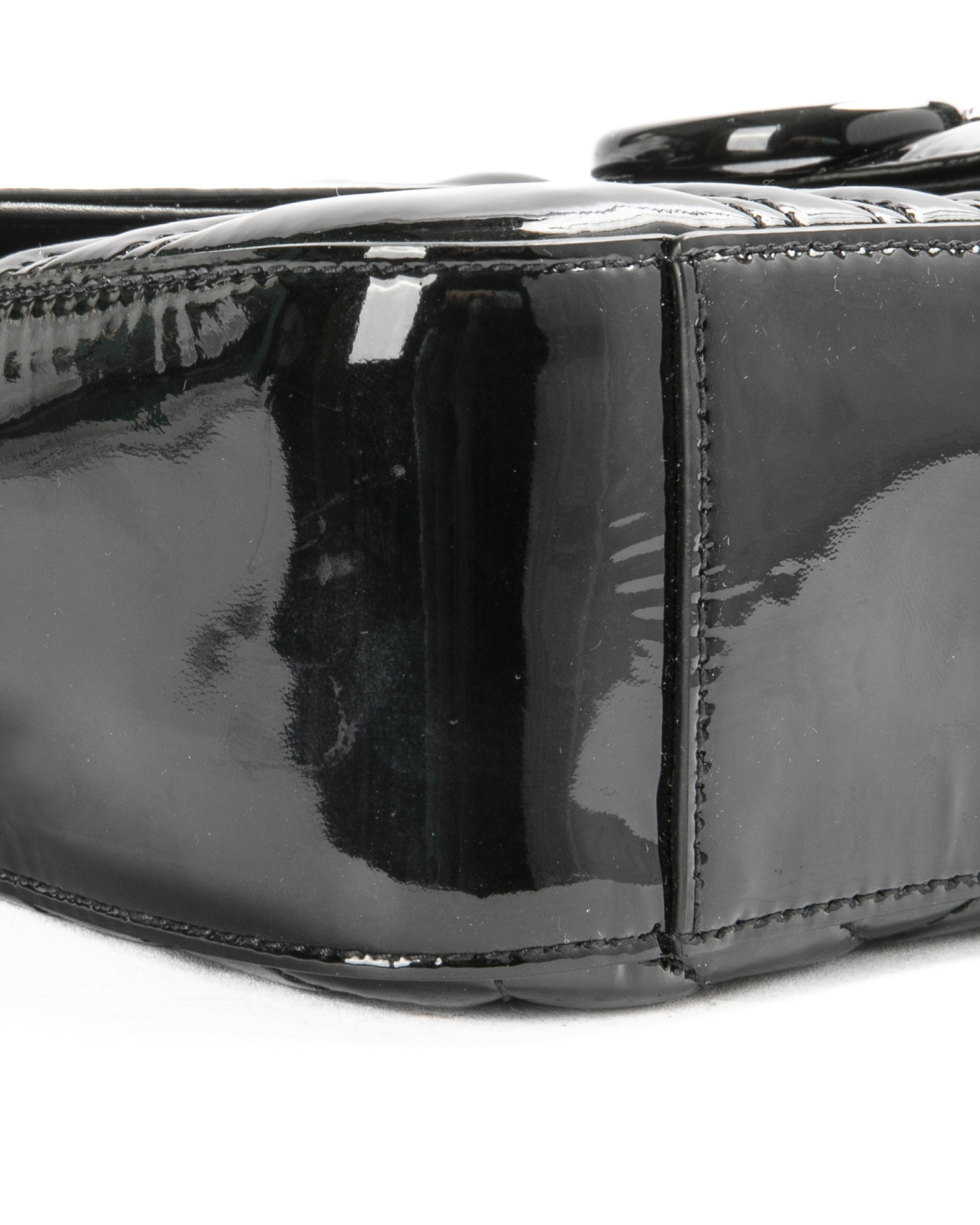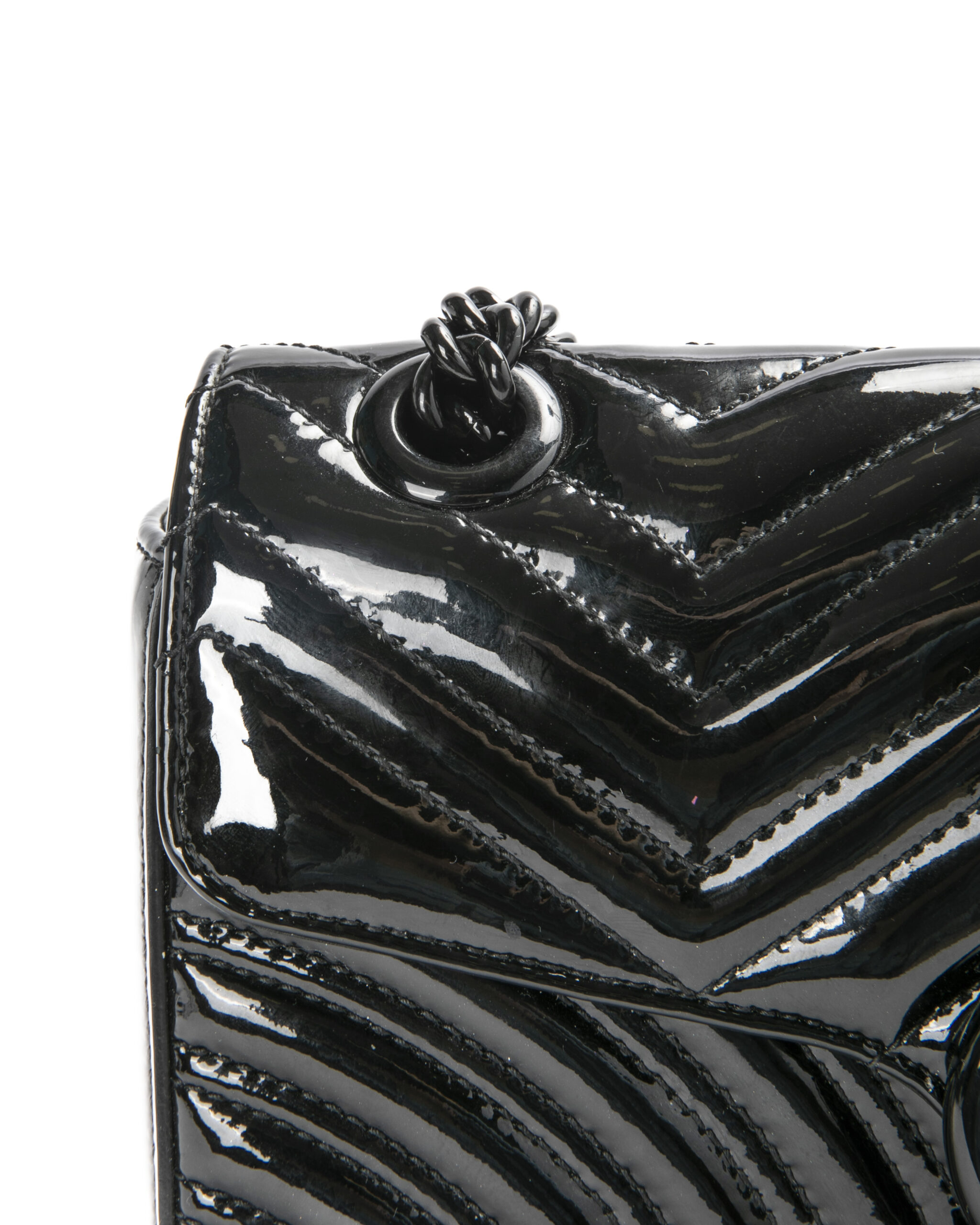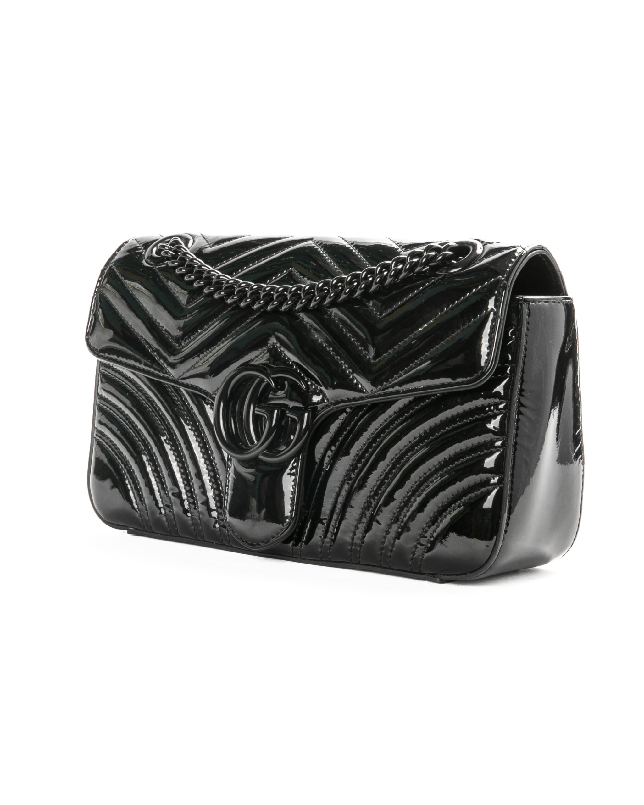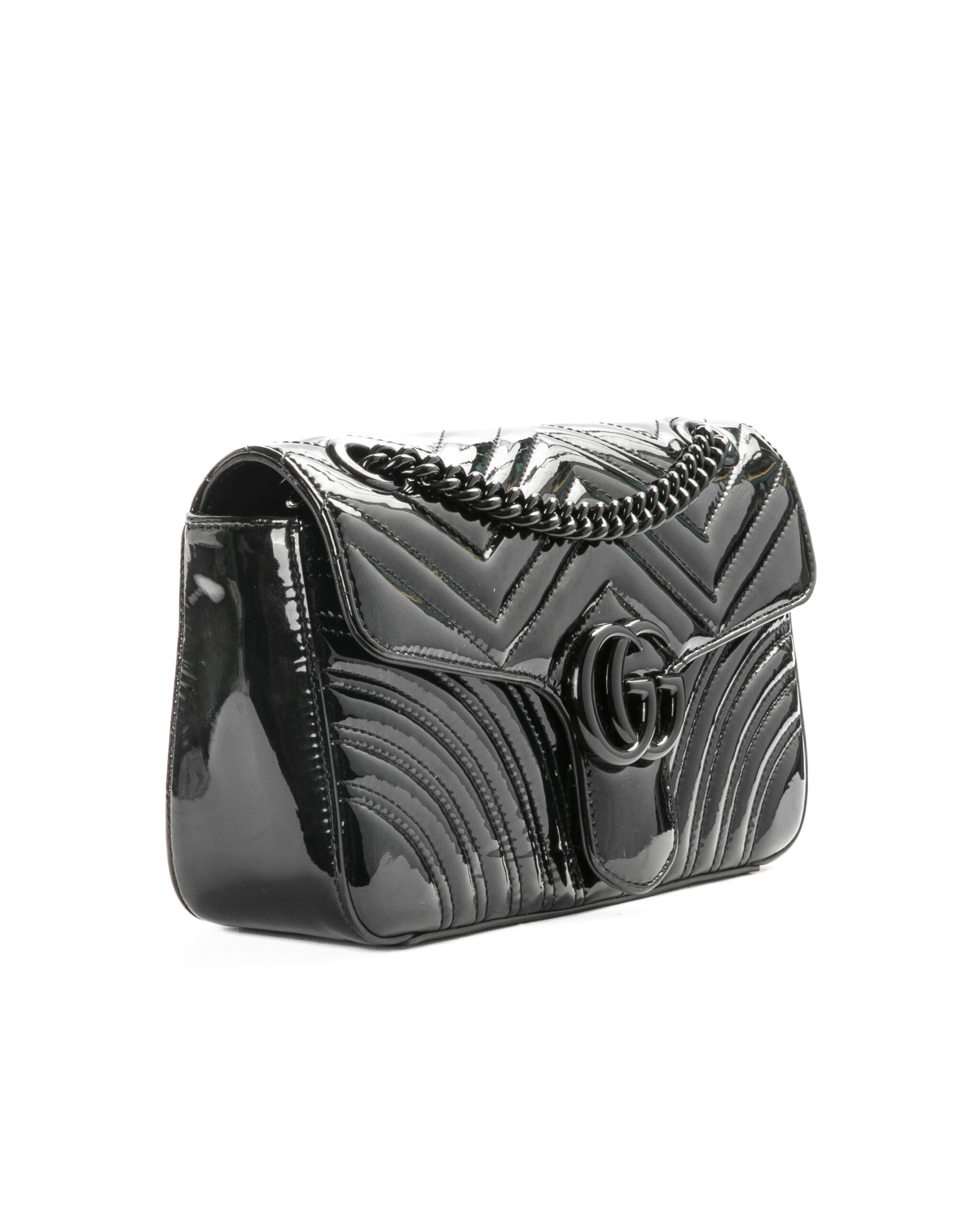 Borsa firmata Gucci, linea marmont, misura 26, realizzata in pelle verniciata nera con hardware tono su tono. Dotata di una patta con classico logo del brand "GG" e chiusura ad incastro, internamente rivestita in tessuto scamosciato tono su tono, la borsa è abbastanza capiente. Munita di una tracolla a scorrimento in pelle e catena, per una comoda portata a spalla o a tracolla. L'articolo si presenta in ottime condizioni.