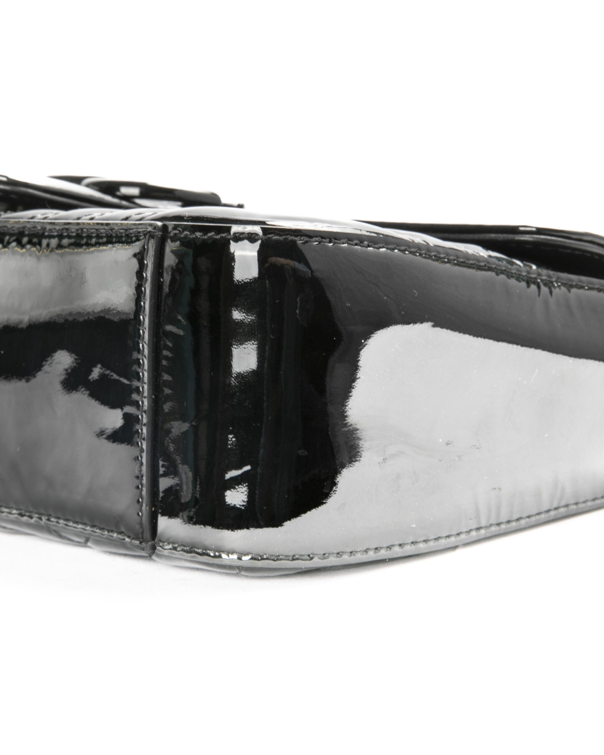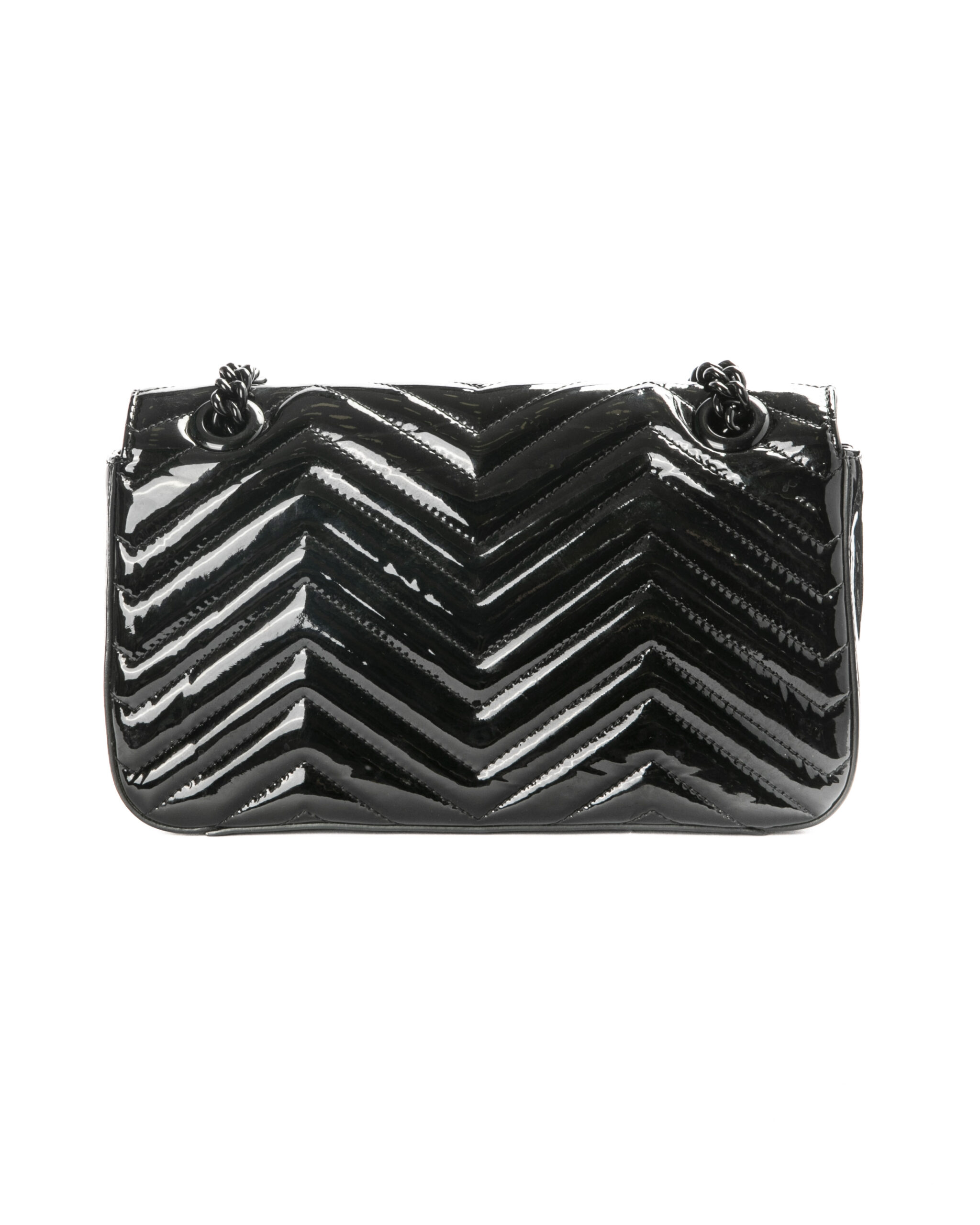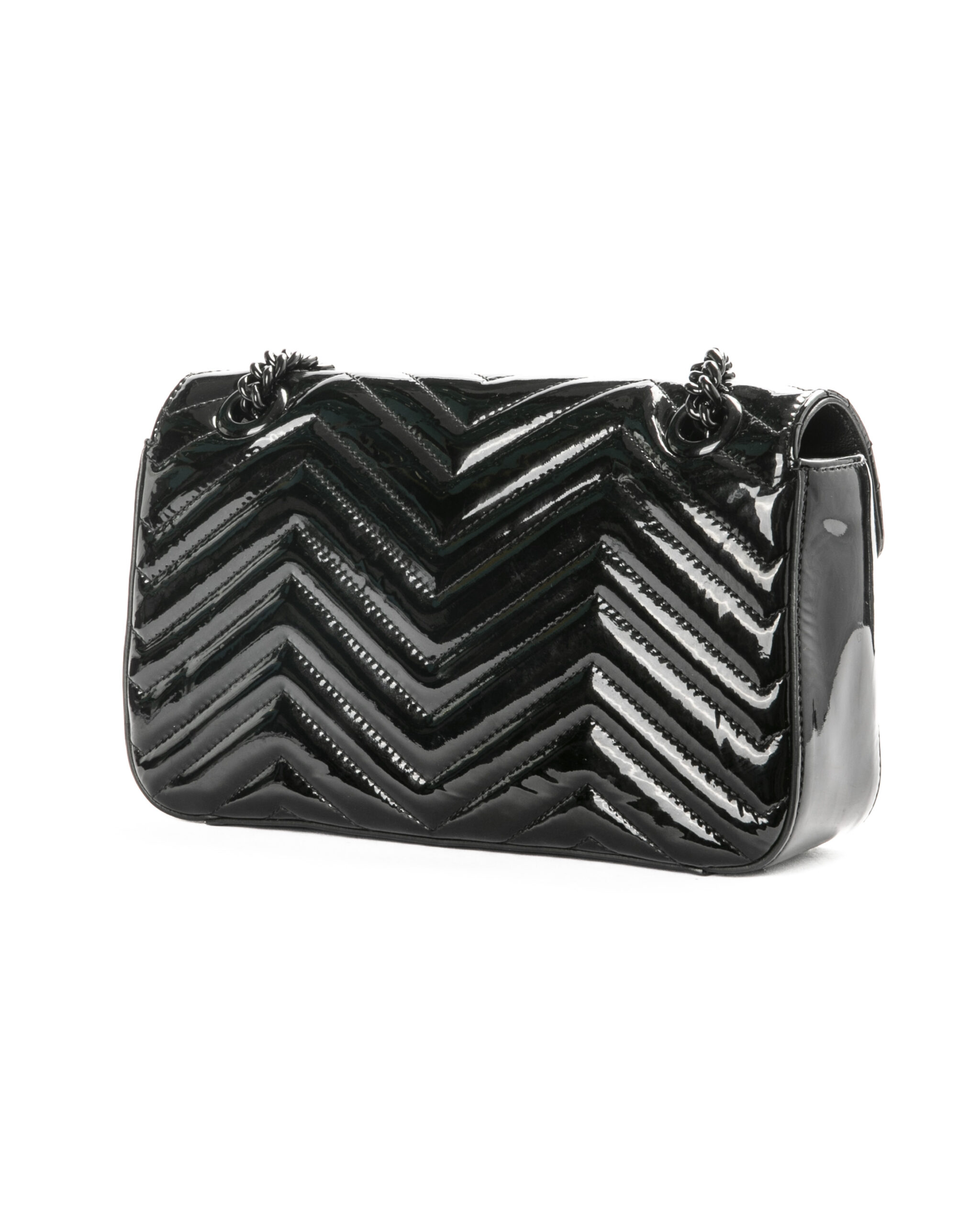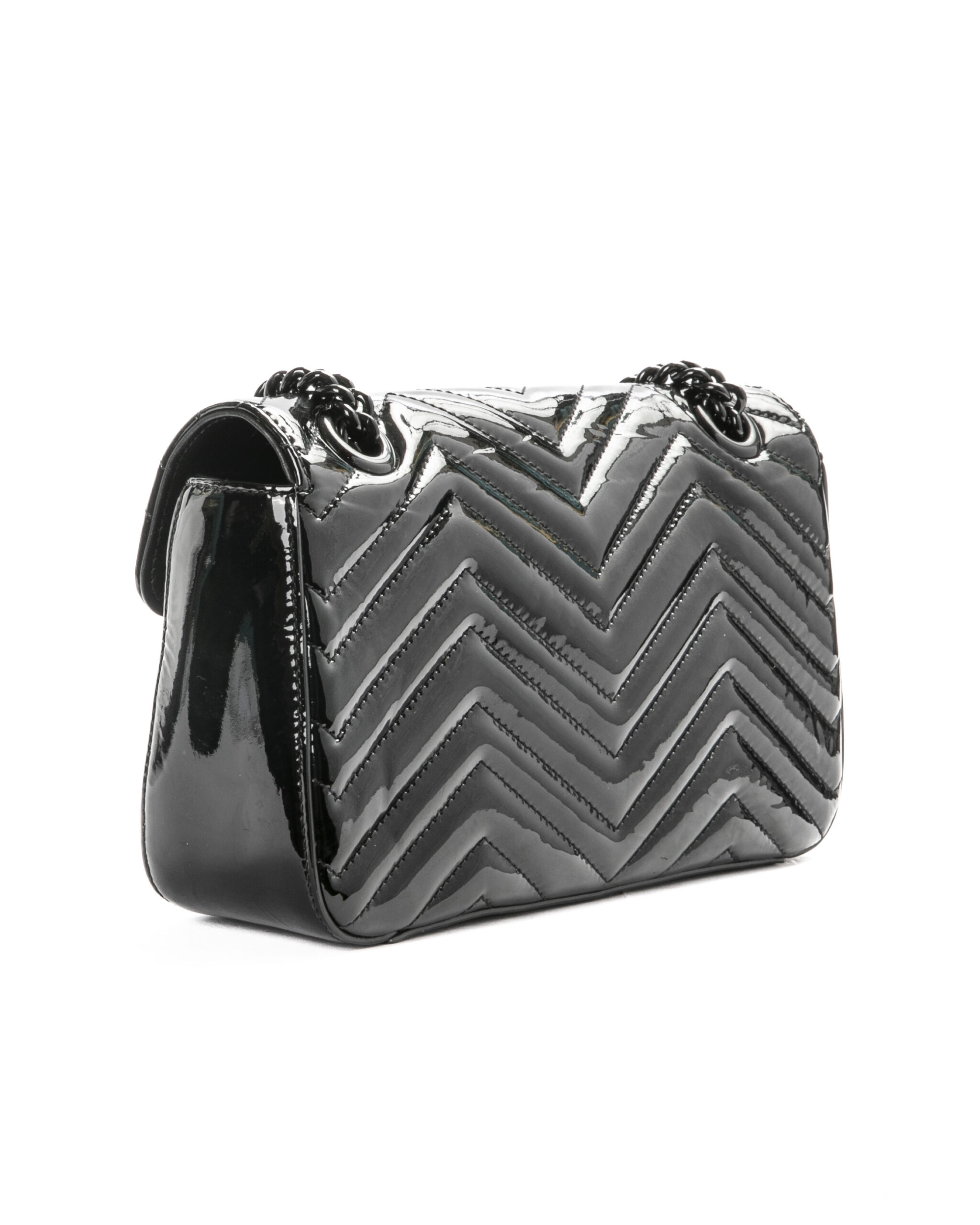 Borsa firmata Gucci, linea marmont, misura 26, realizzata in pelle verniciata nera con hardware tono su tono. Dotata di una patta con classico logo del brand "GG" e chiusura ad incastro, internamente rivestita in tessuto scamosciato tono su tono, la borsa è abbastanza capiente. Munita di una tracolla a scorrimento in pelle e catena, per una comoda portata a spalla o a tracolla. L'articolo si presenta in ottime condizioni.