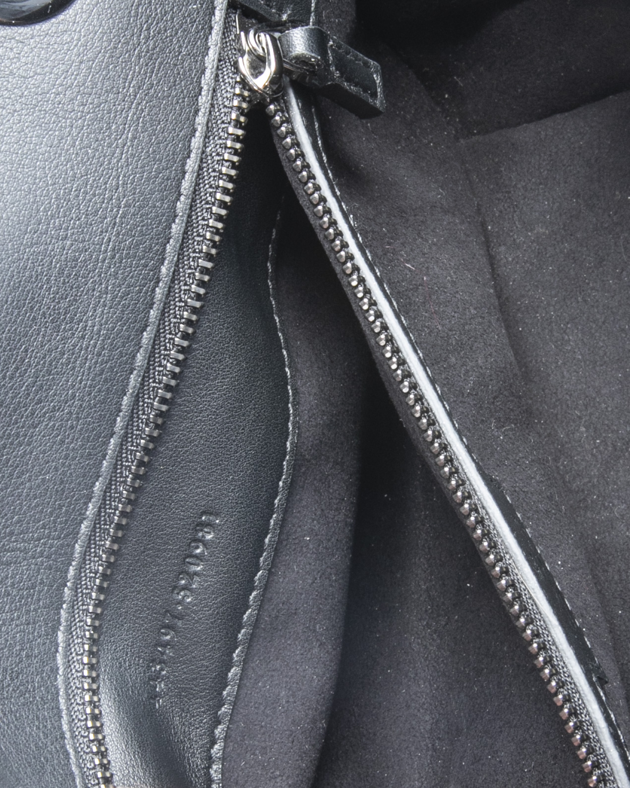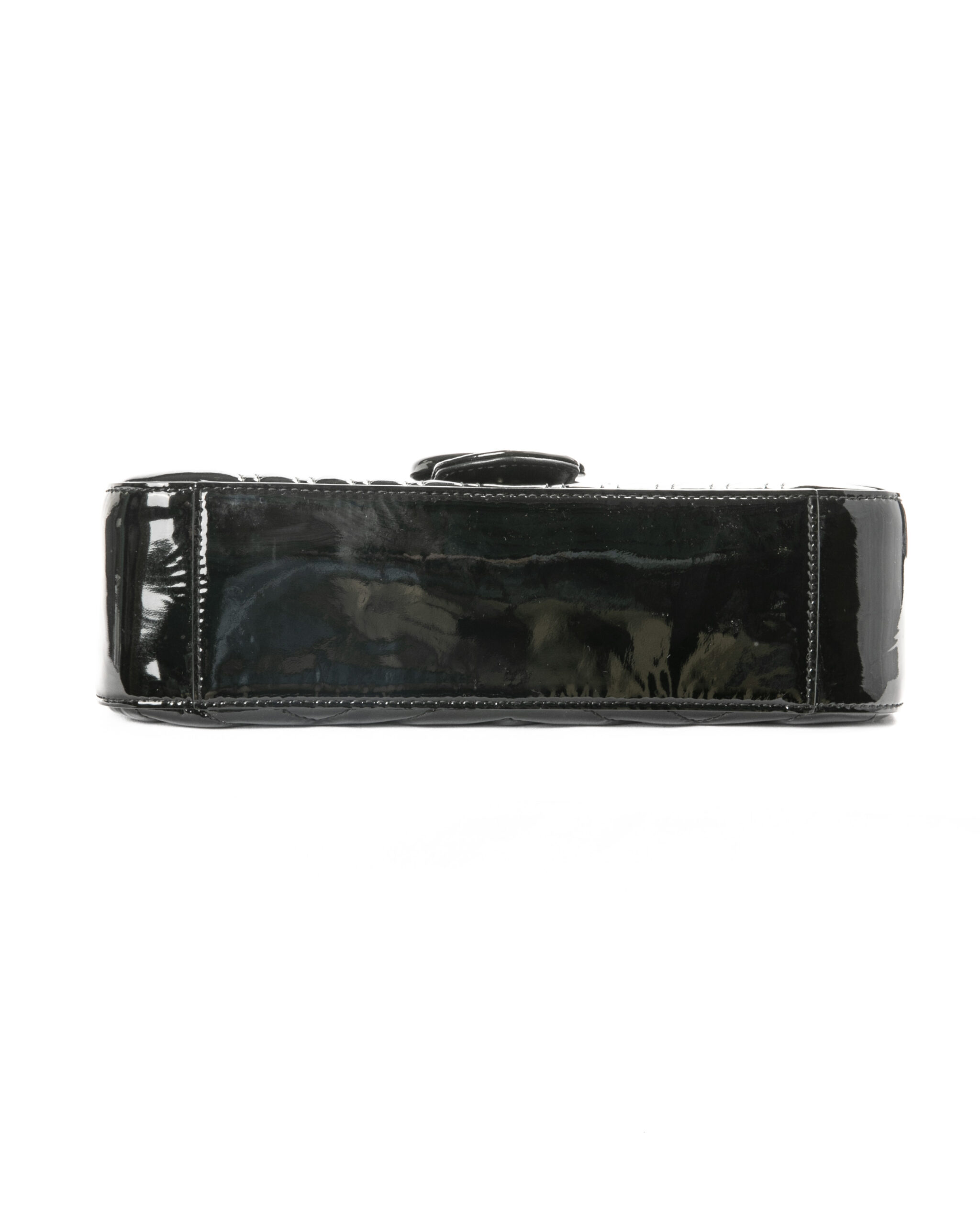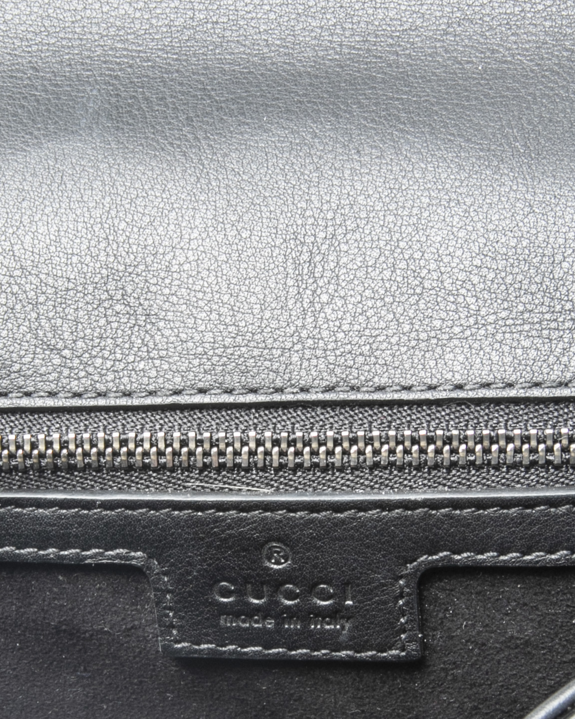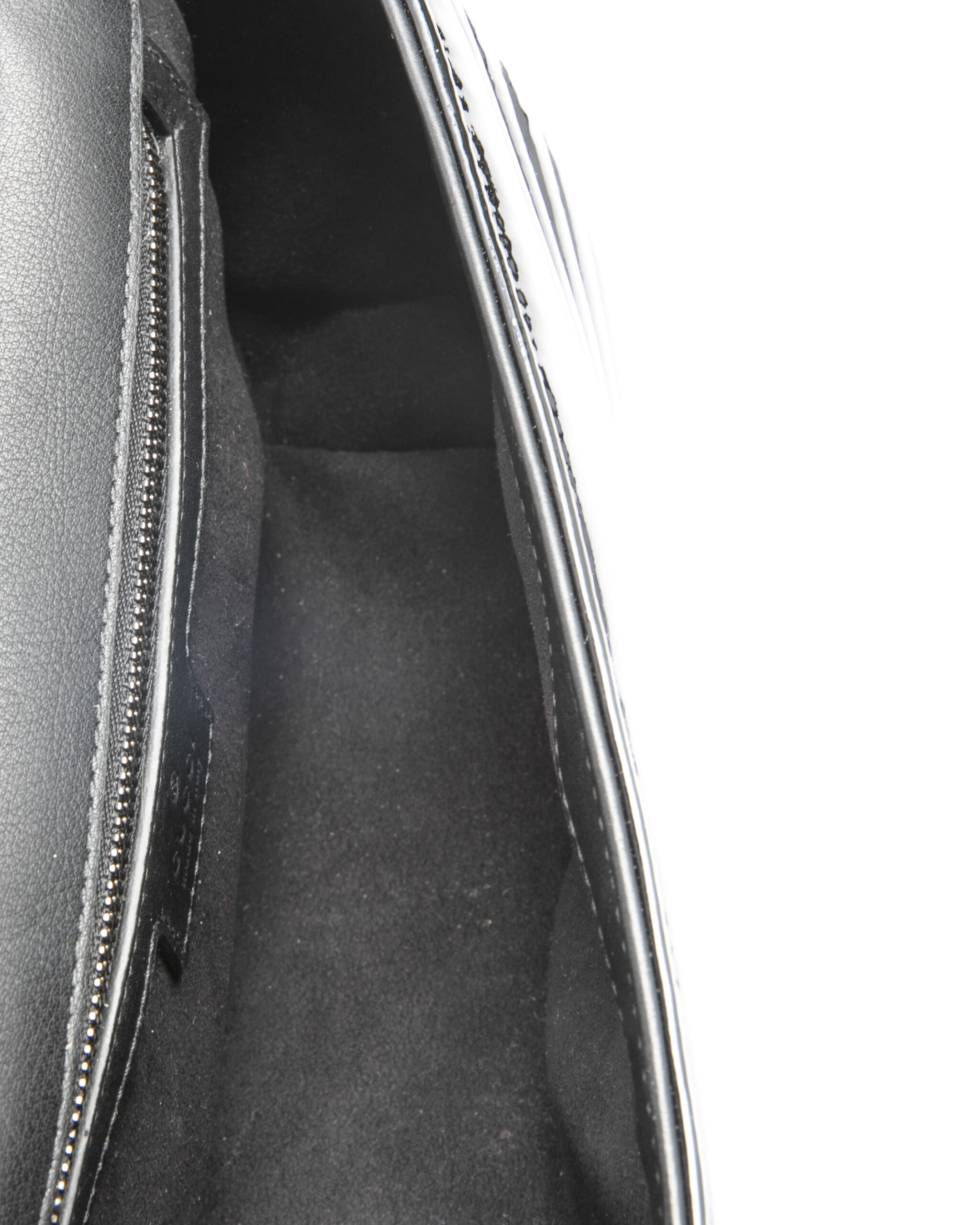 Borsa firmata Gucci, linea marmont, misura 26, realizzata in pelle verniciata nera con hardware tono su tono. Dotata di una patta con classico logo del brand "GG" e chiusura ad incastro, internamente rivestita in tessuto scamosciato tono su tono, la borsa è abbastanza capiente. Munita di una tracolla a scorrimento in pelle e catena, per una comoda portata a spalla o a tracolla. L'articolo si presenta in ottime condizioni.