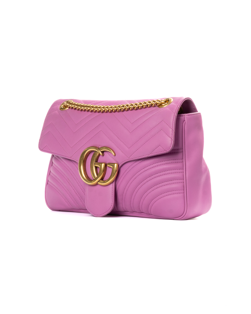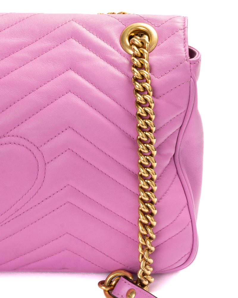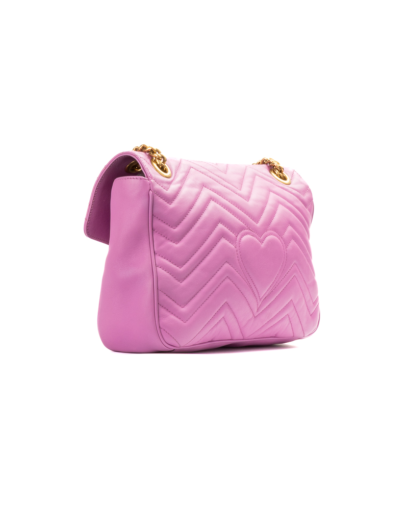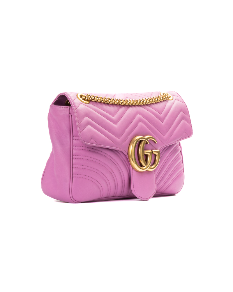 Borsa firmata Gucci, linea marmont, misura 31, realizzata in pelle rosa con motivo matelassè e hardware dorato. Dotata di una patta con classico logo del brand “GG” e chiusura ad incastro, internamente rivestita in tessuto scamosciato beige con comode tasche, la borsa è abbastanza capiente. Munita di una tracolla a scorrimento in pelle e catena, per una comoda portata a spalla o a tracolla. L’articolo si presenta in ottime condizioni.