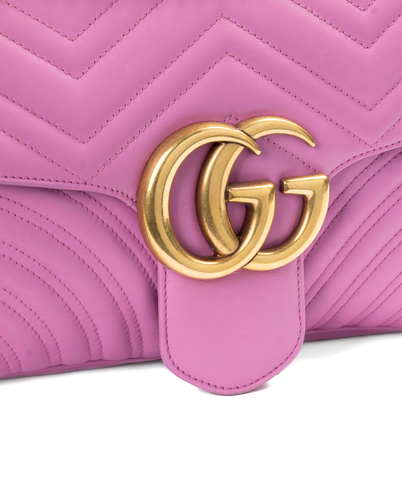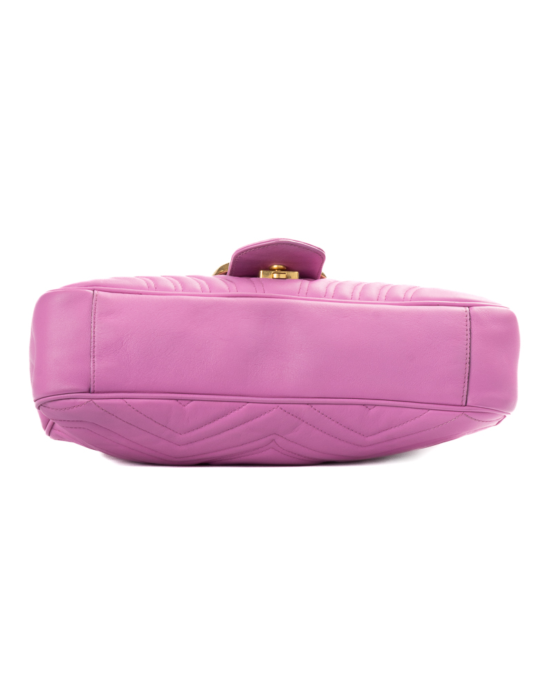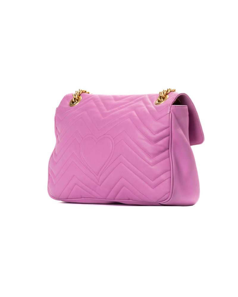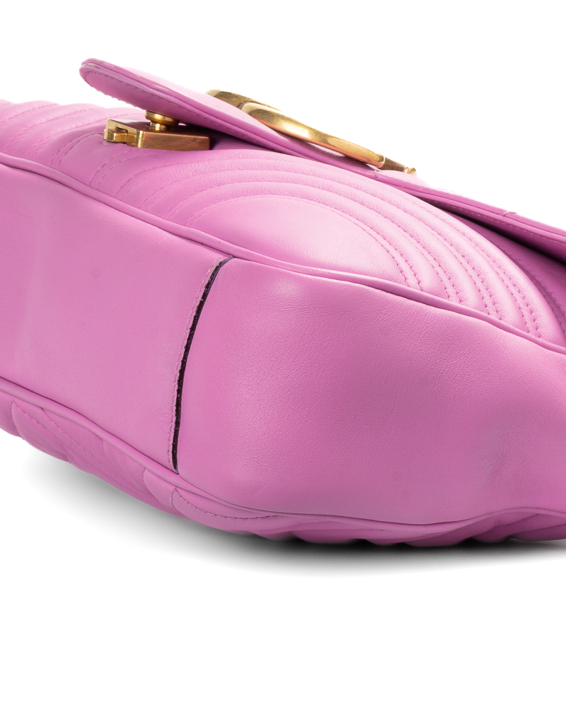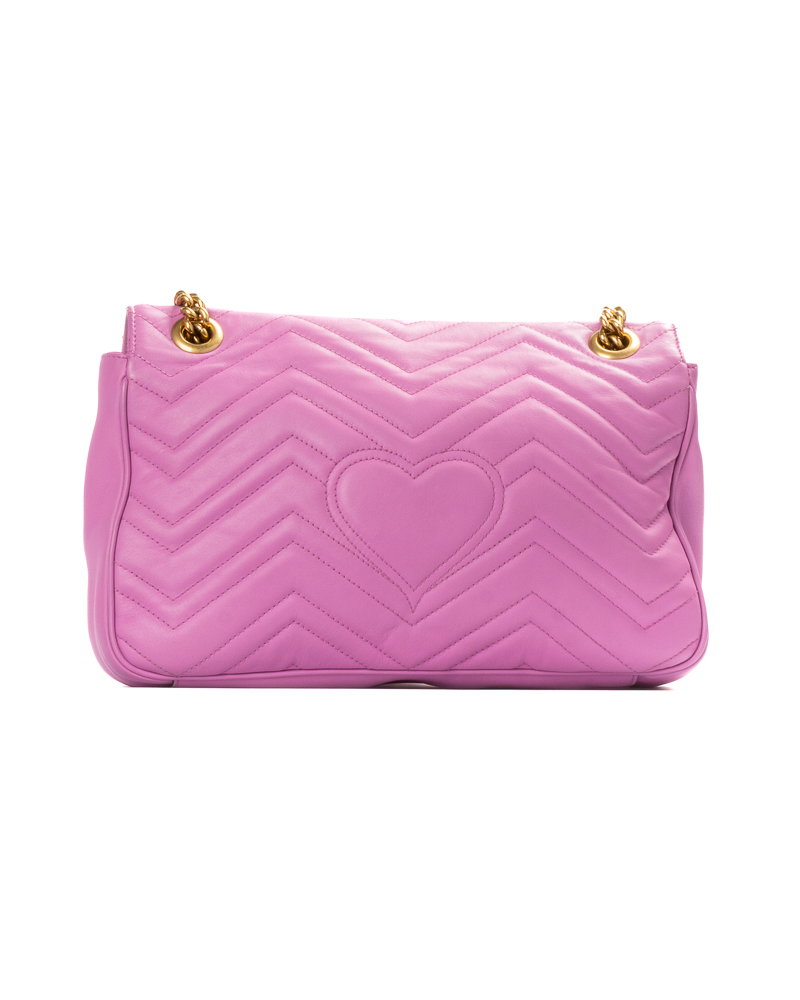 Borsa firmata Gucci, linea marmont, misura 31, realizzata in pelle rosa con motivo matelassè e hardware dorato. Dotata di una patta con classico logo del brand “GG” e chiusura ad incastro, internamente rivestita in tessuto scamosciato beige con comode tasche, la borsa è abbastanza capiente. Munita di una tracolla a scorrimento in pelle e catena, per una comoda portata a spalla o a tracolla. L’articolo si presenta in ottime condizioni.