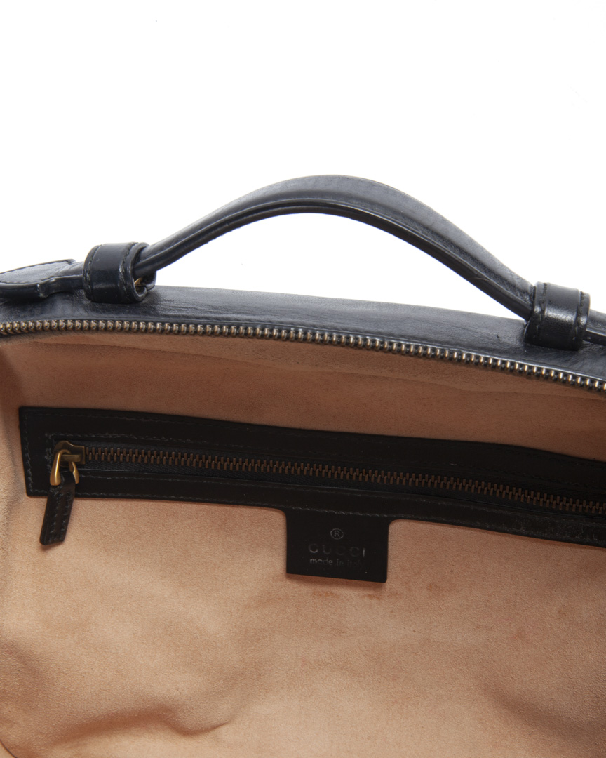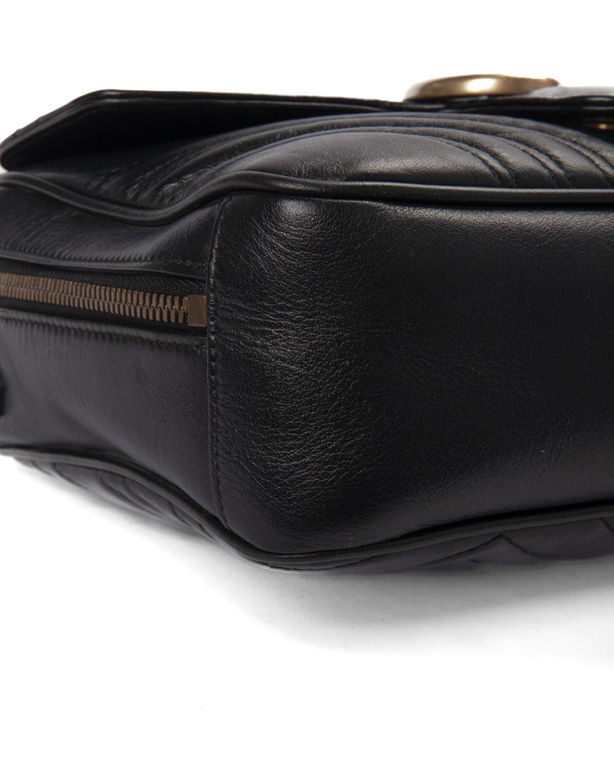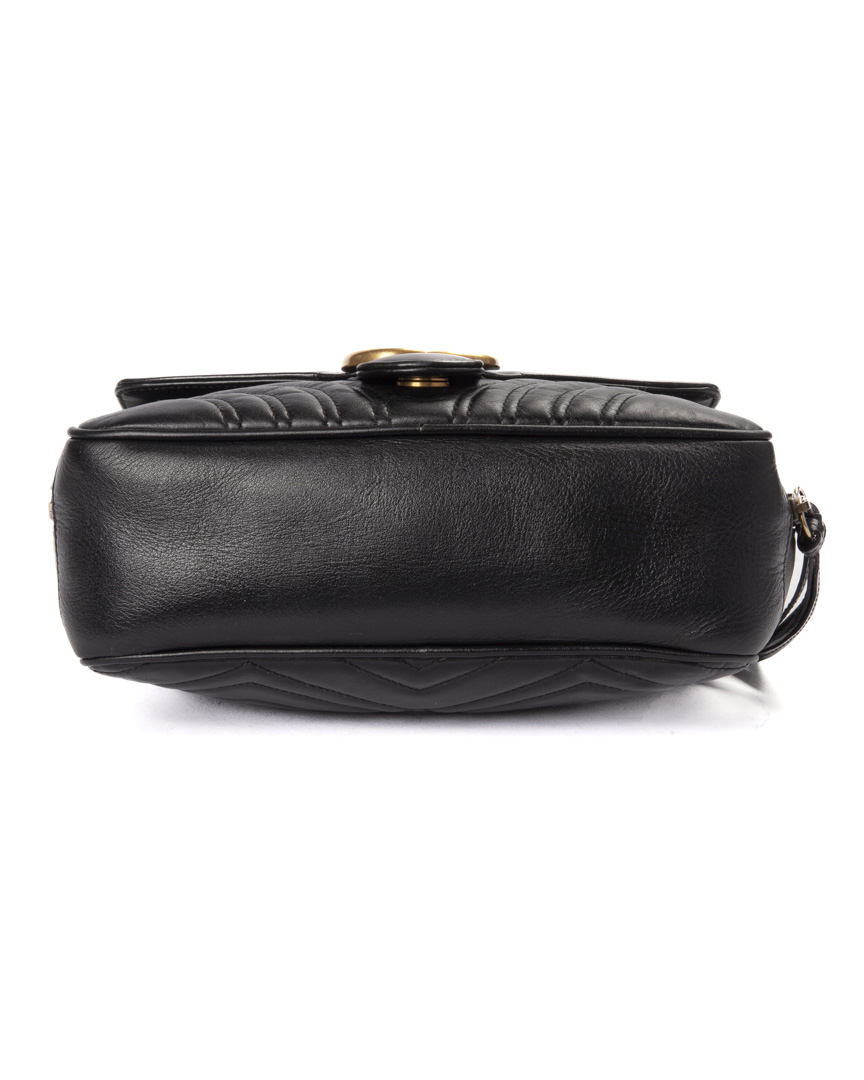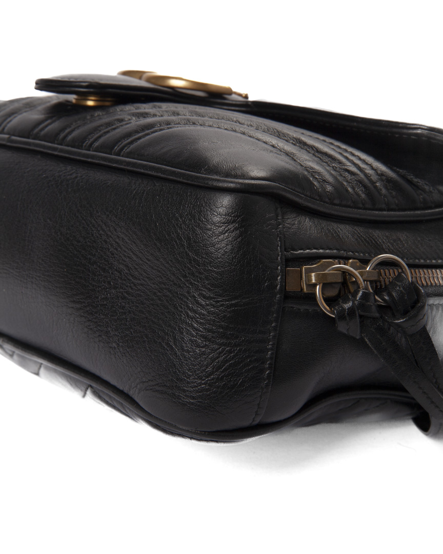 Borsa firmata Gucci, linea marmont, modello Top Handle Square nella misura medium, realizzata in pelle nera con hardware dorato. Dotata di una chiusura semicircolare a zip con doppio cursore, internamente rivestita in tessuto scamosciato beige con comode tasche, la borsa è abbastanza capiente. Munita di un manico e di una tracolla rimovibile in tessuto per una comoda portata a spalla o a mano. Completa di una tasca sulla parte frontale con chiusura ad incastro e arricchita dal classico logo del brand "GG" in metallo. L'articolo si presenta in ottime condizioni, con segni di usura sulle parti metalliche.