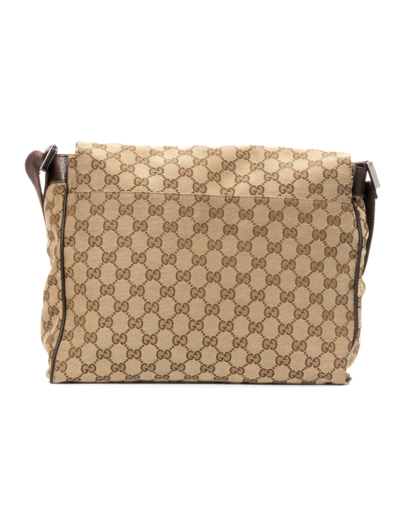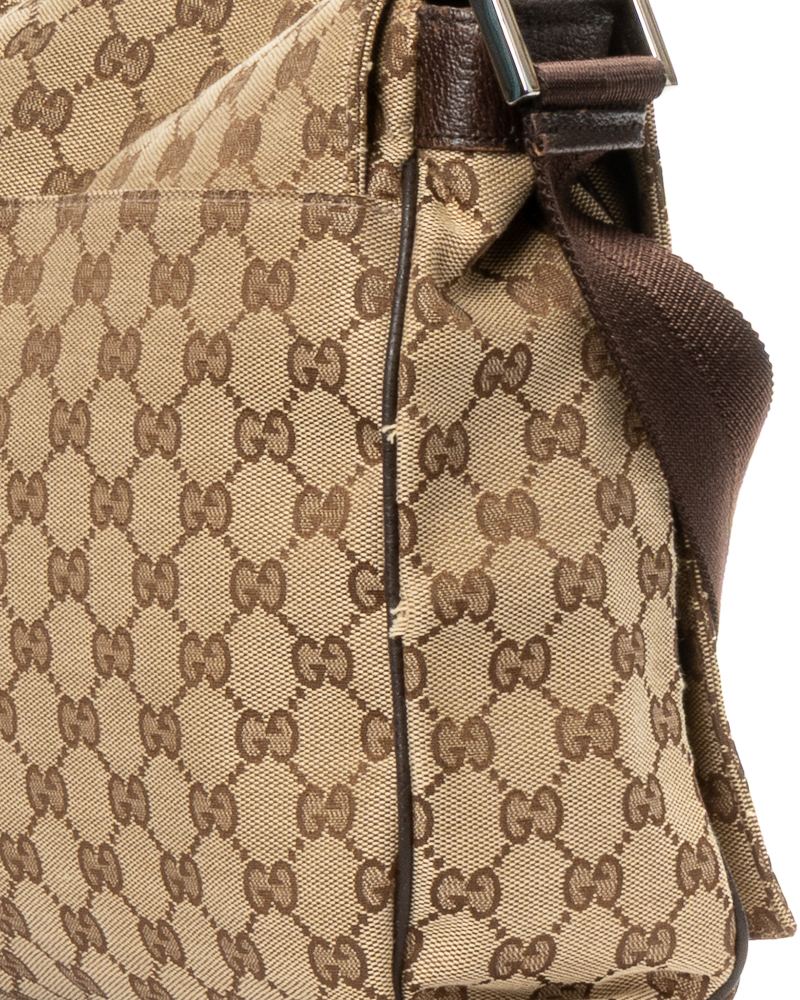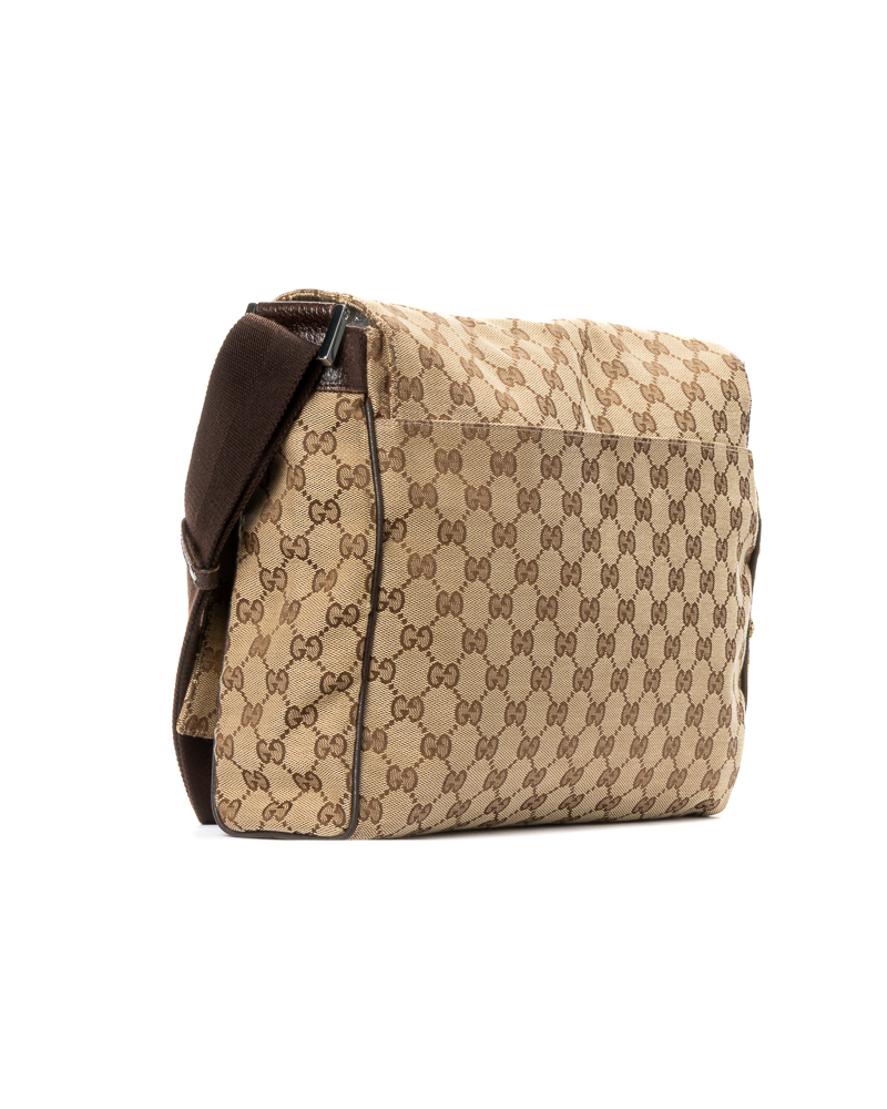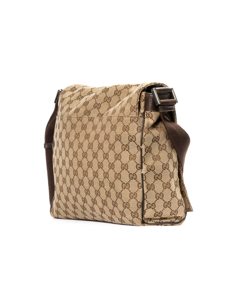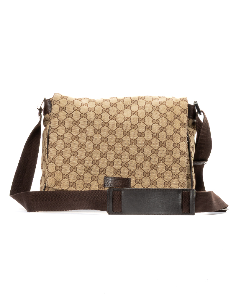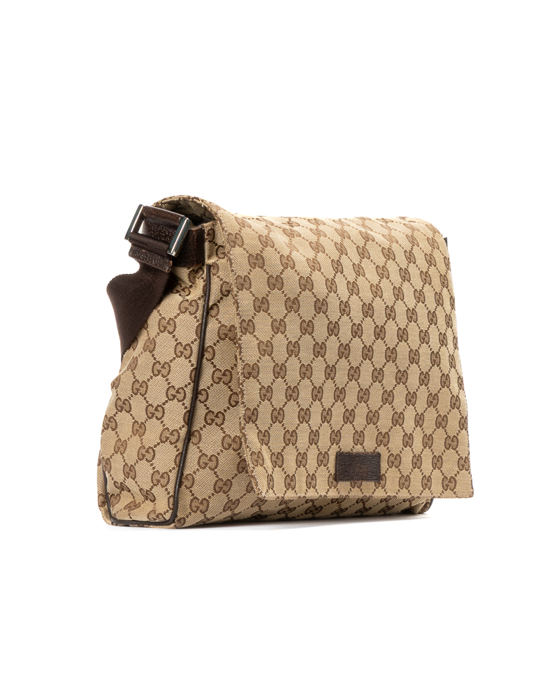 Borsa firmata Gucci, modello messanger nella misura small, realizzata in tela nella classica fantasia GG Supreme con inserti in pelle marrone con hardware argento. Dotata di una patta con chiusura calamitata, internamente rivestita in tela marrone con comode tasche, la borsa è abbastanza capiente. Munita di una tracolla in tessuto regolabile, per una comoda portata a spalla o a tracolla. L'articolo si presenta in buone condizioni, con piccole usure sulla pelle.