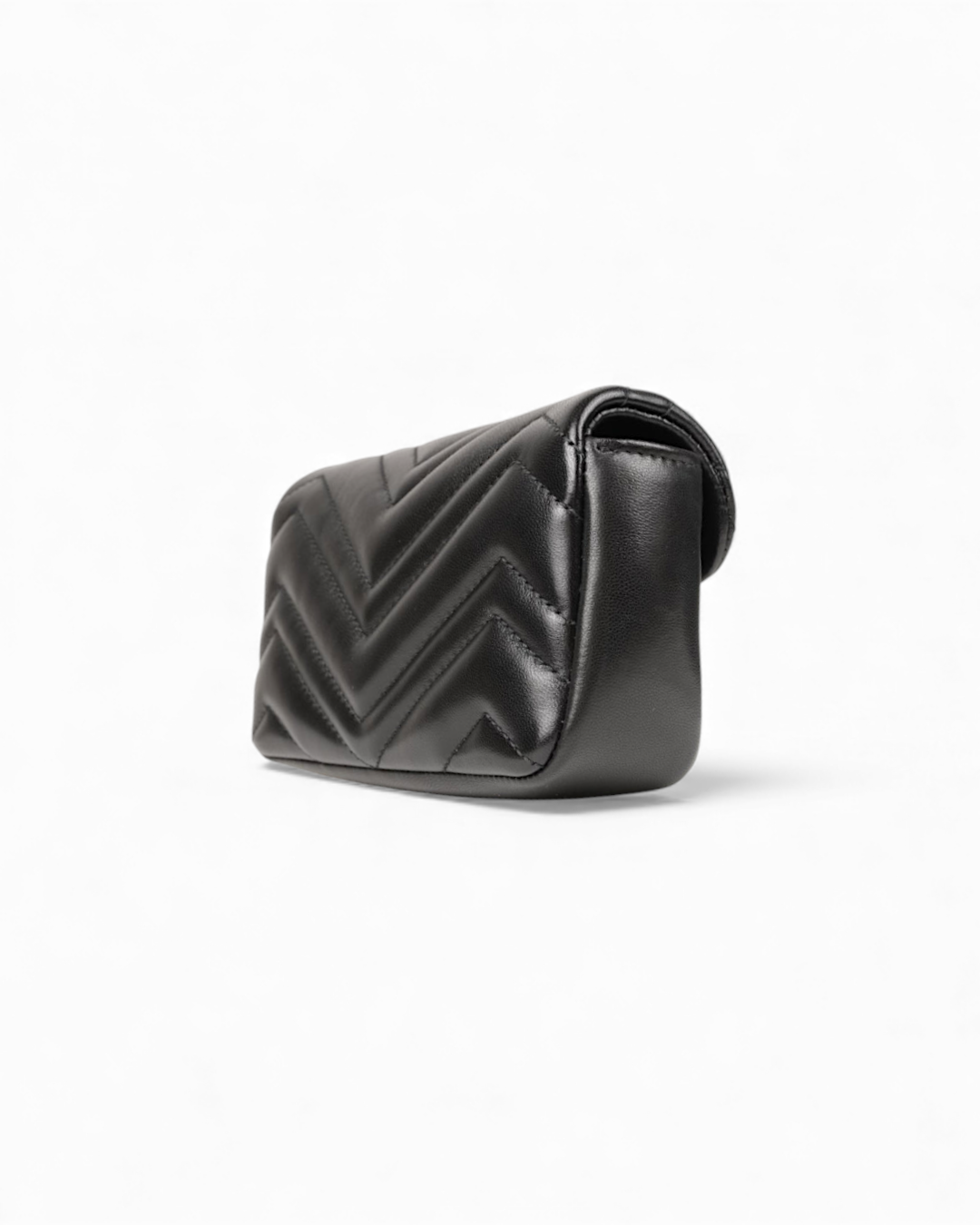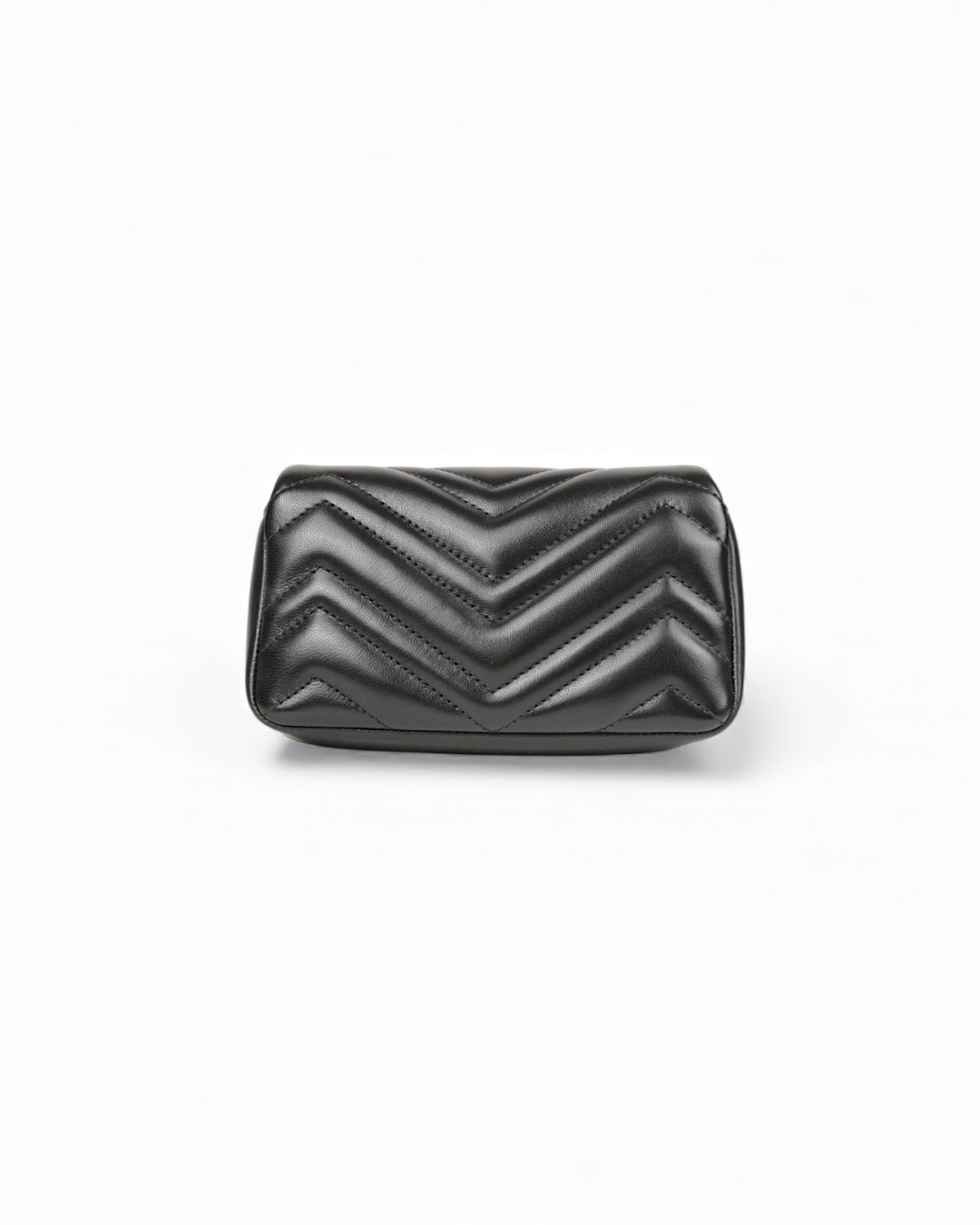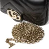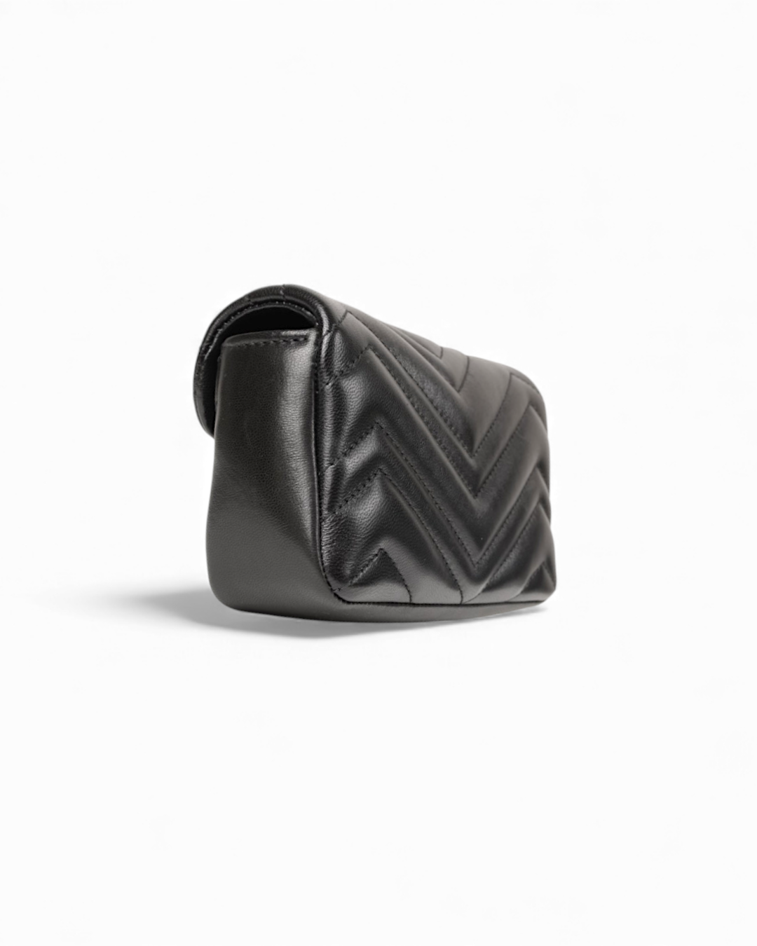 Borsa firmata Gucci, linea Marmont, misura 16, realizzata in pelle puff nera con cuciture Matelassè e hardware palladio. Dotata di una patta con classico logo del brand “GG” in metallo e chiusura calamitata, internamente rivestita tessuto bordeaux, la borsa è capiente per l’essenziale. Munita di una tracolla rimovibile in catena, per una comoda portata a spalla o a mano come pochette. L’articolo si presenta in condizioni pari al nuovo.